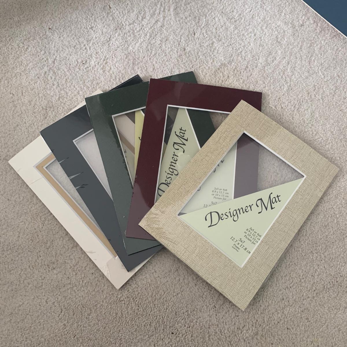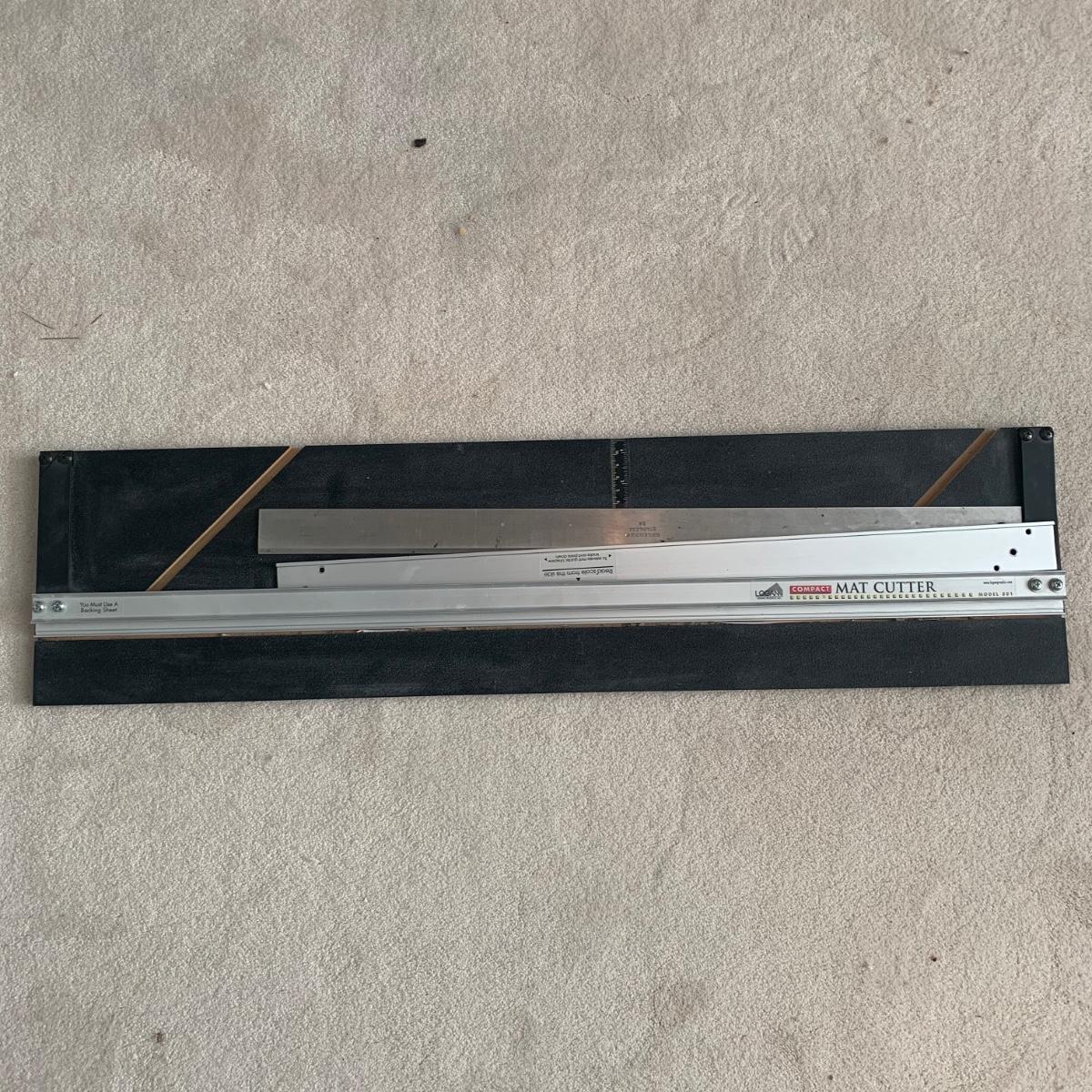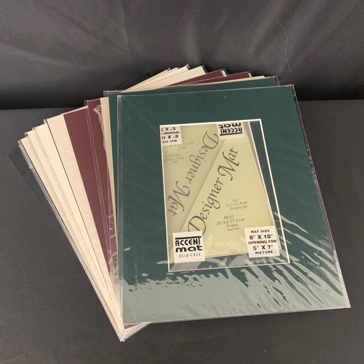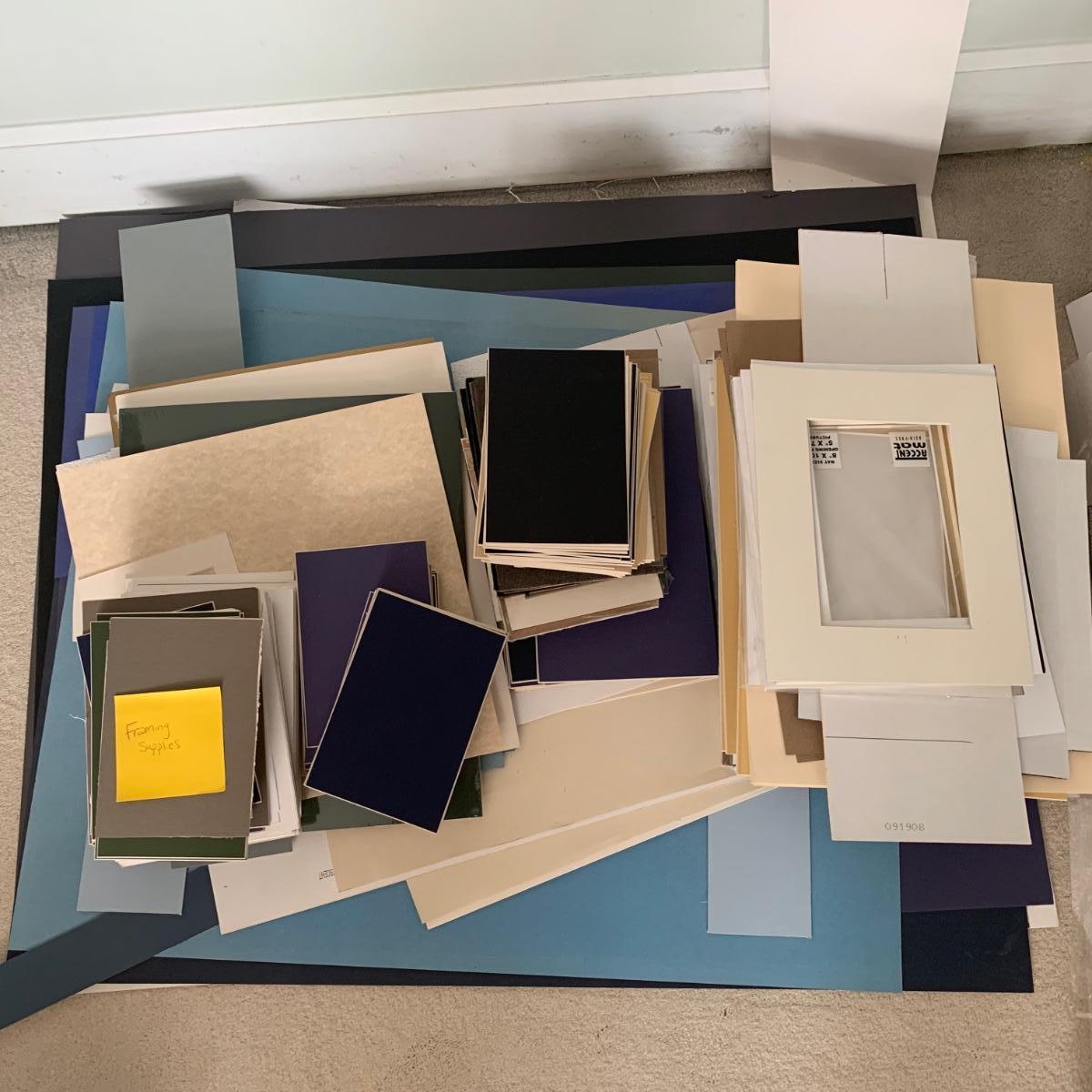 Large lot consisting of Logan compact Mat Cutter, measuring devices, framing hardware, various sizes and colors of accent mats (new and used), point driver, Logan bevel cutter, and more. Accent mat sizes range from, 5”L x 7”H to 11”L x 14”H. There are multiple pieces of 32”L x 40”H uncut mat material and a variety of mat scraps.