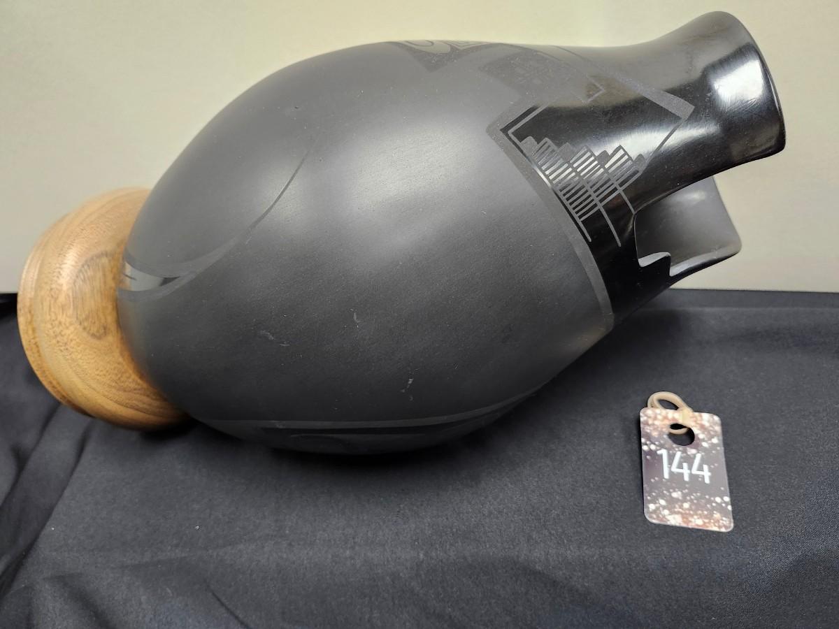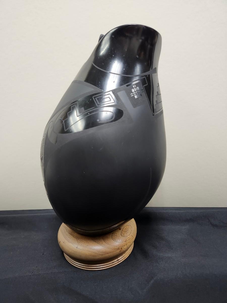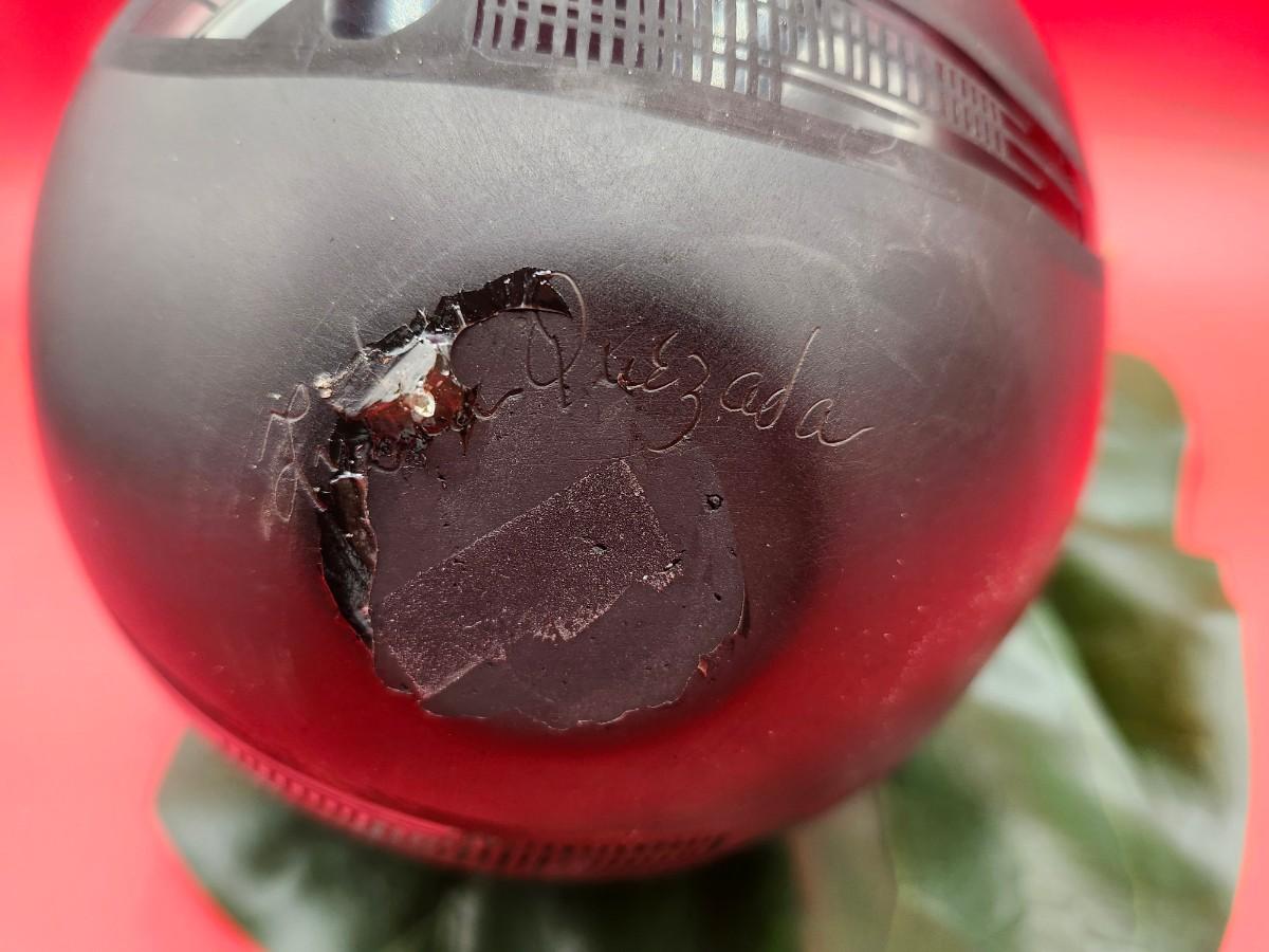 Lydia Quezada signed piece. A previous owner glued this pottery to a wooden base, which we have removed. There is glue residue on the bottom of the pottery, we will let the new owner decide what to do about that. It has a chip and a scuff mark.