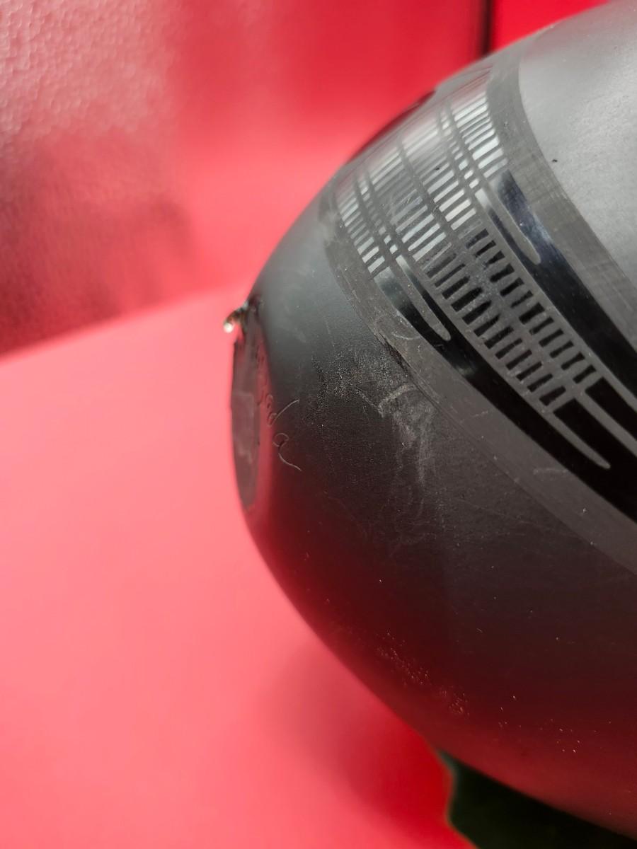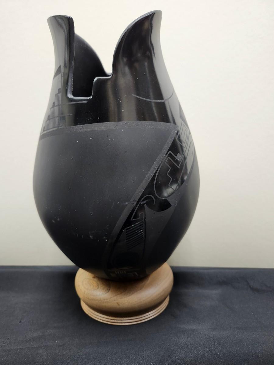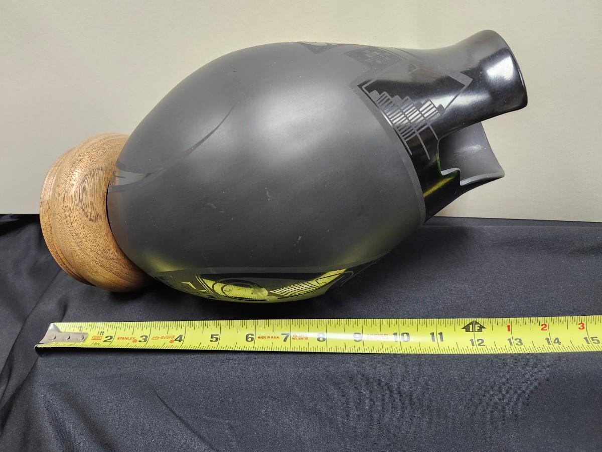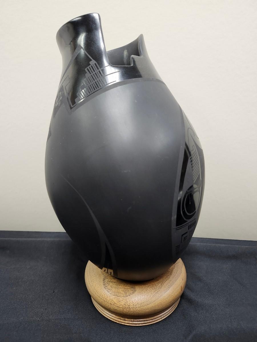 Lydia Quezada signed piece. A previous owner glued this pottery to a wooden base, which we have removed. There is glue residue on the bottom of the pottery, we will let the new owner decide what to do about that. It has a chip and a scuff mark.