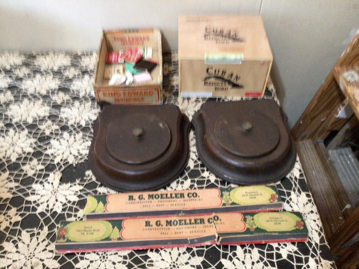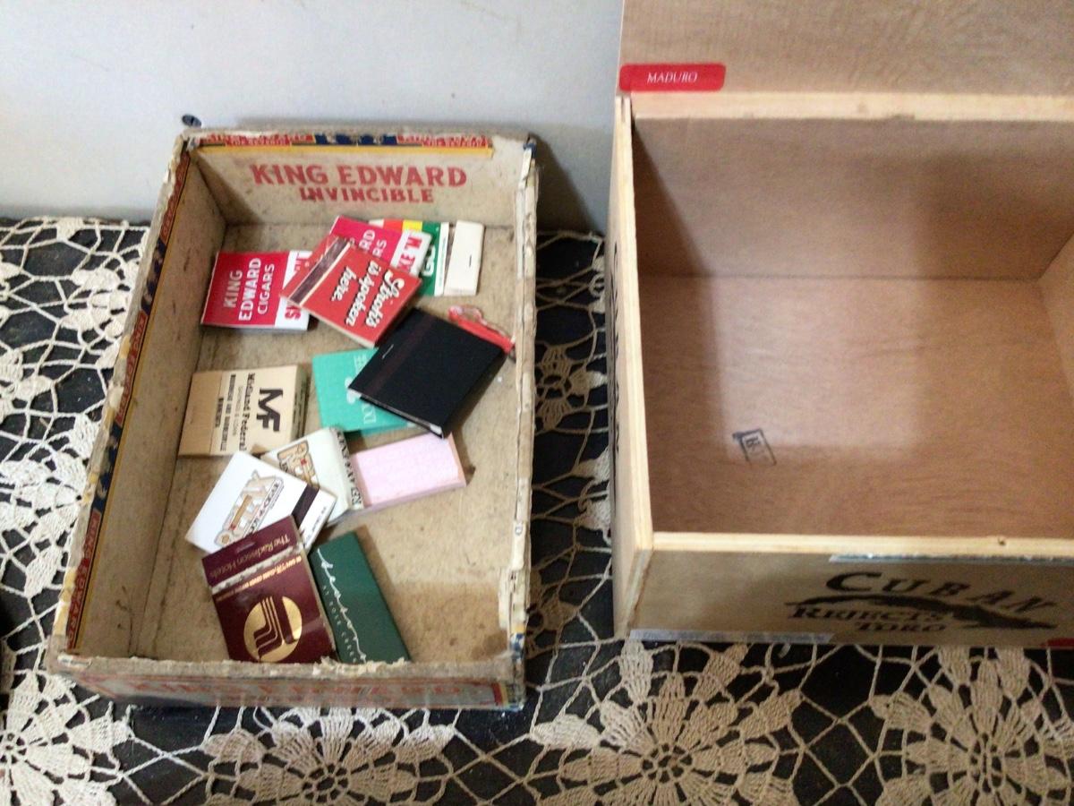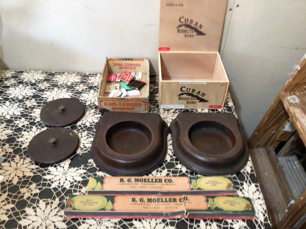 You get these great large match books very unique. Carbondale cigar box with reg match books. Cuban wood cigar box and two neat wood covered. Ashtray holders (ashtray not included).