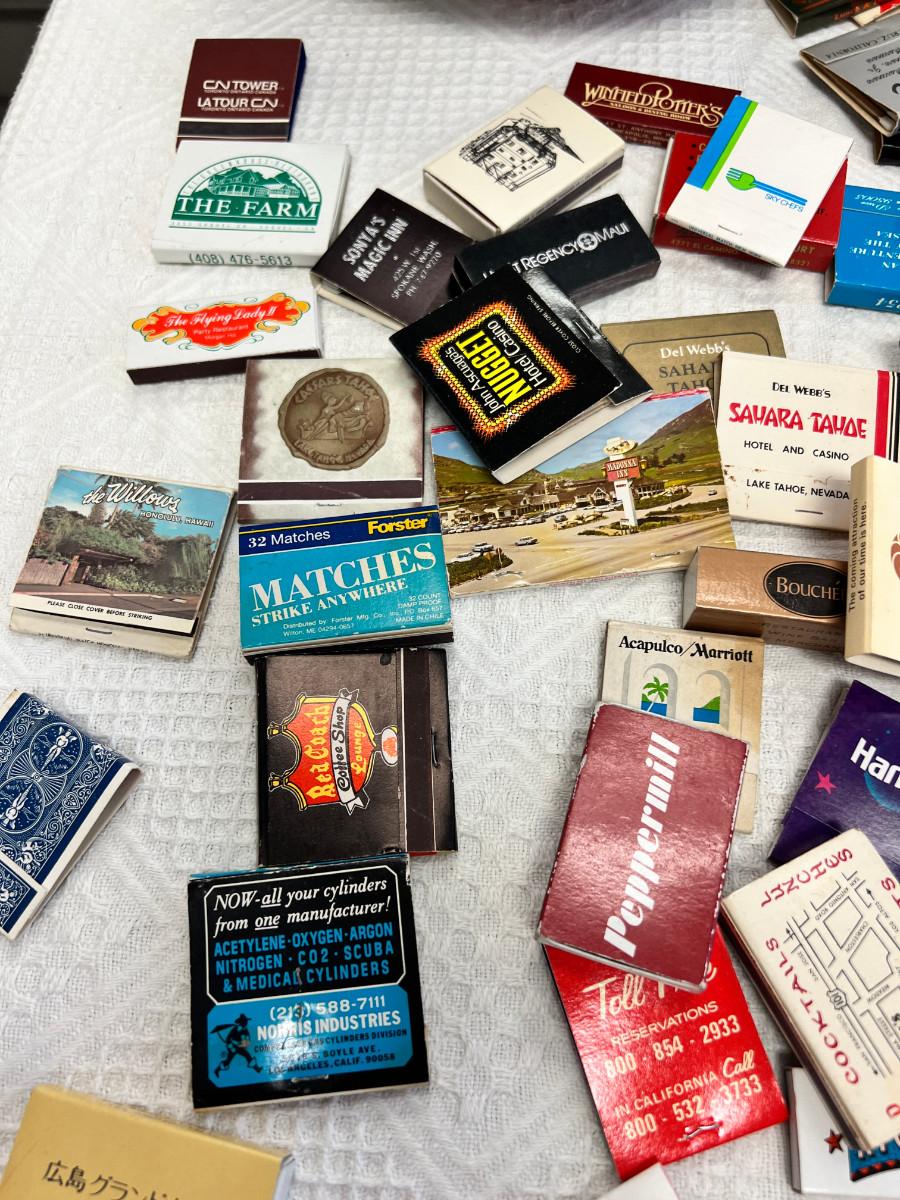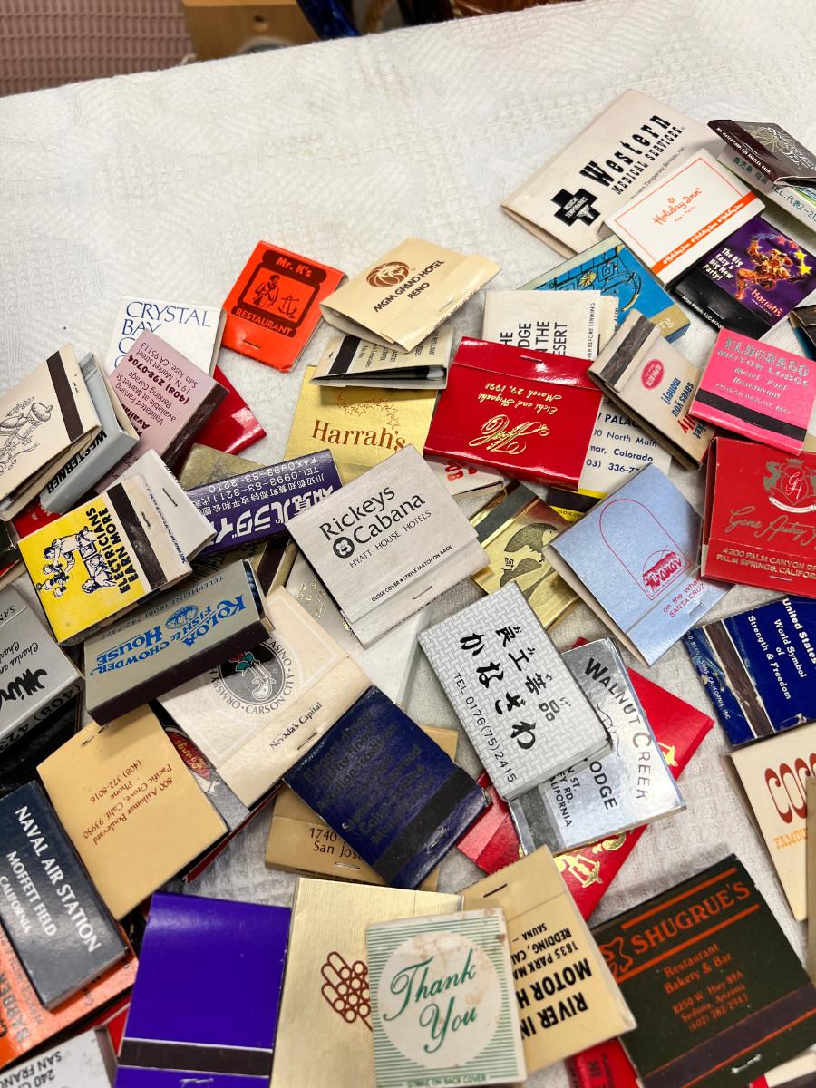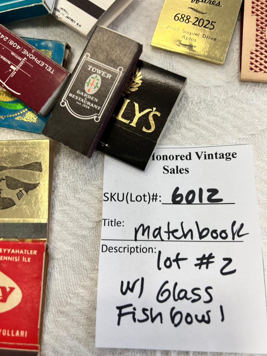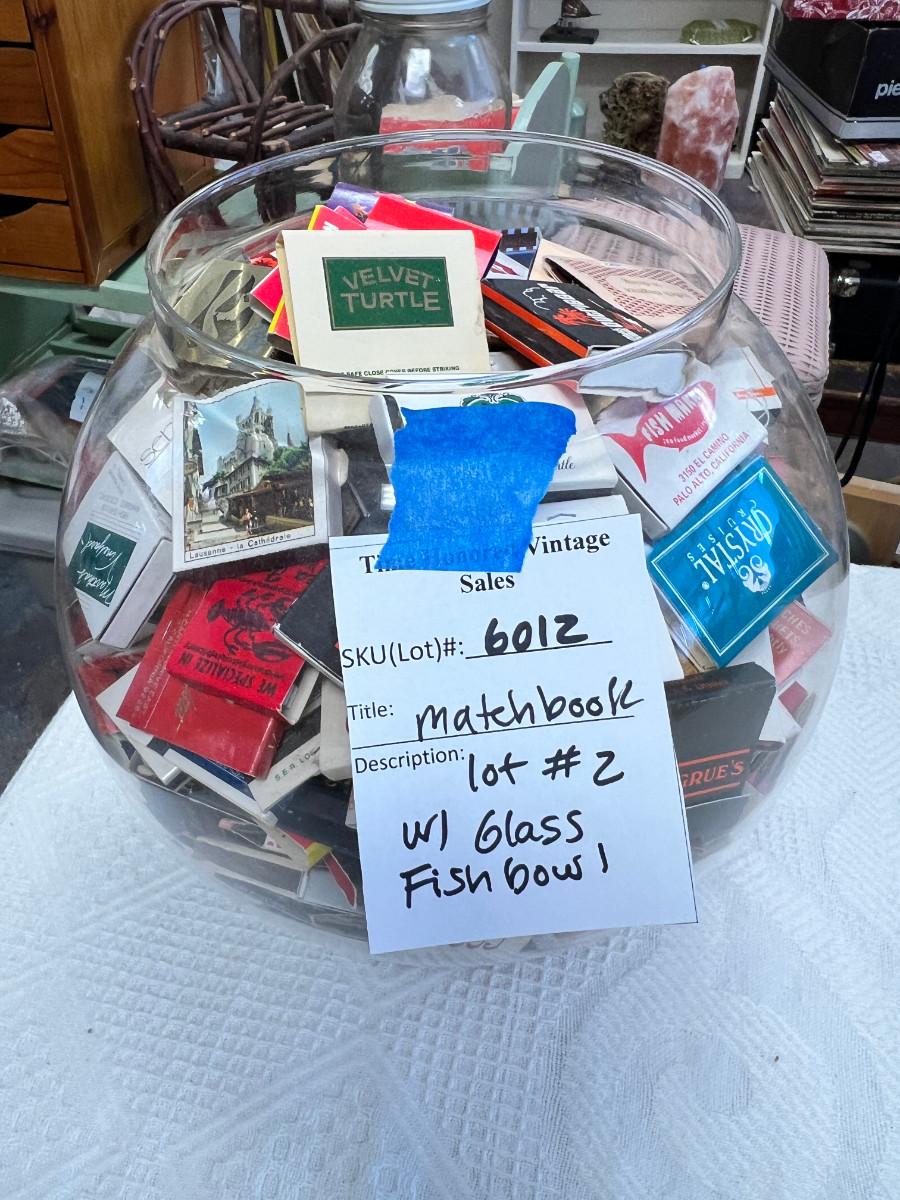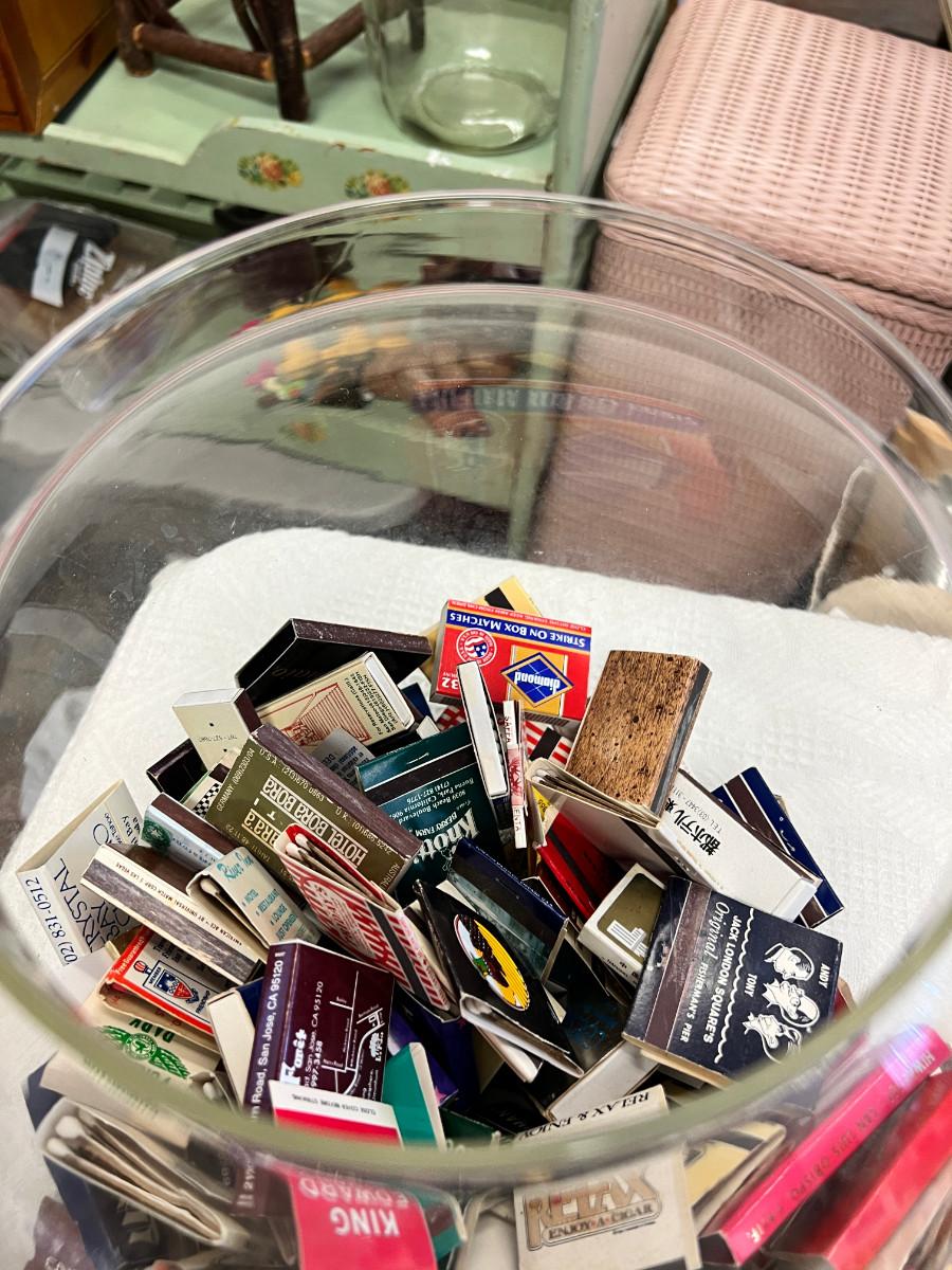 Shipping available with or without the bowl. Large bowl suitable to all kinds of display, plants, fish and full of my match collection. un-struck, many local San Jose area mixed with matches from vintage travel, restaurants.
