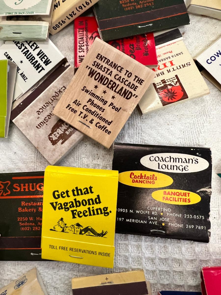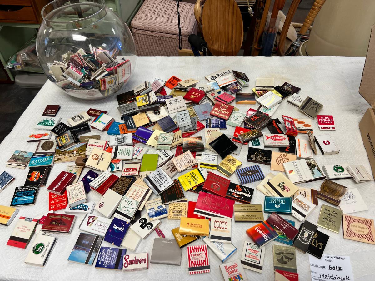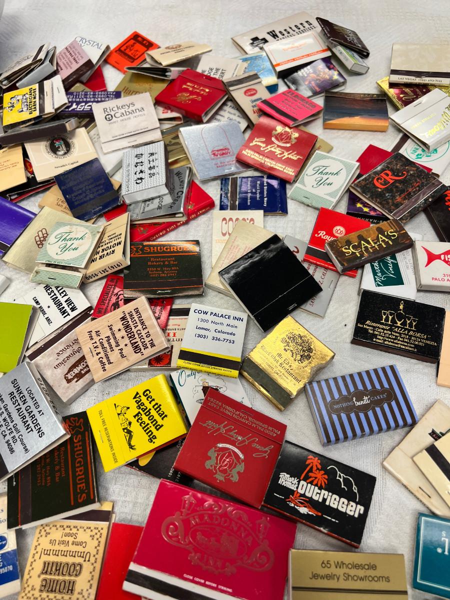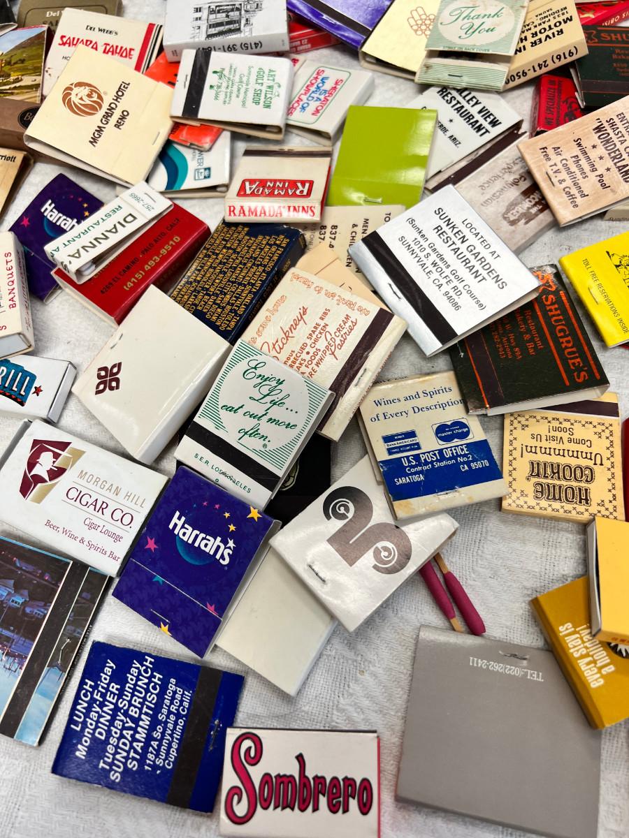 Shipping available with or without the bowl. Large bowl suitable to all kinds of display, plants, fish and full of my match collection. un-struck, many local San Jose area mixed with matches from vintage travel, restaurants.