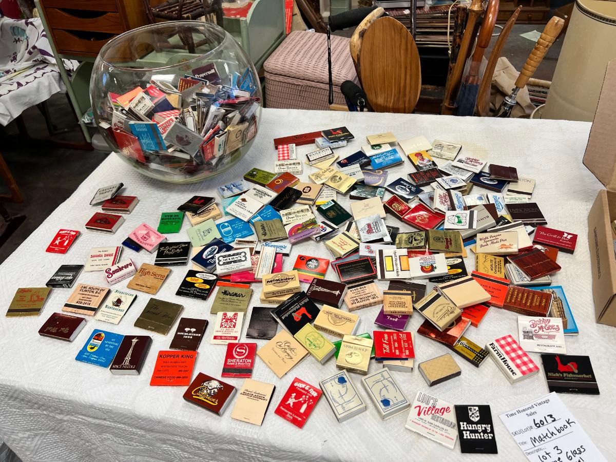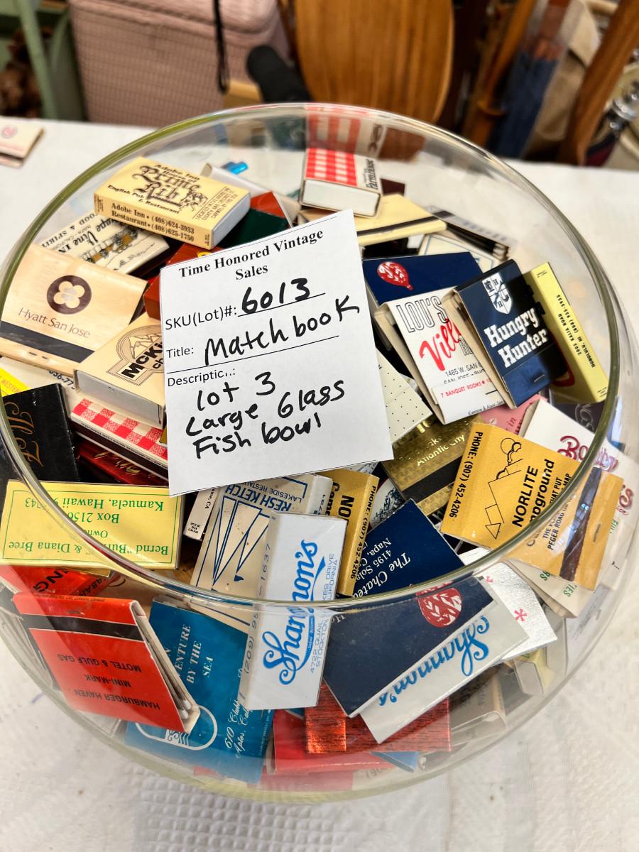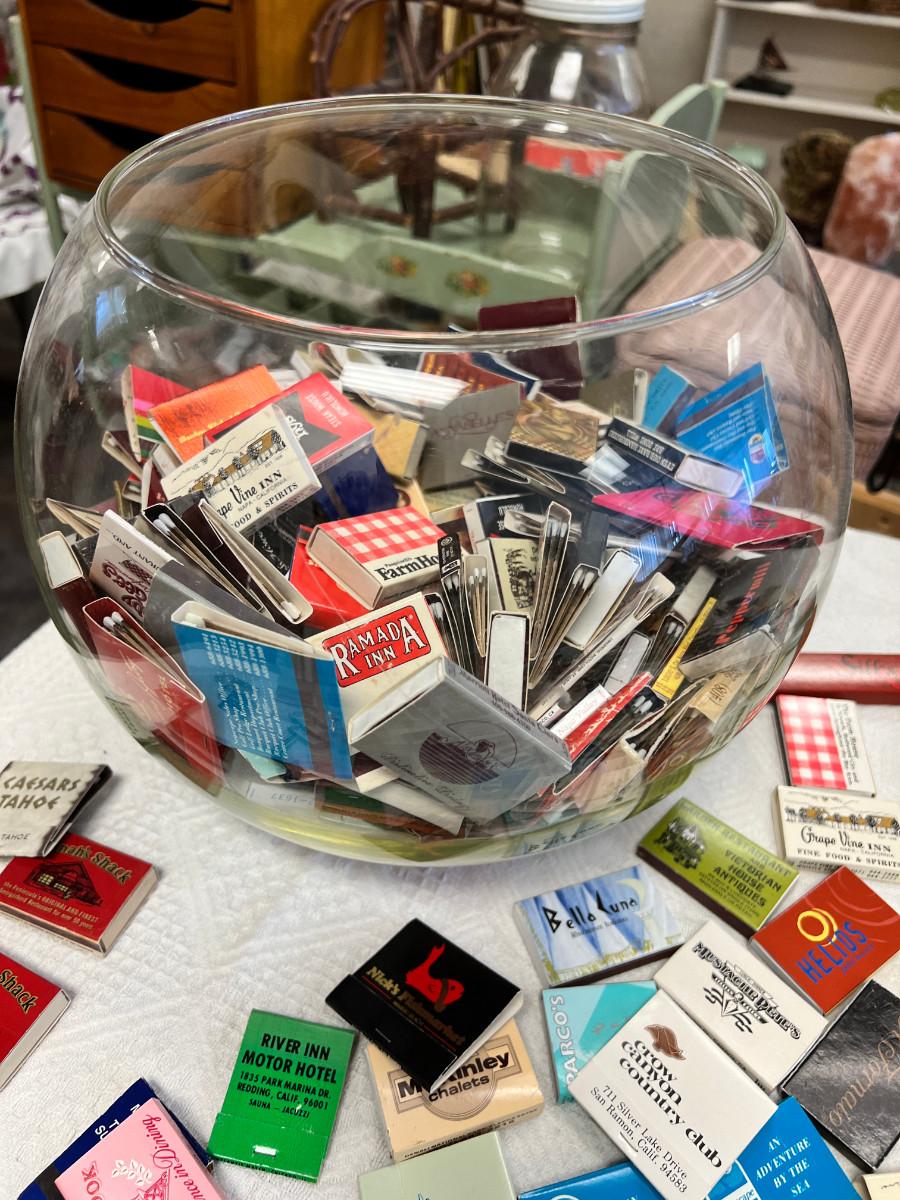 Shipping available with or without the bowl. Large bowl suitable to all kinds of display, plants, fish and full of my match collection. un-struck, many local San Jose area mixed with matches from vintage travel, restaurants.