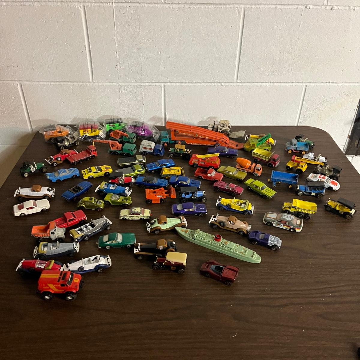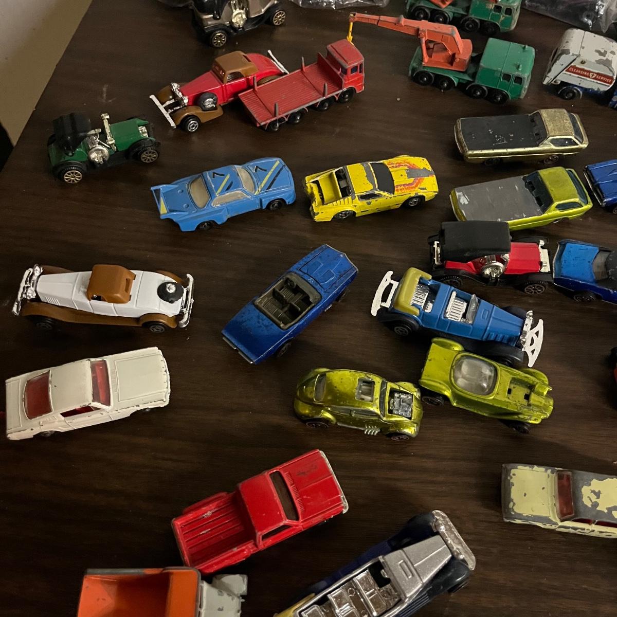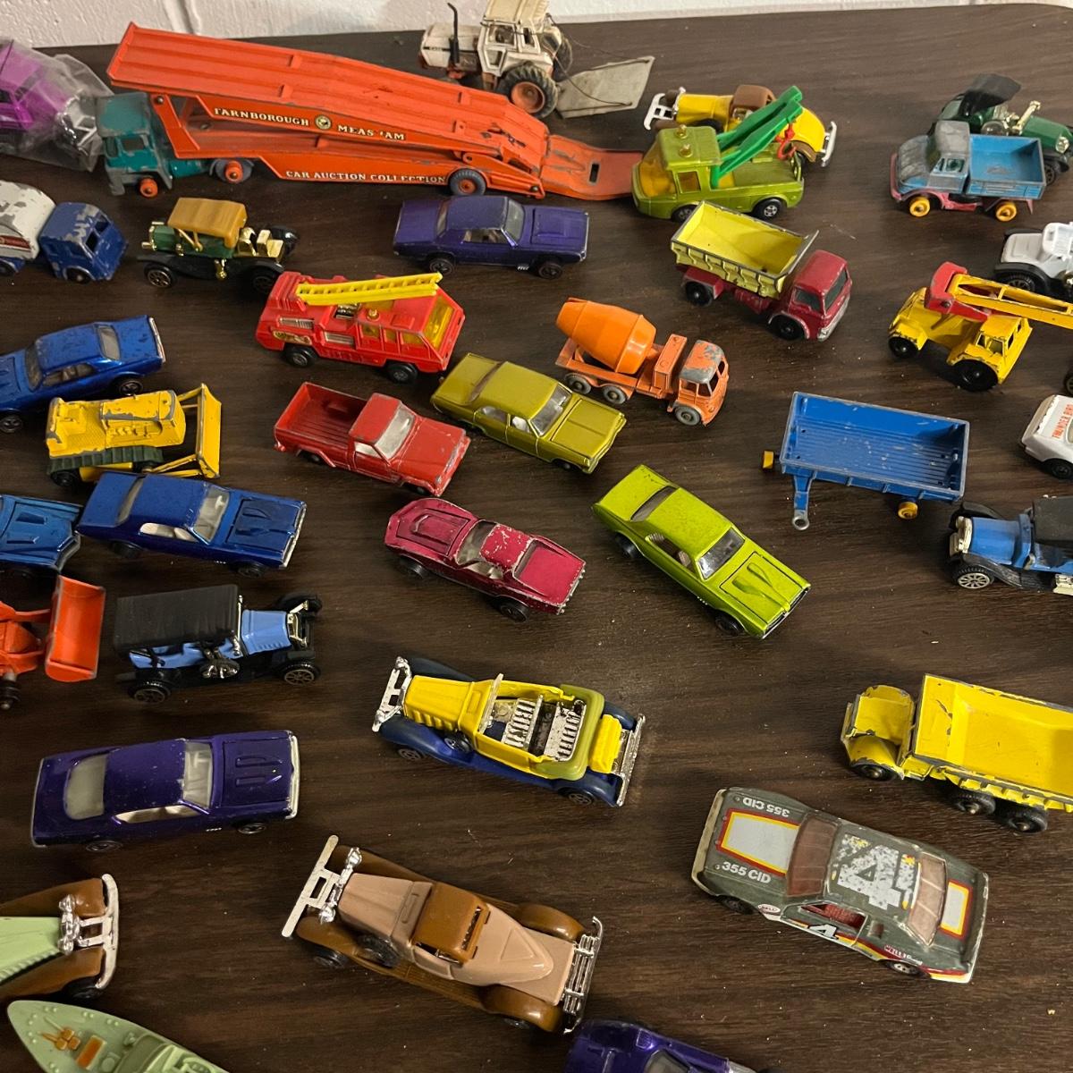 Lot includes a large collection of Matchbox cars, Lesney cars and some marked made in China. Cars have been well loved and have scratches and some are missing wheels.