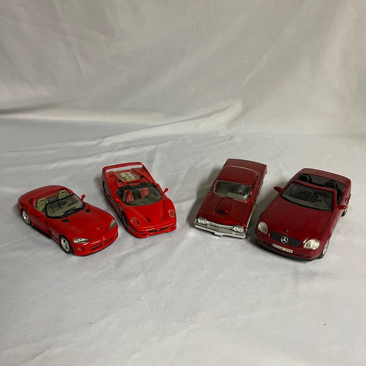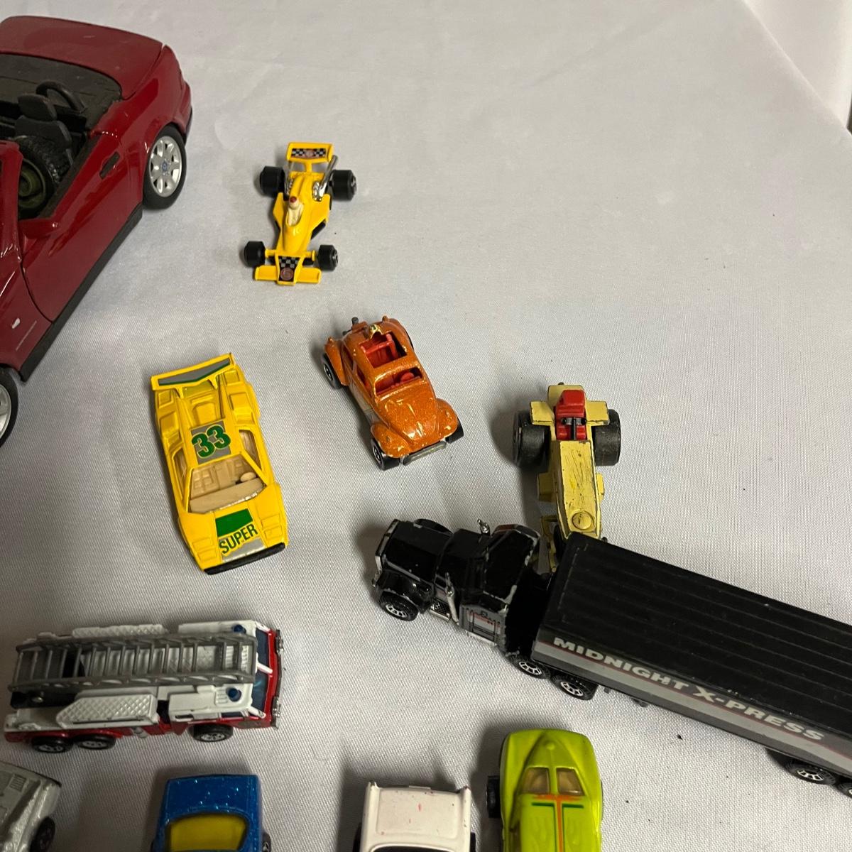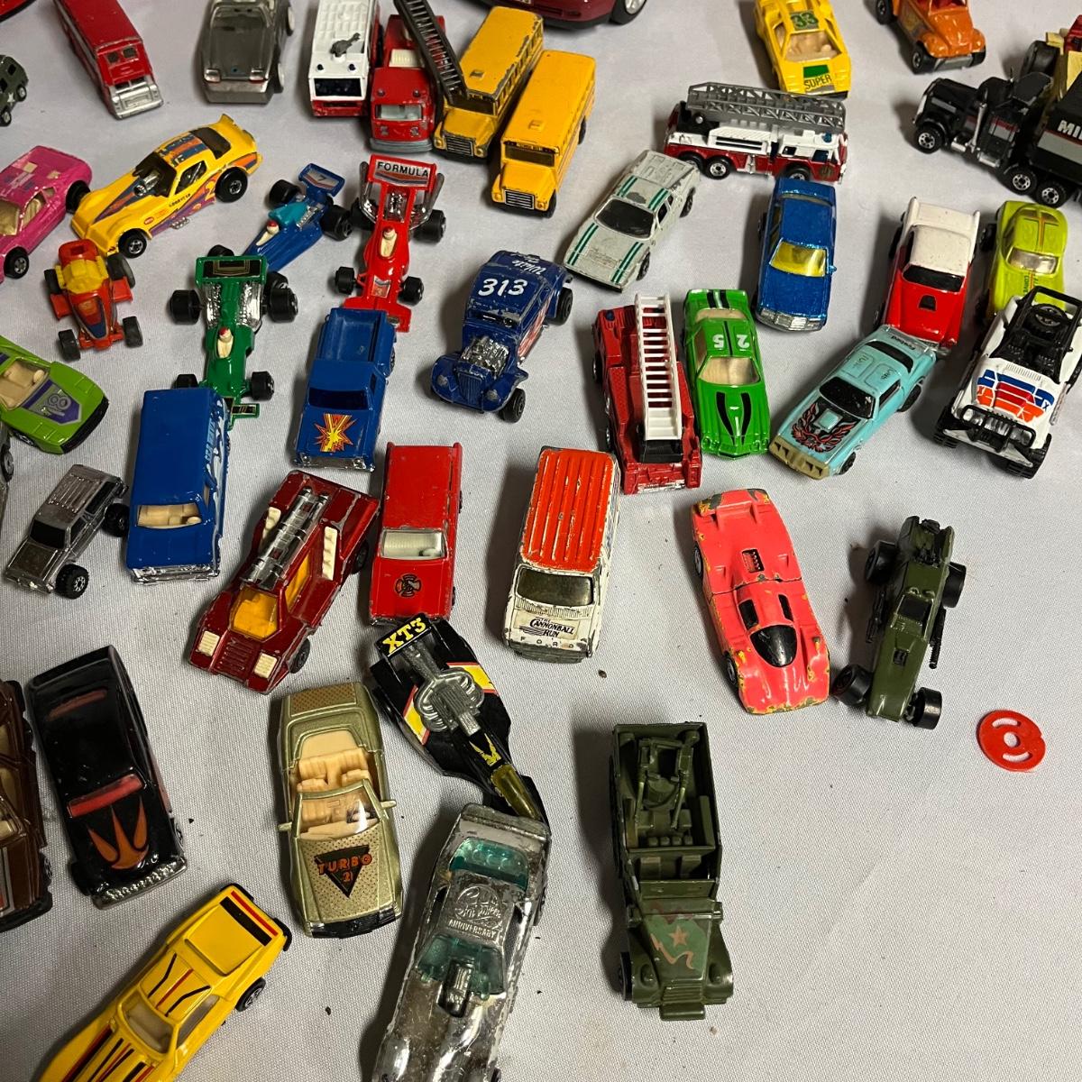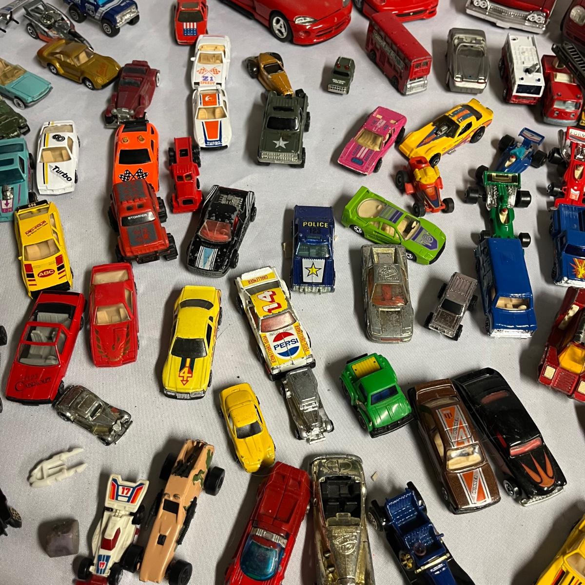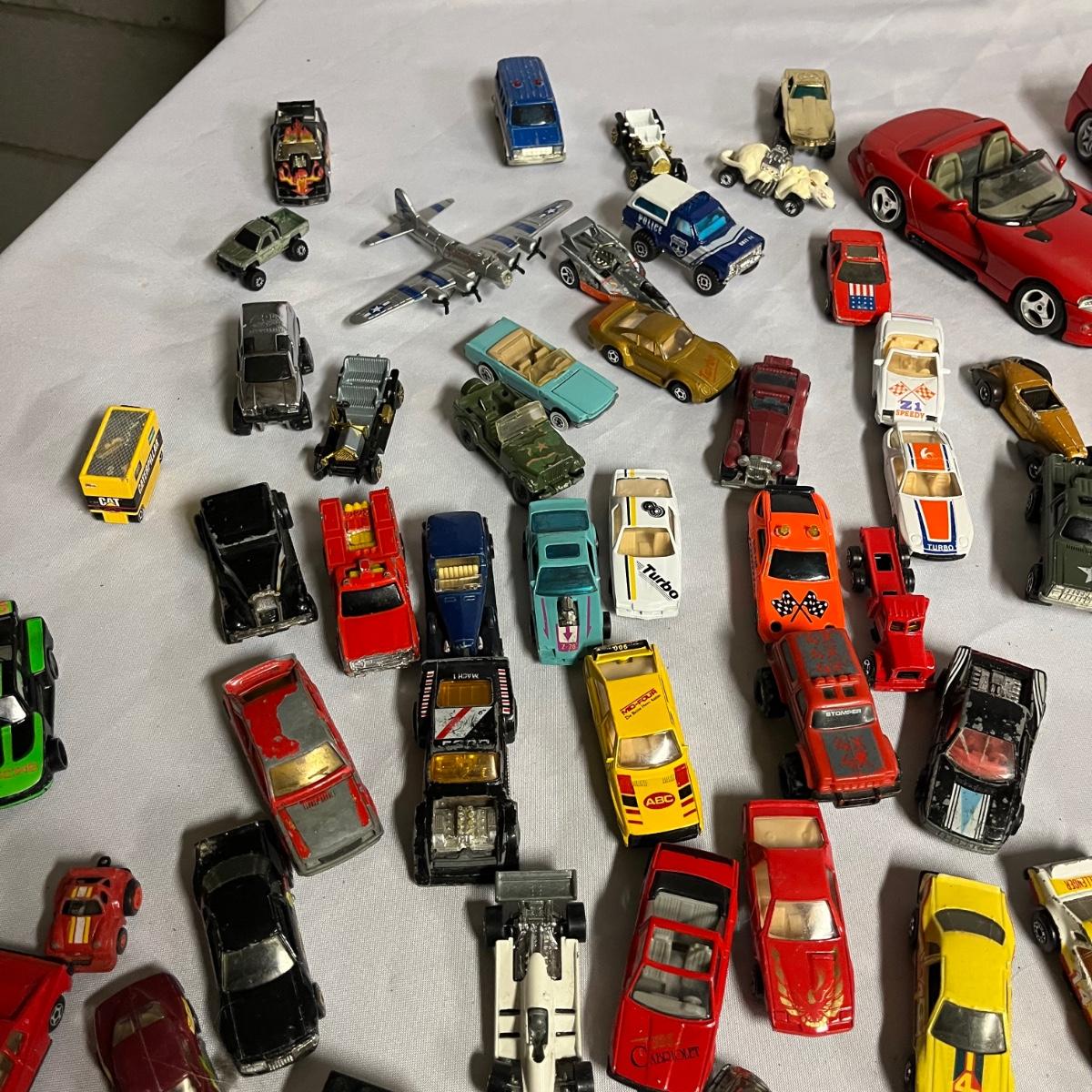 Lot includes a large selection of Matchbox, Hot Wheels, Car Champs, Majorette and a 1/24 Viper, Ferrari, Mercedes 1/18 and a 62 Chevy. Most cars are metal with some plastic. Collection has been well loved and has scratches and scrapes.