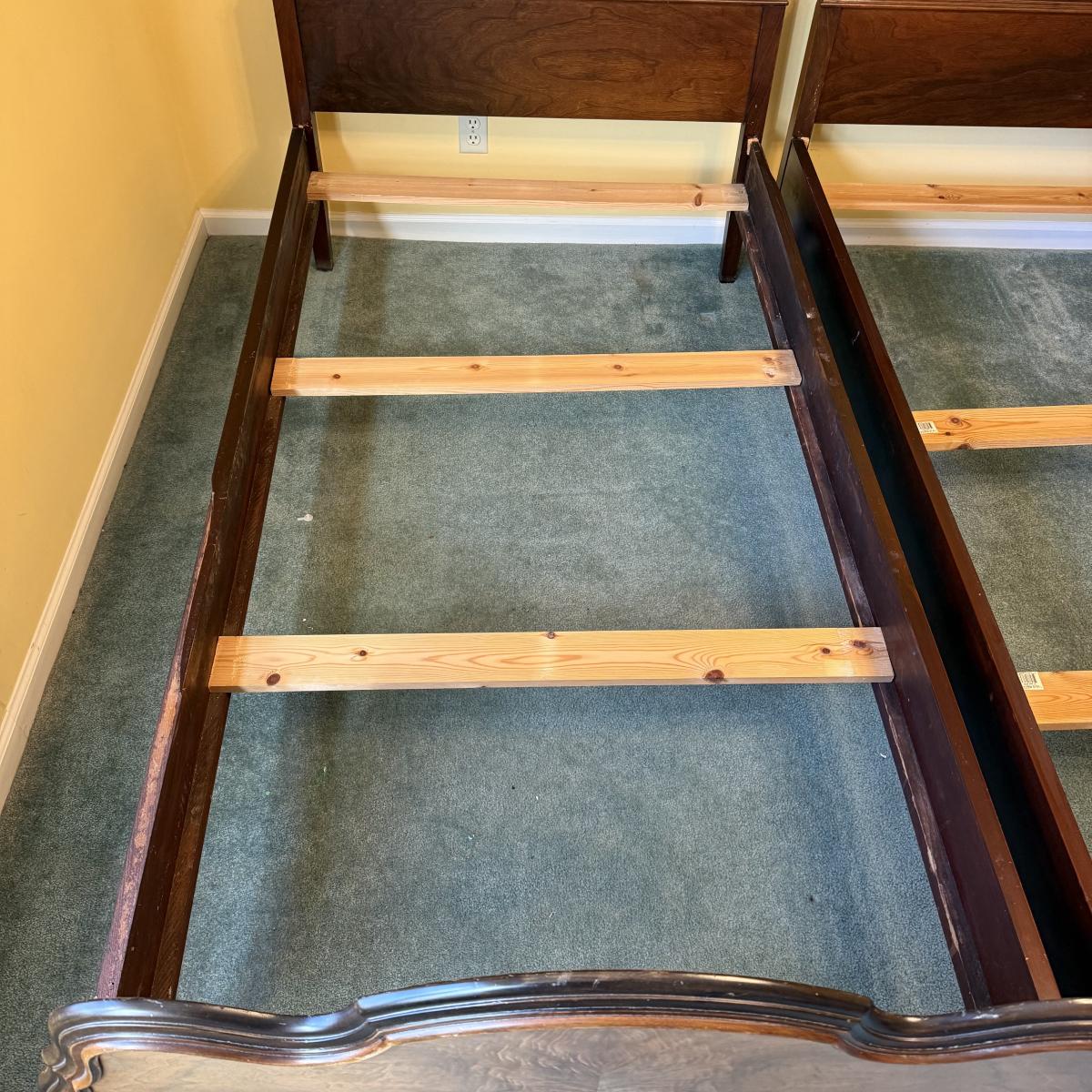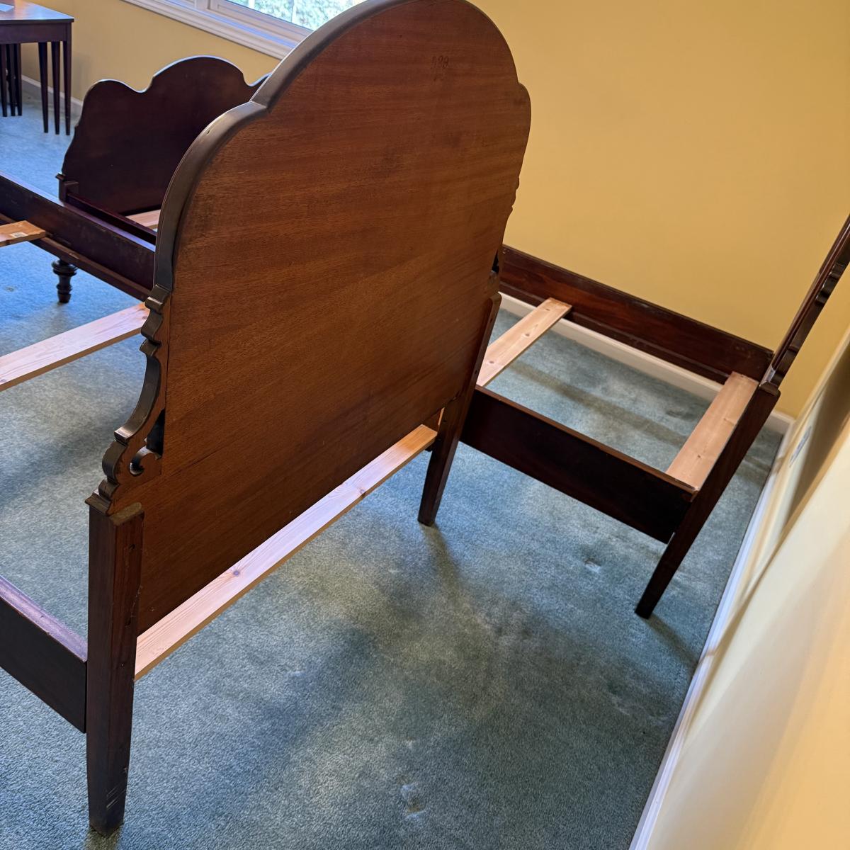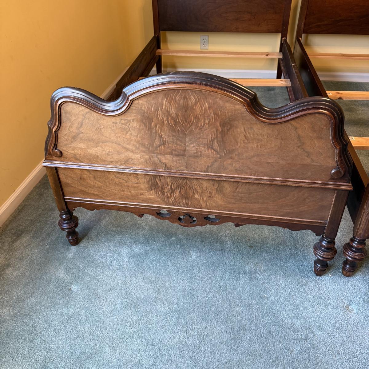 Two stunning twin beds that appear to be antiques. Each includes a headboard, footboard, two side rails and four homemade bed slats. Beds are in amazing condition for their age, some blemishes are shown in photos including chipped veneer on the foot boards and side rail. There are also homemade wedges where the headboards and side rails meet. A Phillips head screwdriver is needed for buyer to disassemble slats from side rails. Headboard and footboard are not likely originally from the same bed as they have minor inconsistencies in design. See images. Local pick up only.