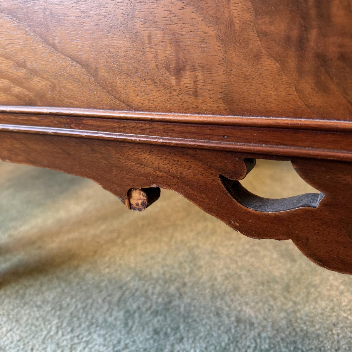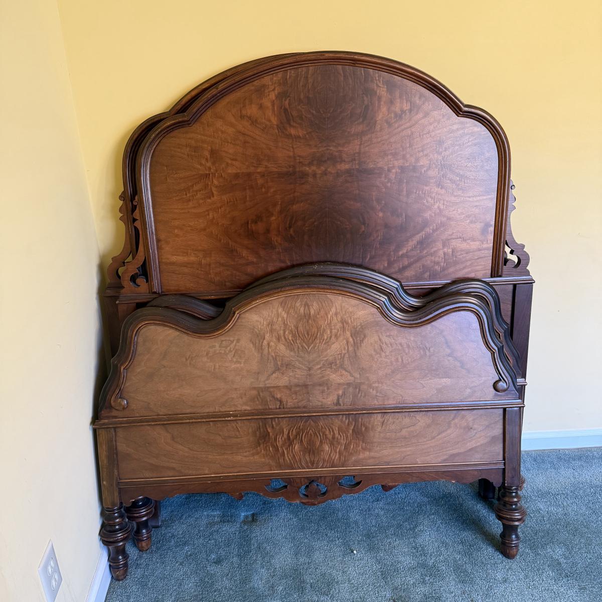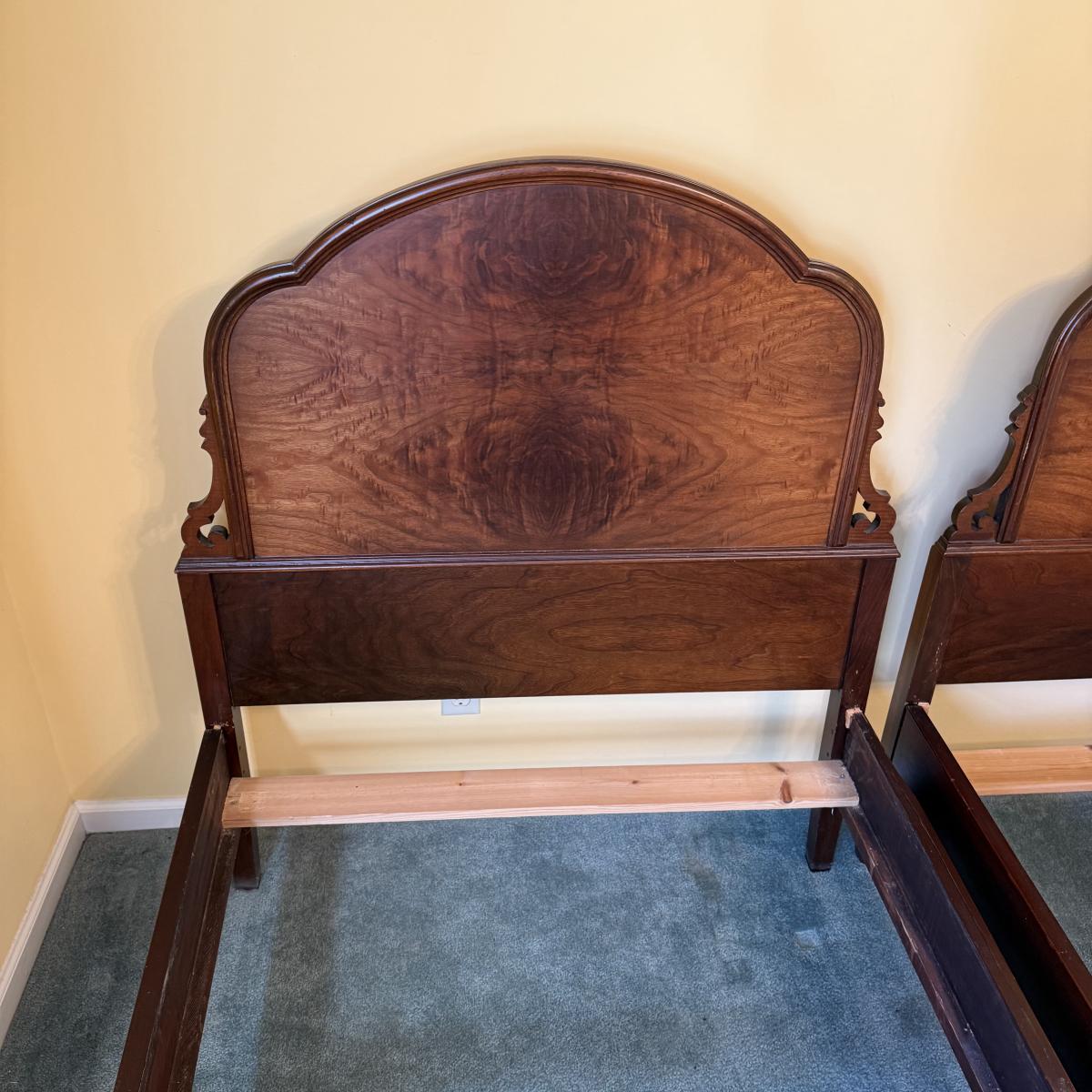 Two stunning twin beds that appear to be antiques. Each includes a headboard, footboard, two side rails and four homemade bed slats. Beds are in amazing condition for their age, some blemishes are shown in photos including chipped veneer on the foot boards and side rail. There are also homemade wedges where the headboards and side rails meet. A Phillips head screwdriver is needed for buyer to disassemble slats from side rails. Headboard and footboard are not likely originally from the same bed as they have minor inconsistencies in design. See images. Local pick up only.