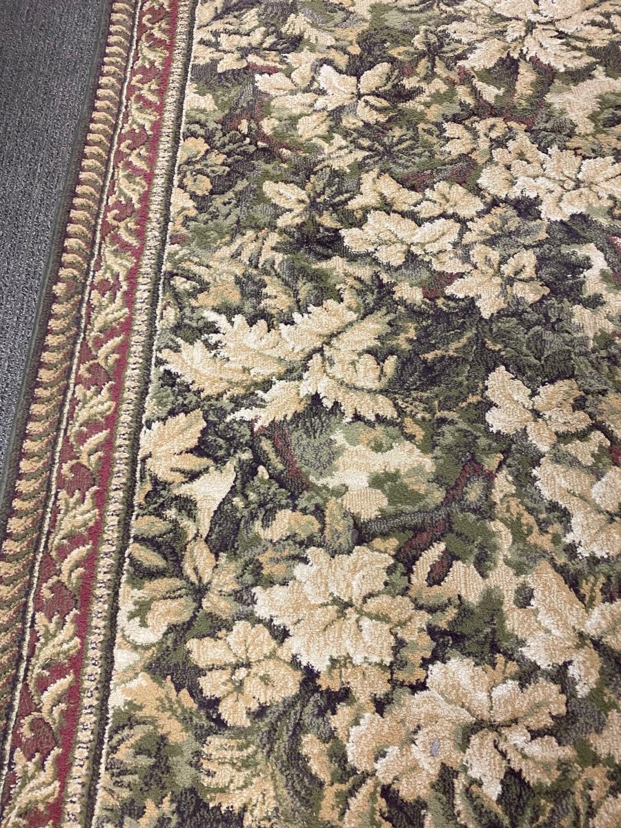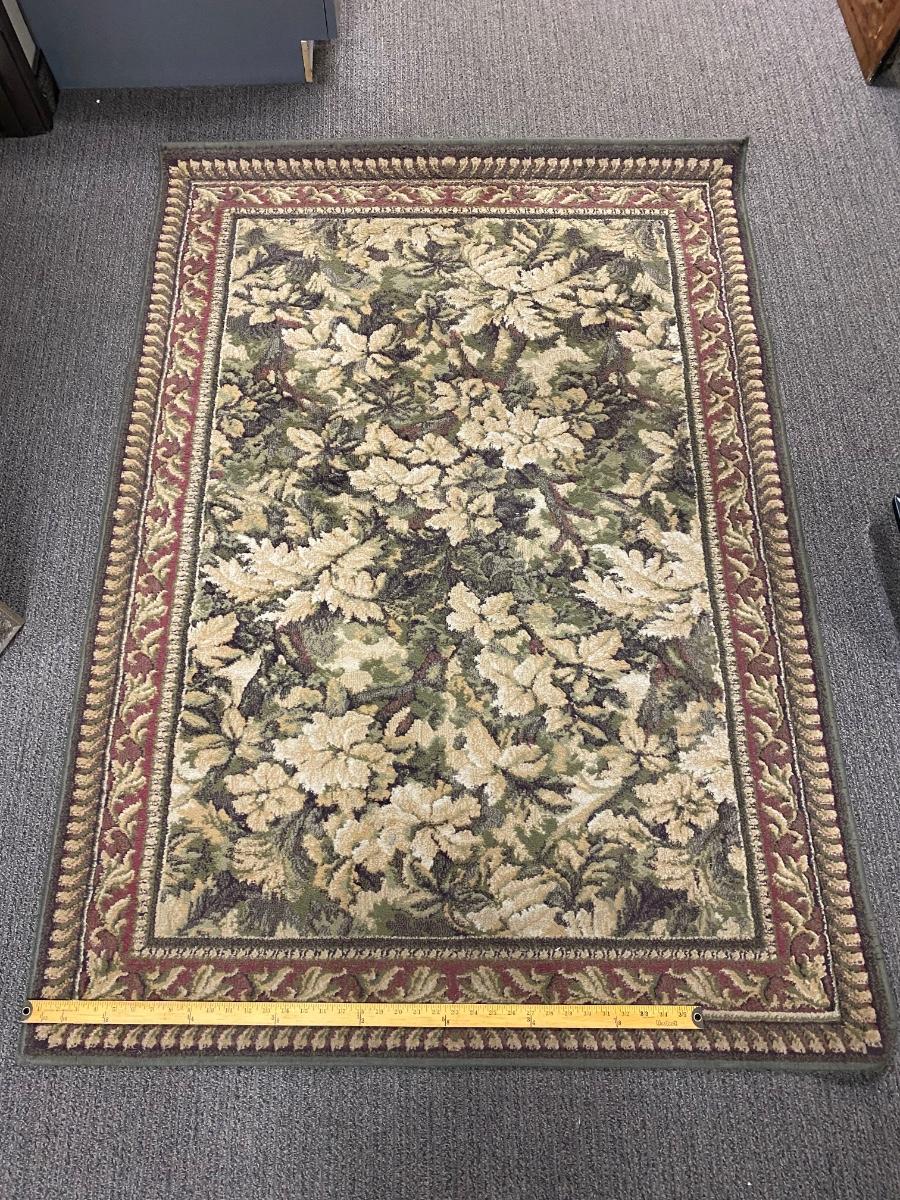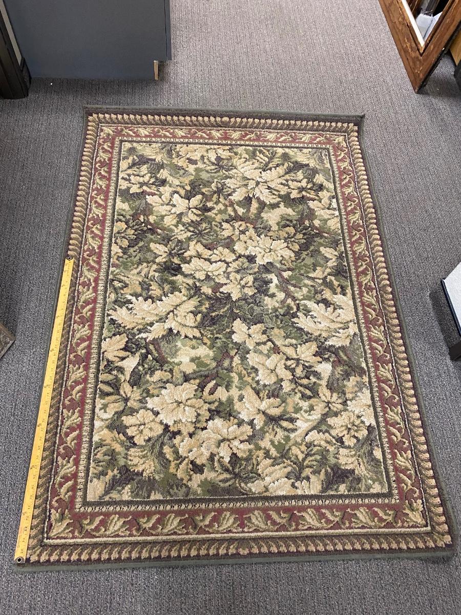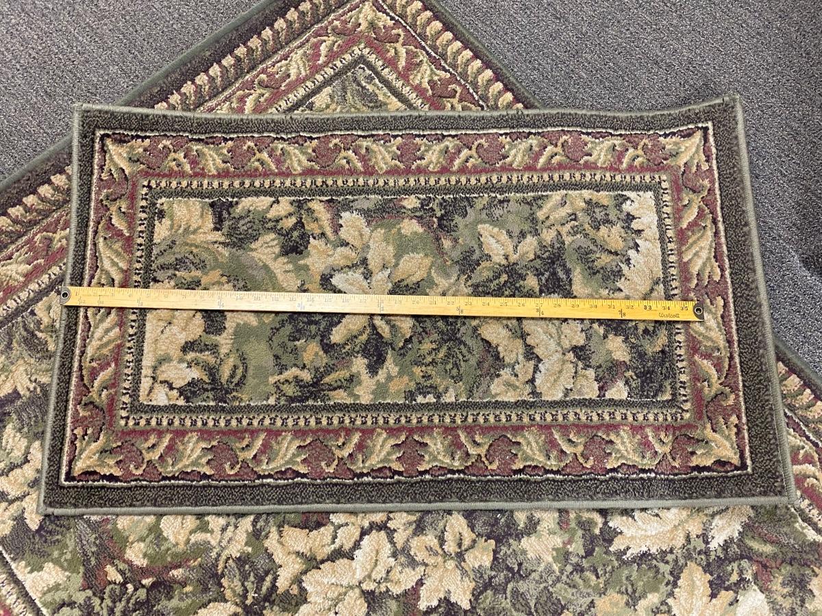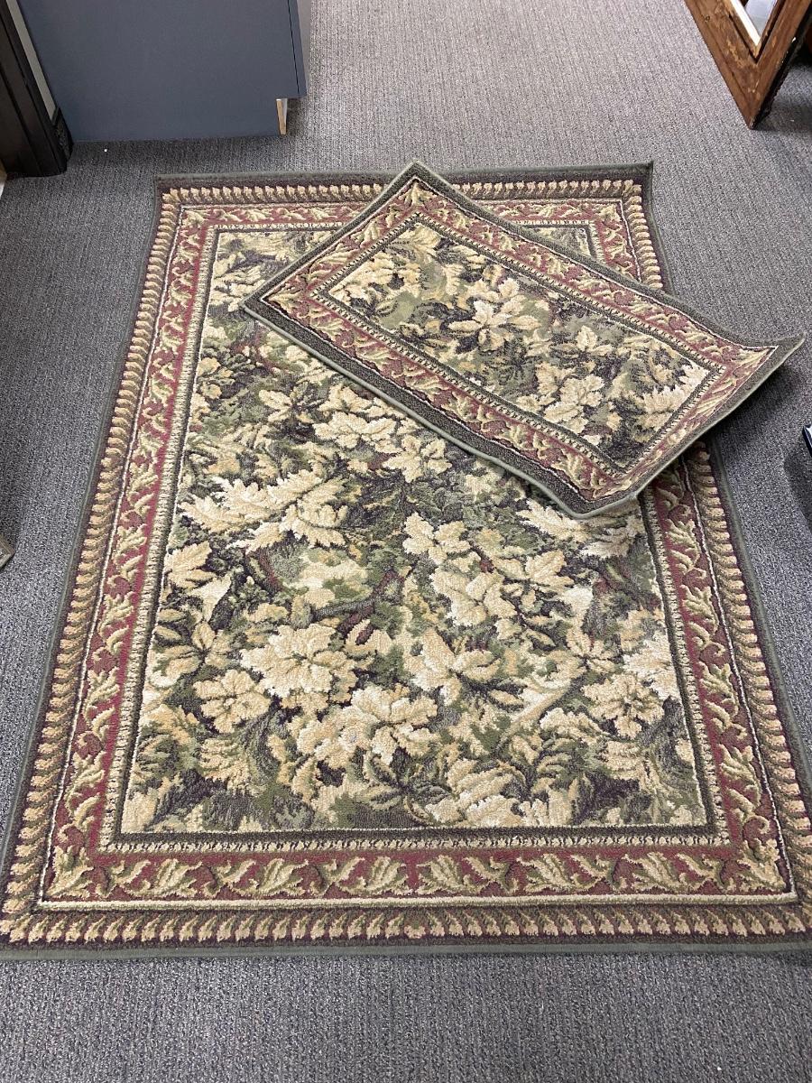 Matching rug and door mat. White and green floral with red border. Good used condition. Area rug is about 4'x6' size.