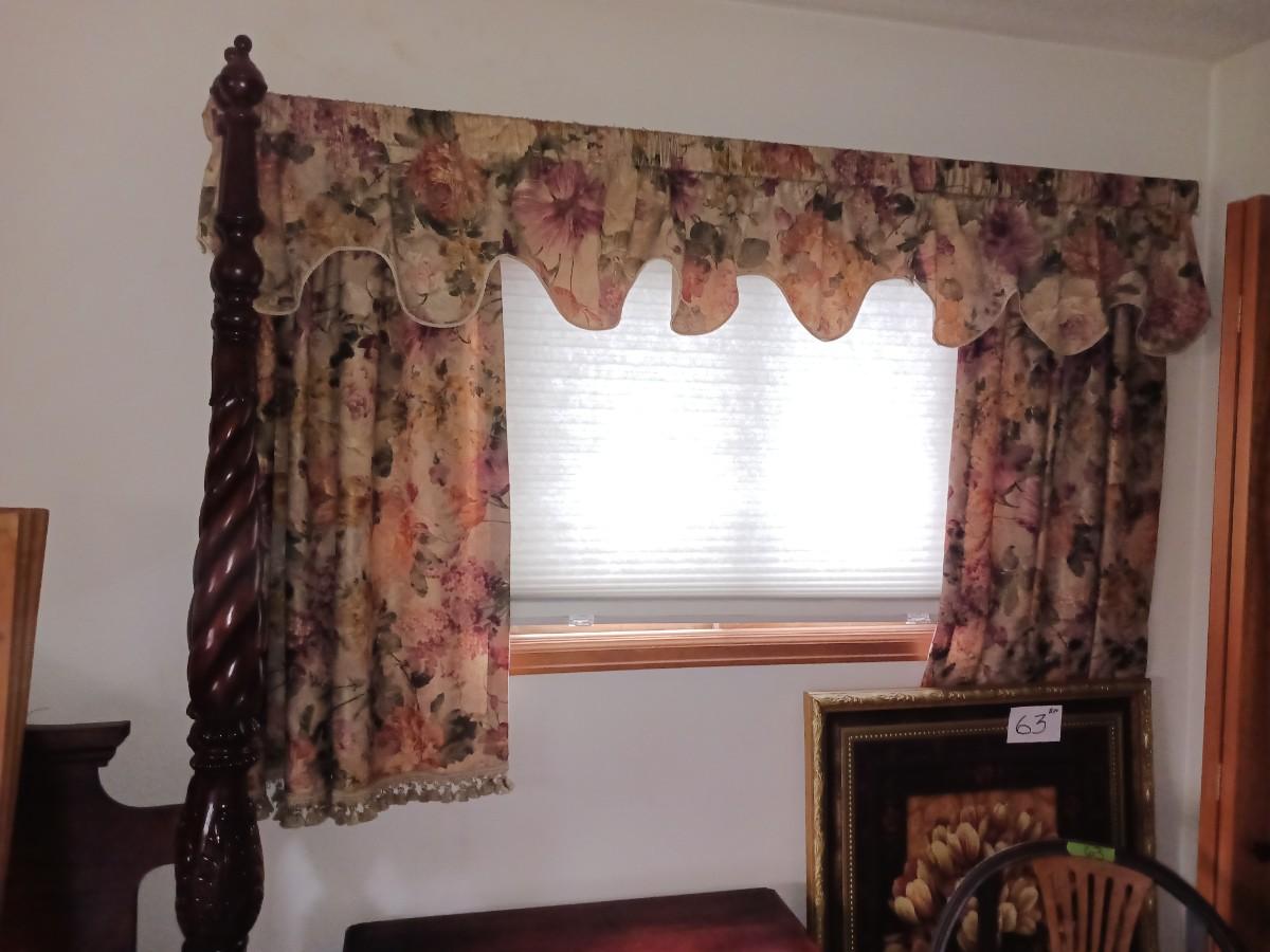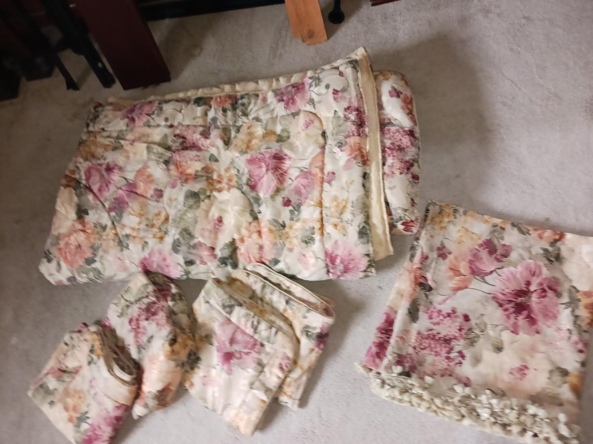 MATCHING FLORAL BEDROOM SET, COMPLETE W/ COMFORTER, PILLOW CASES, EXTRA FABRIC, TWO WINDOW CURTAINS.