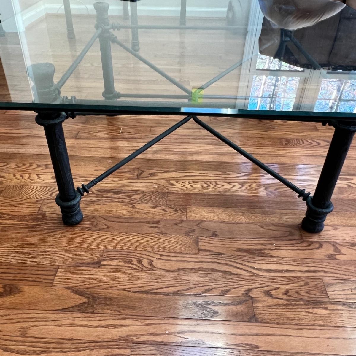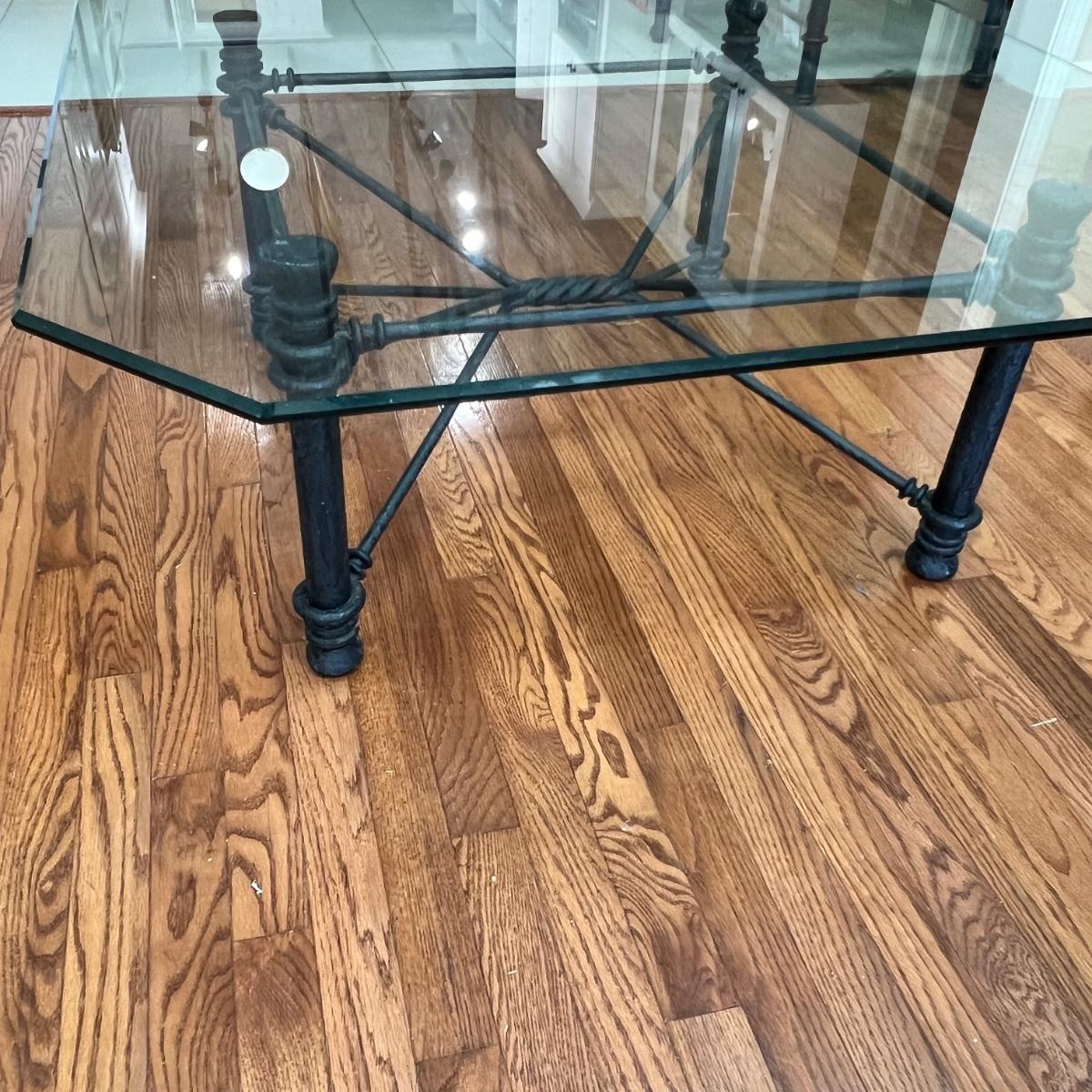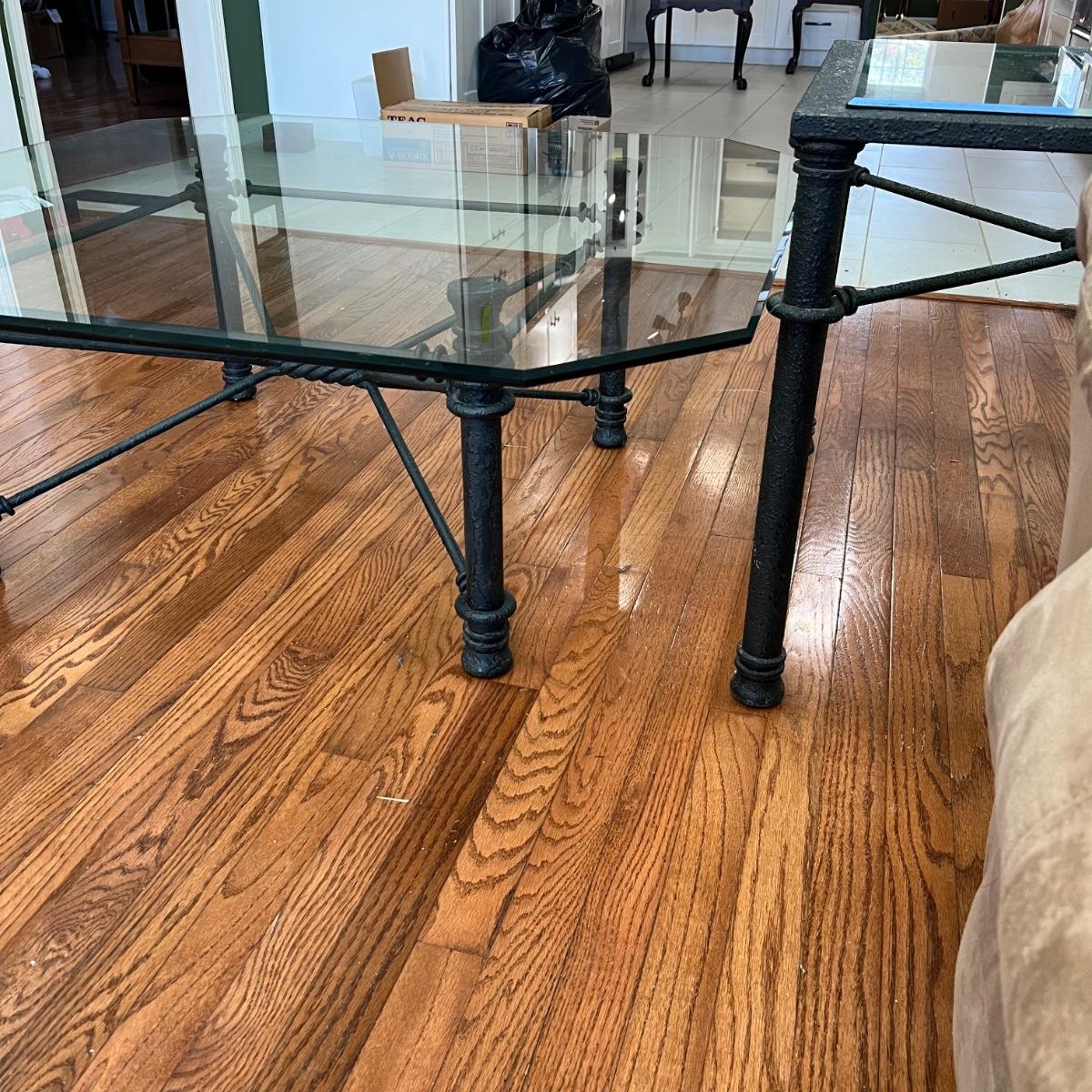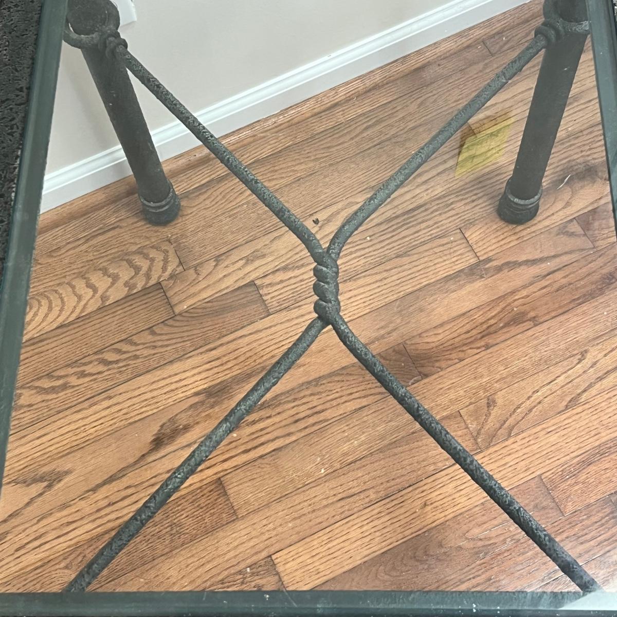 This is a matching pair of a larger coffee table and a smaller side table. Tables feature heavy black metal frames and beveled glass tops. Glass is removable for transport. Note that there are some scratches in the glass on the coffee table, see photos.