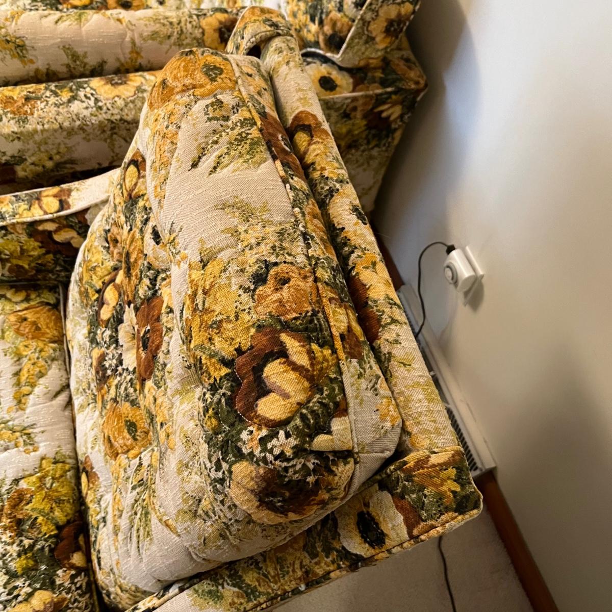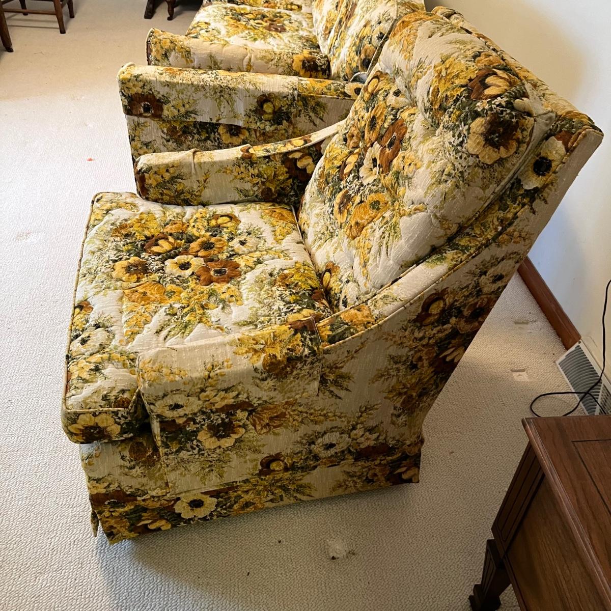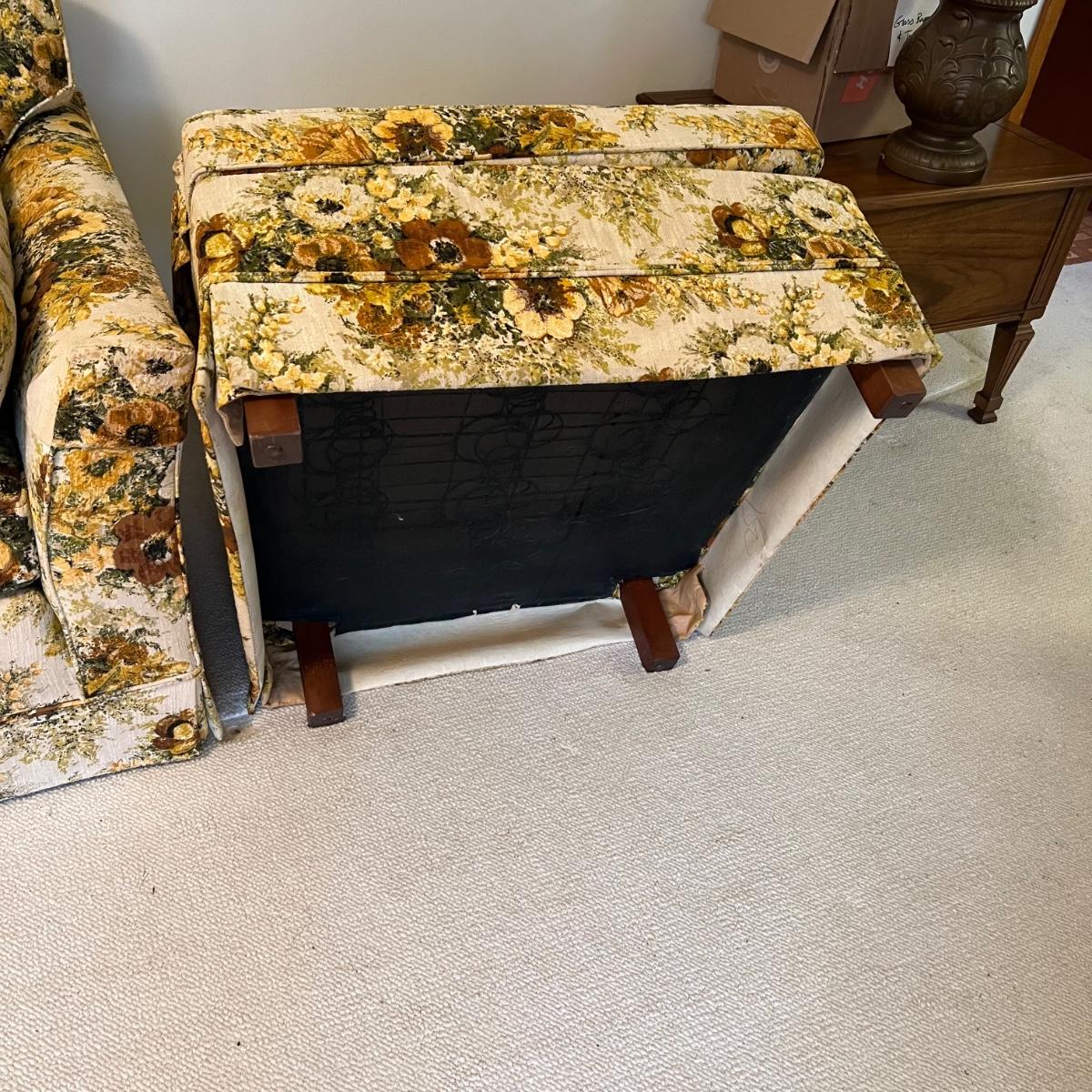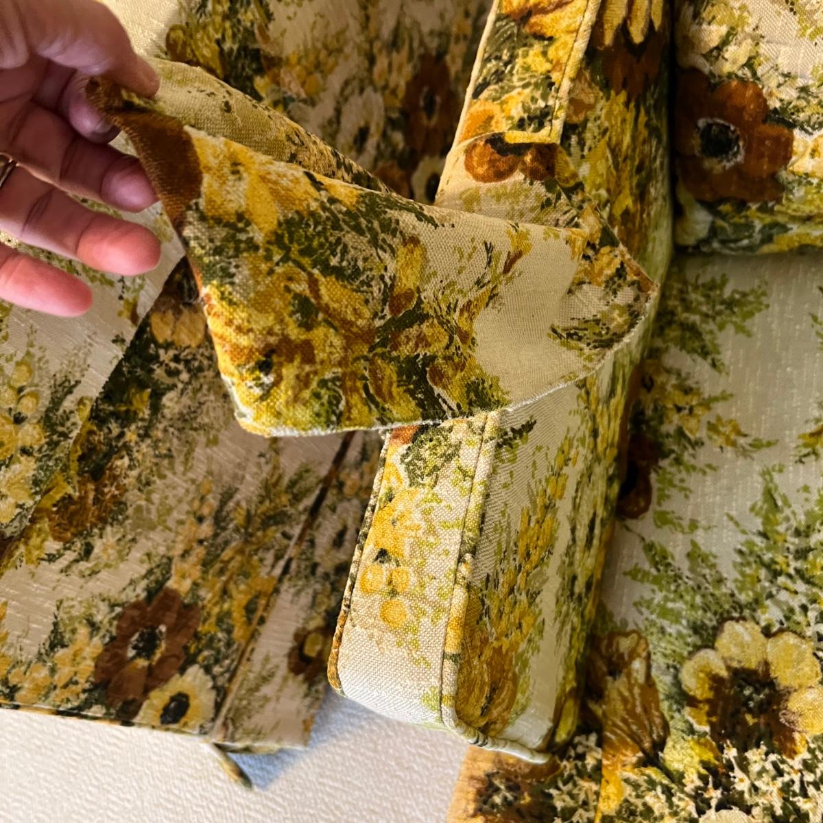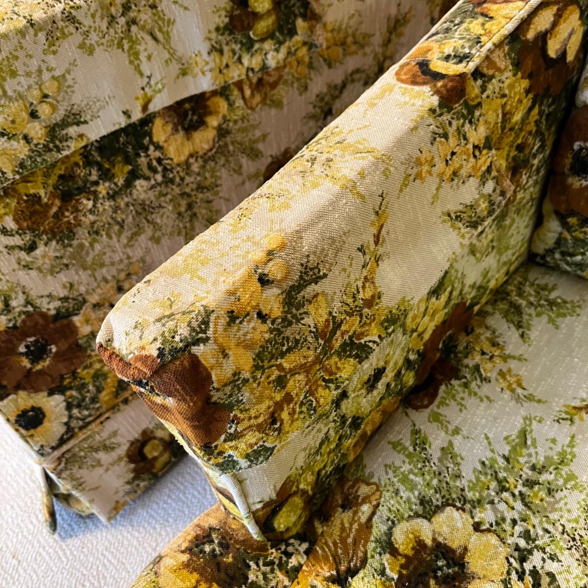This chair by Broyhill has a floral upholstery. It is in good condition. Cushion covers are removable.