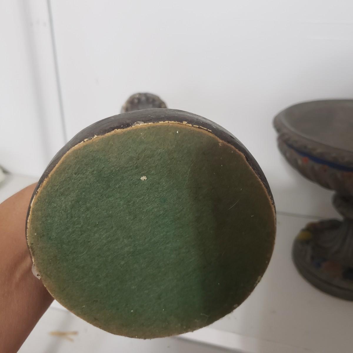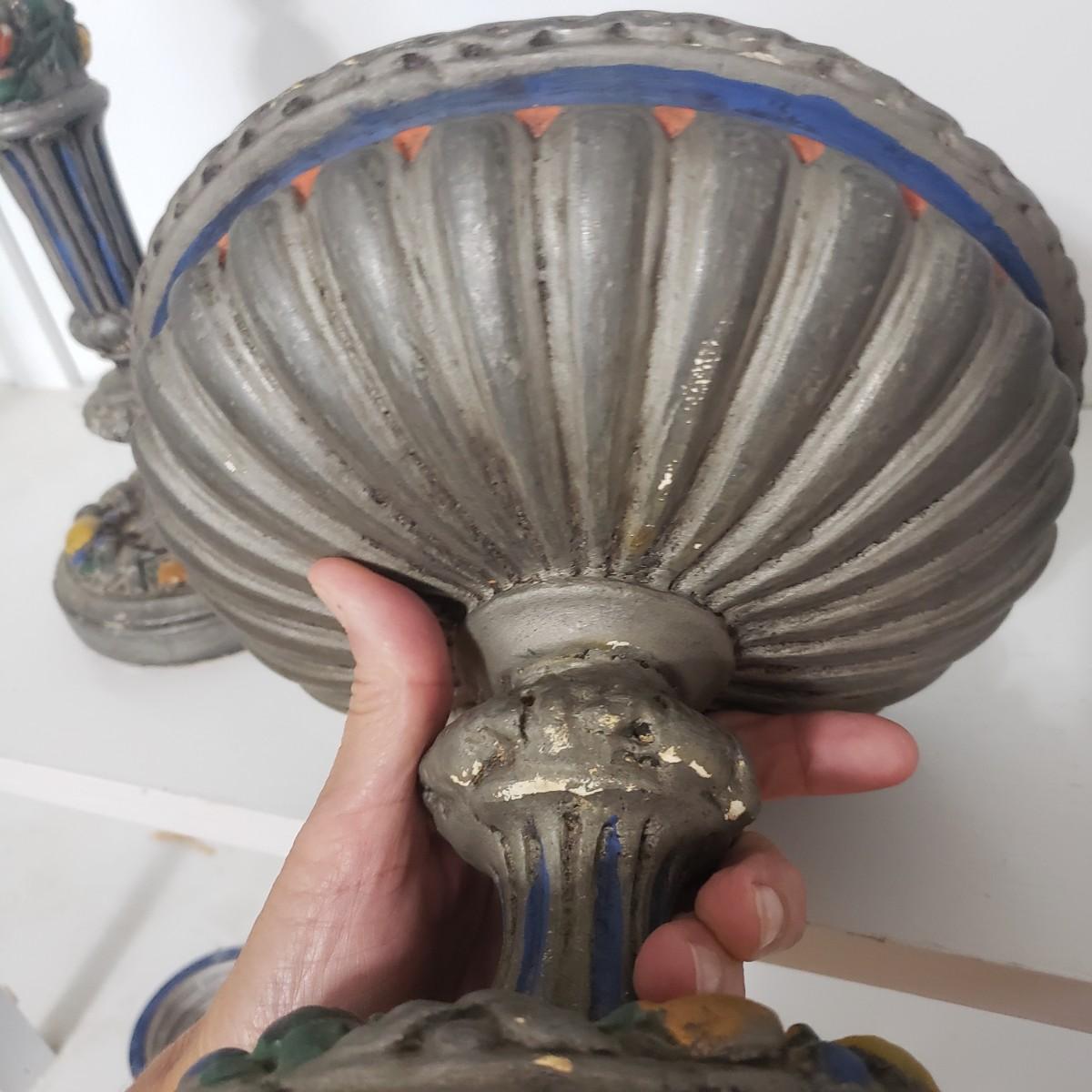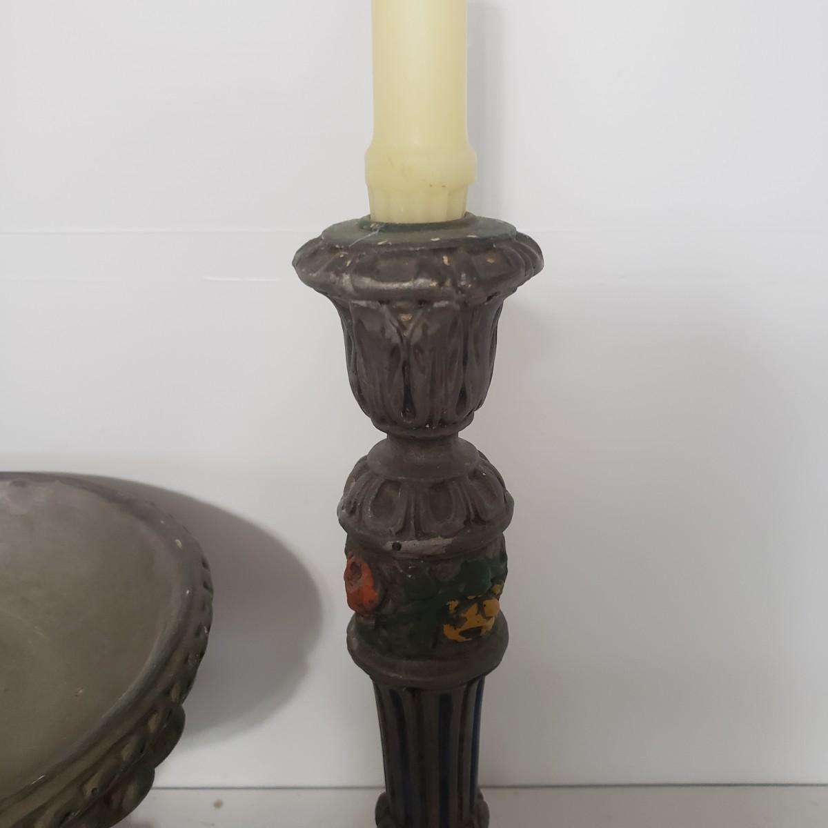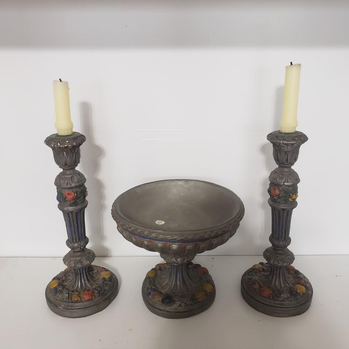 This matching set of candlesticks and bowl appears to be made of resin or plaster. The candlesticks measure 5" x 12"H. The bowl measures 5" x 8" x 7"H. They are light to the touch. There are some areas with paint chipped off. All the bottoms are covered in green felt.