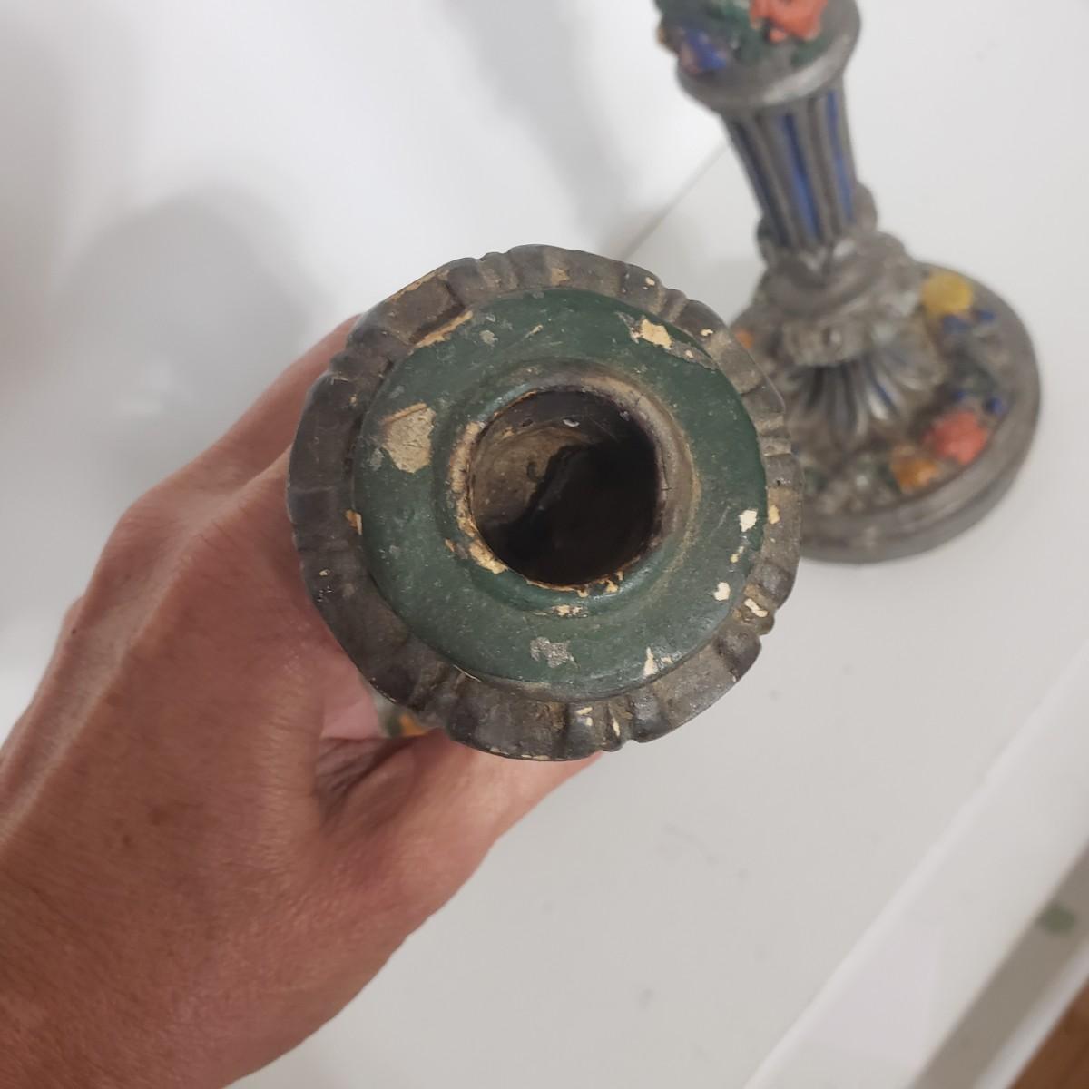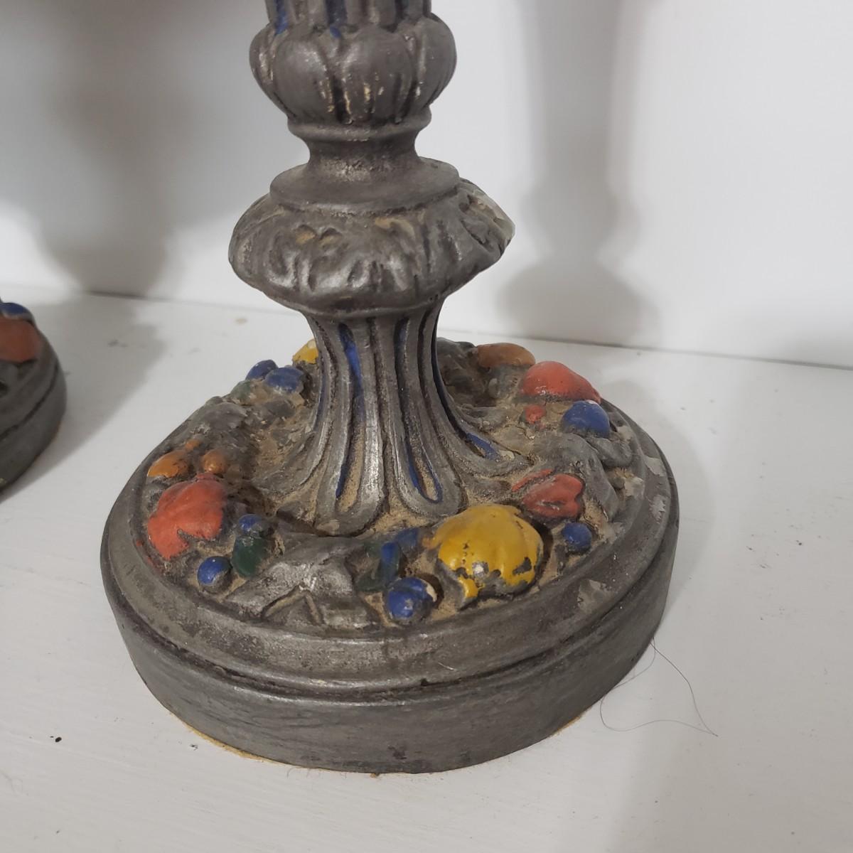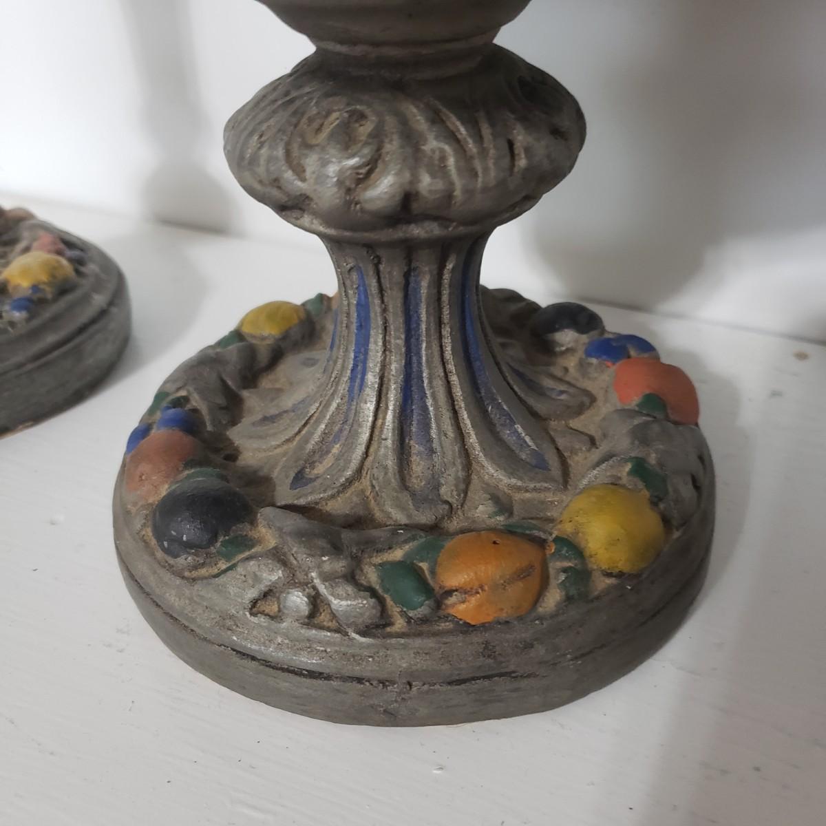 This matching set of candlesticks and bowl appears to be made of resin or plaster. The candlesticks measure 5" x 12"H. The bowl measures 5" x 8" x 7"H. They are light to the touch. There are some areas with paint chipped off. All the bottoms are covered in green felt.