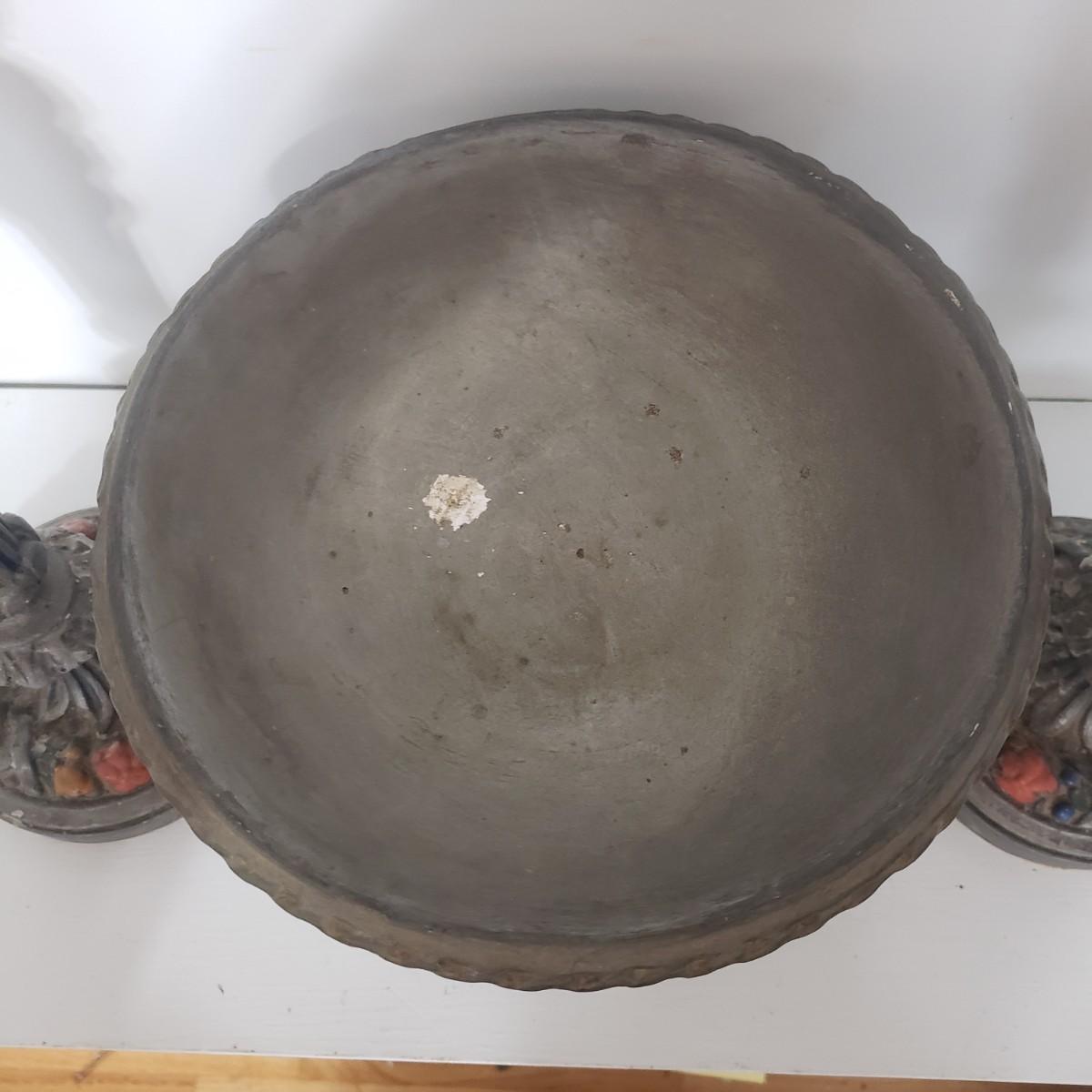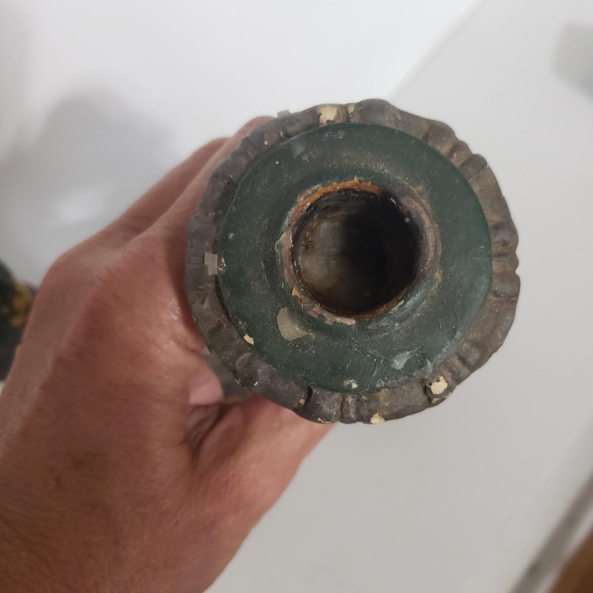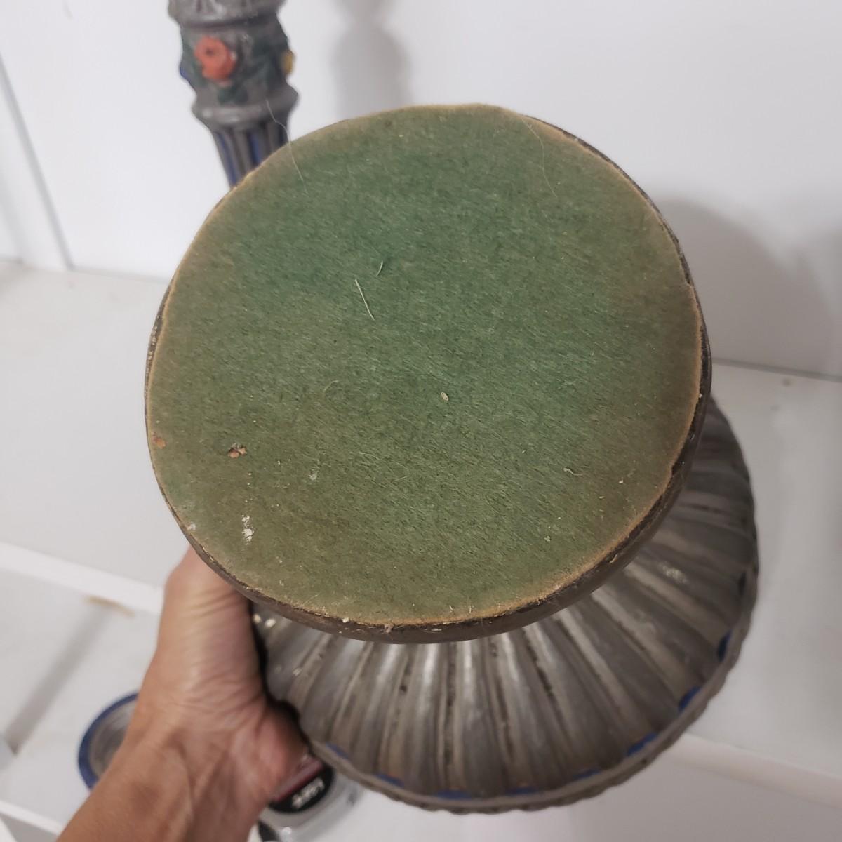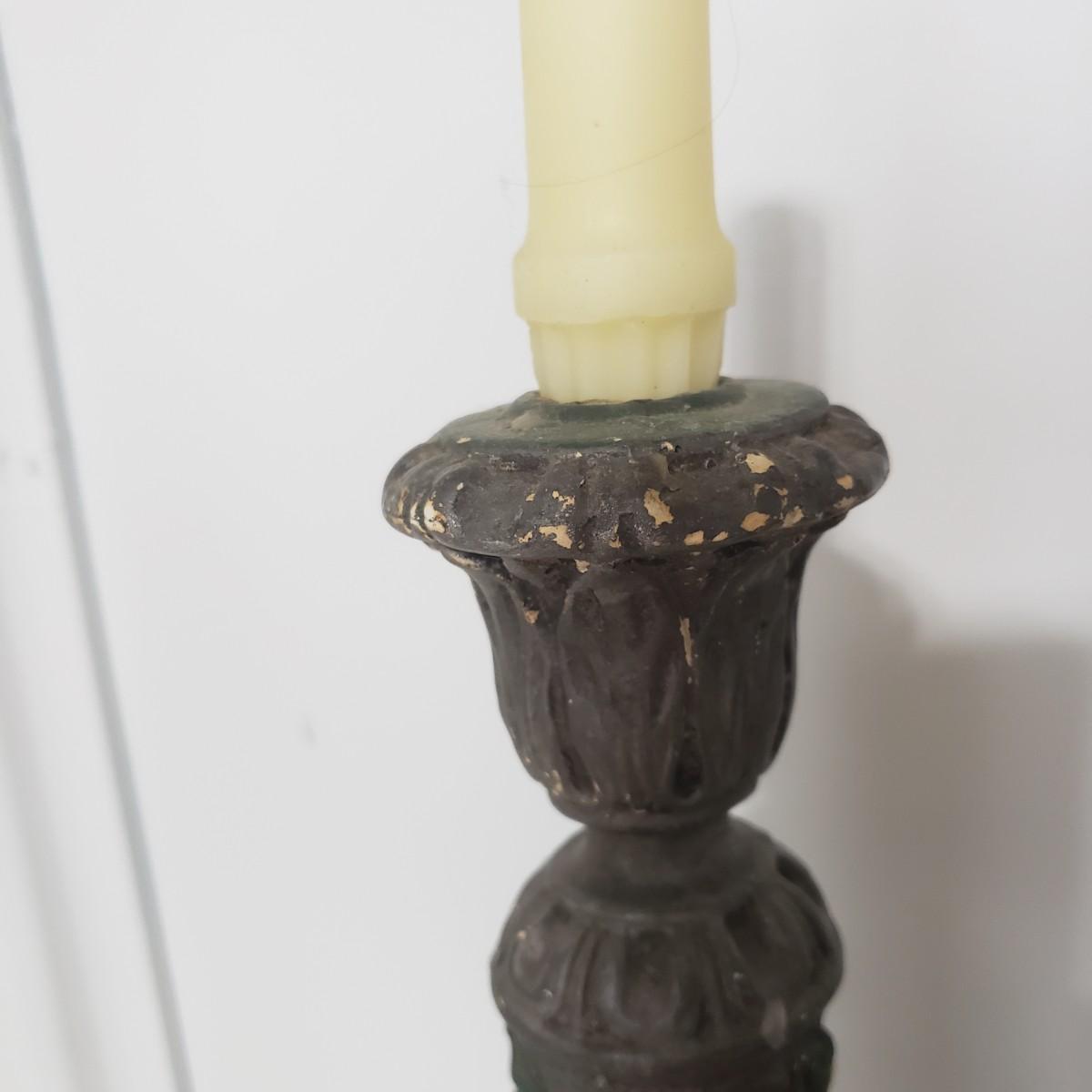 This matching set of candlesticks and bowl appears to be made of resin or plaster. The candlesticks measure 5" x 12"H. The bowl measures 5" x 8" x 7"H. They are light to the touch. There are some areas with paint chipped off. All the bottoms are covered in green felt.