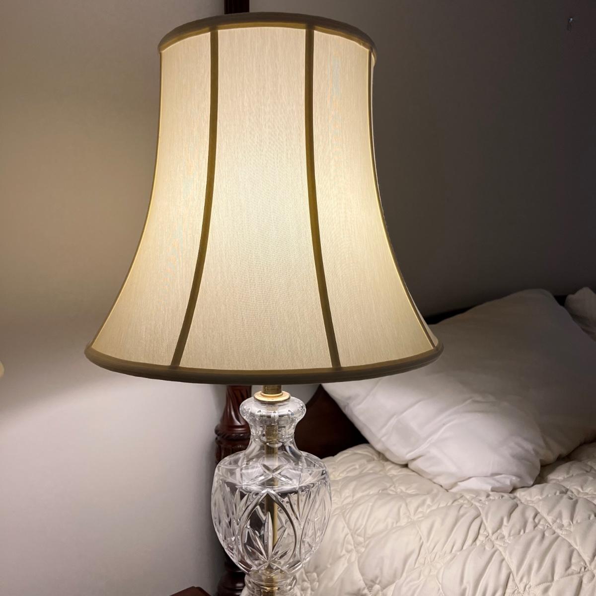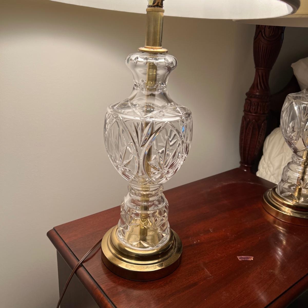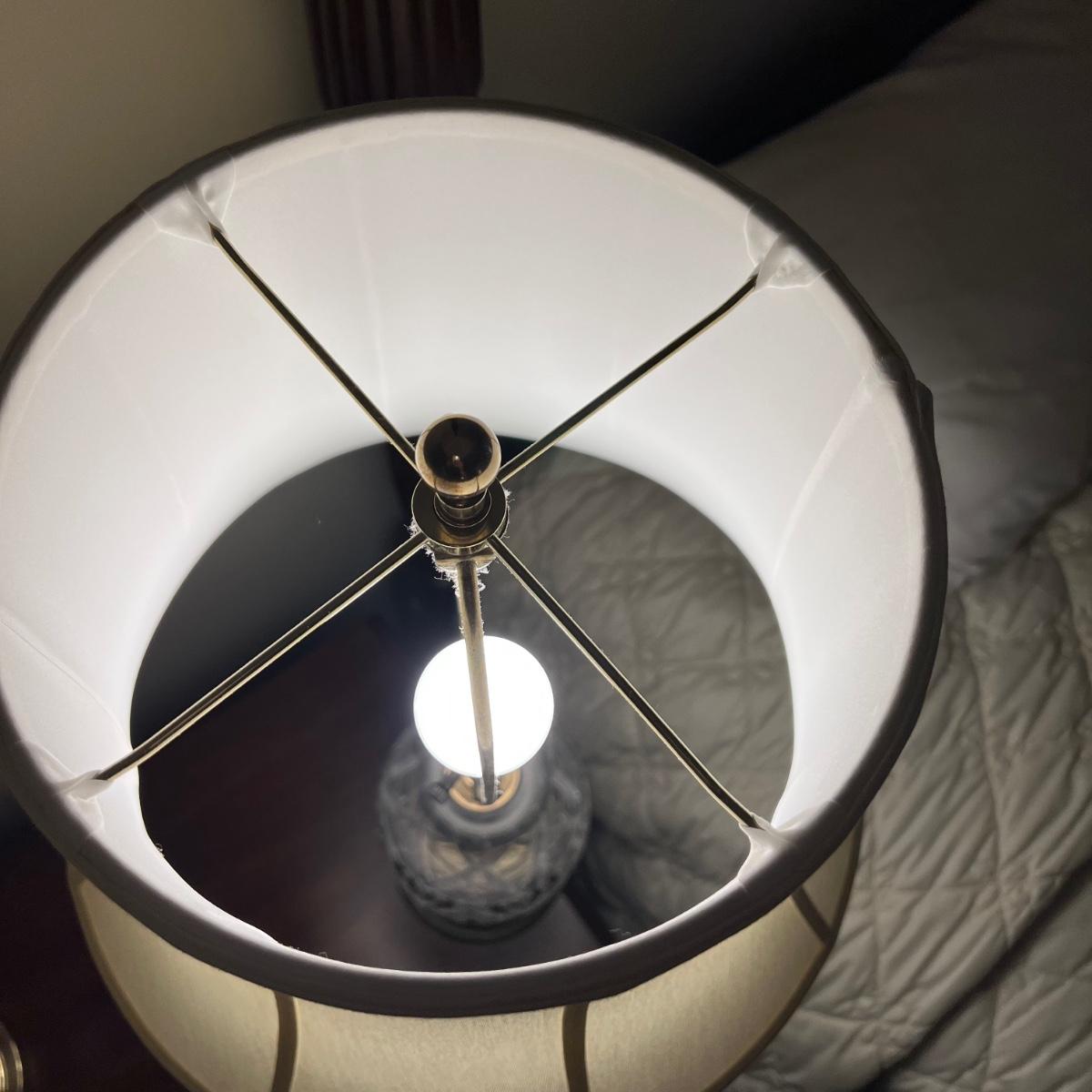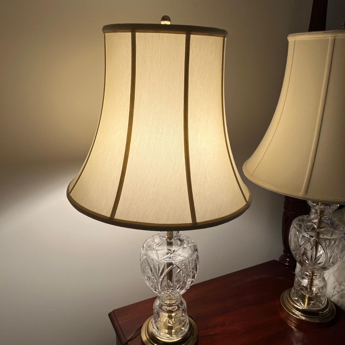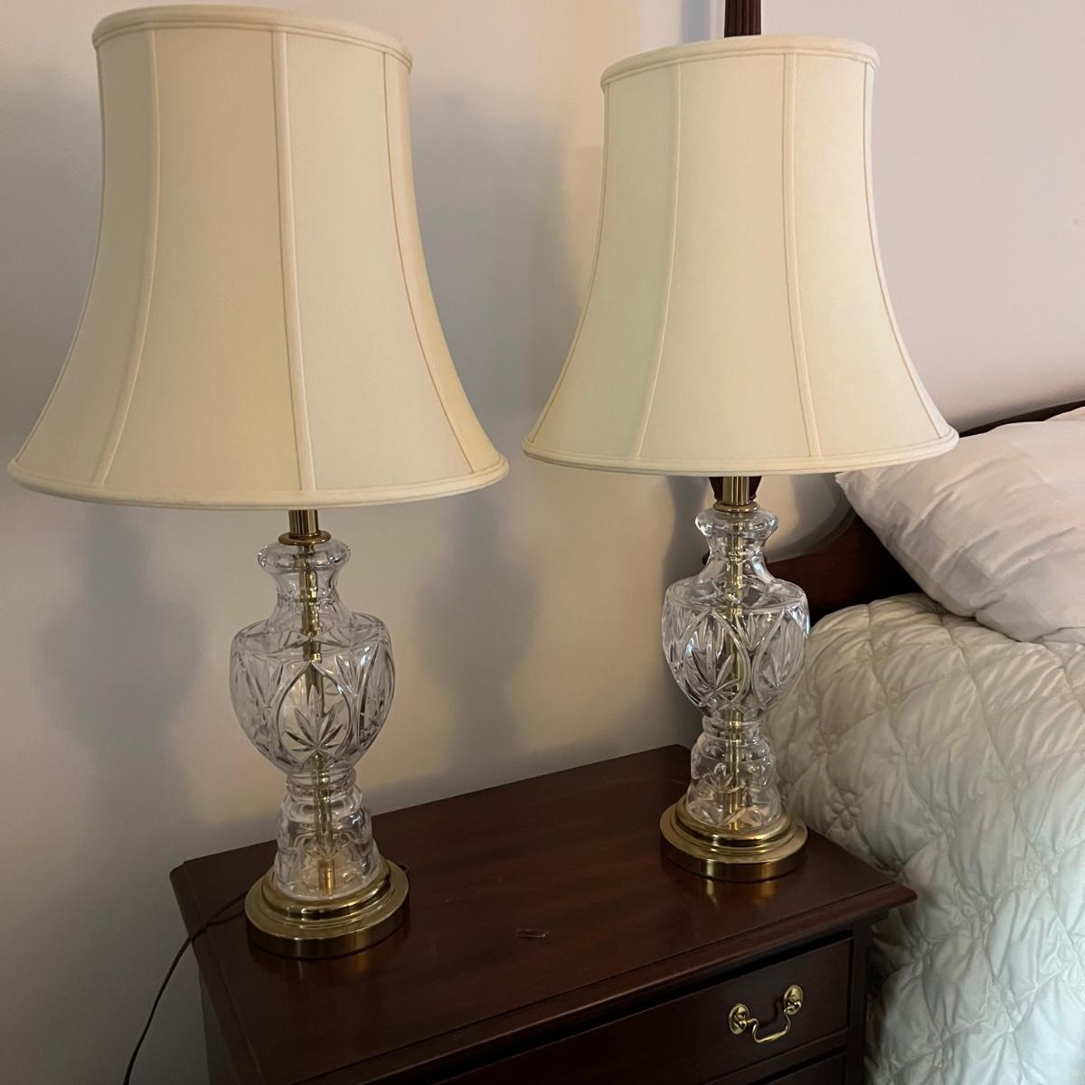 Class act like matching table lamps. They measure 7” round at the base and 32”H. The shades are a white silk like fabric. Shipping available.