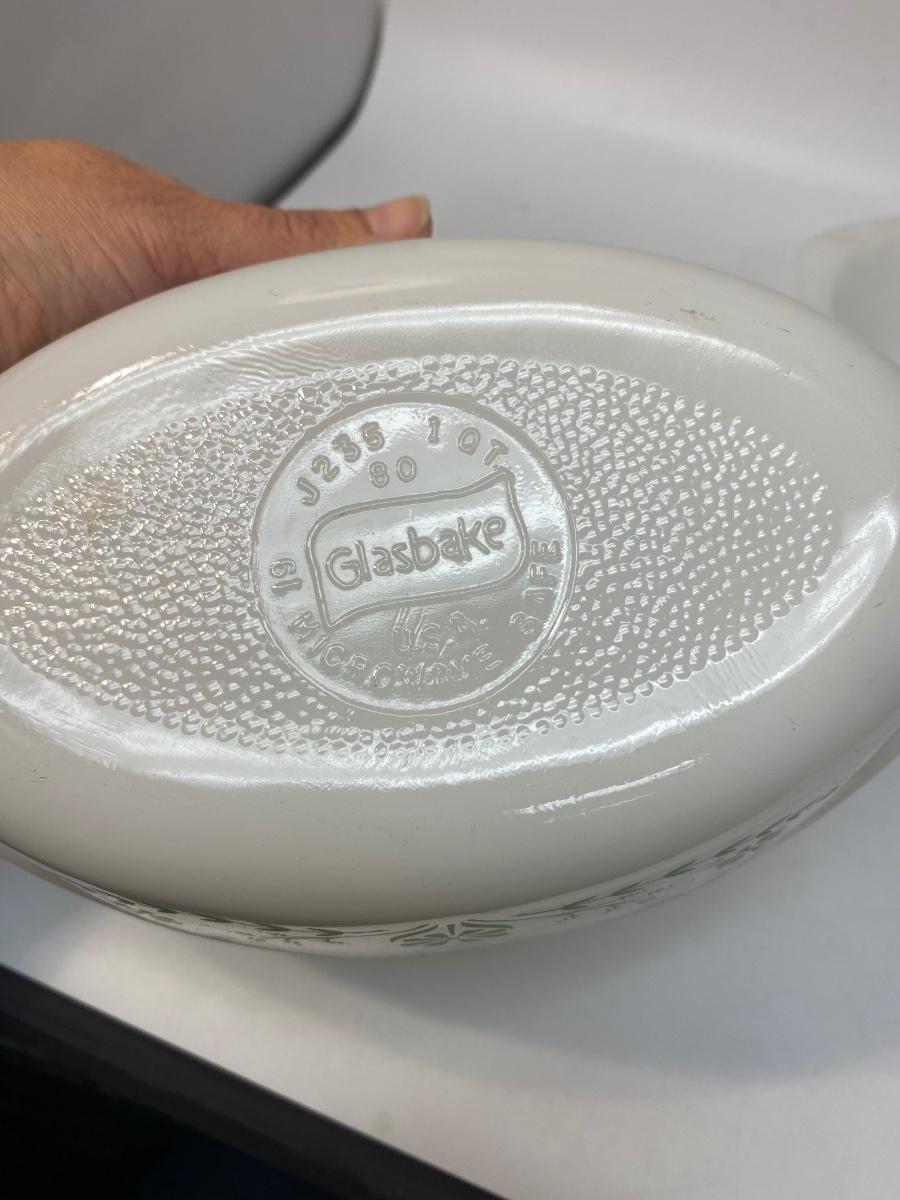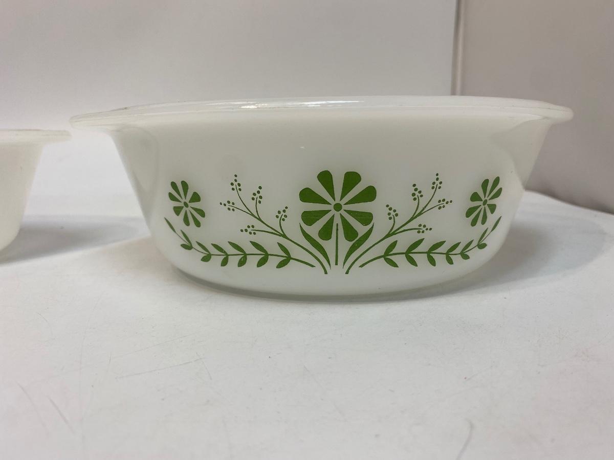 Matching Green Flower Floral Glasbake Casserole Baking Dishes. In good used condition. Light wear in spots to the green design but are still displayable and very useable.