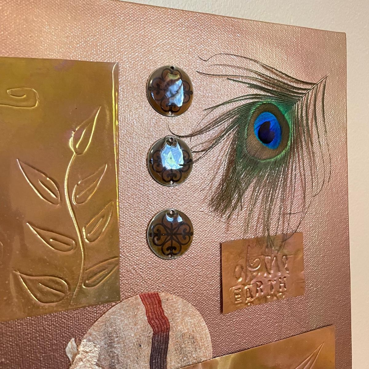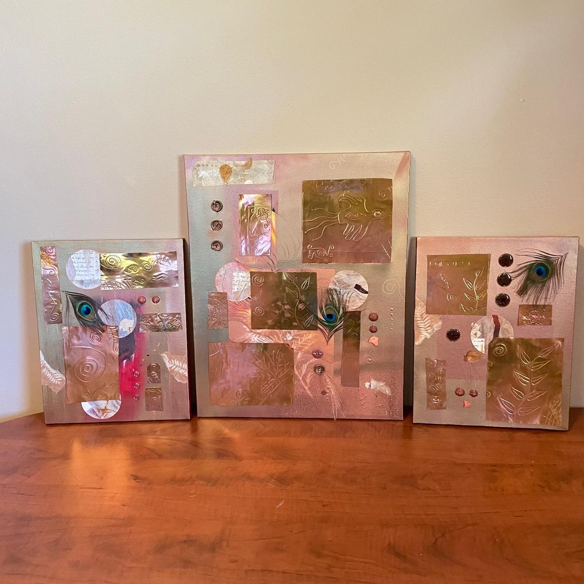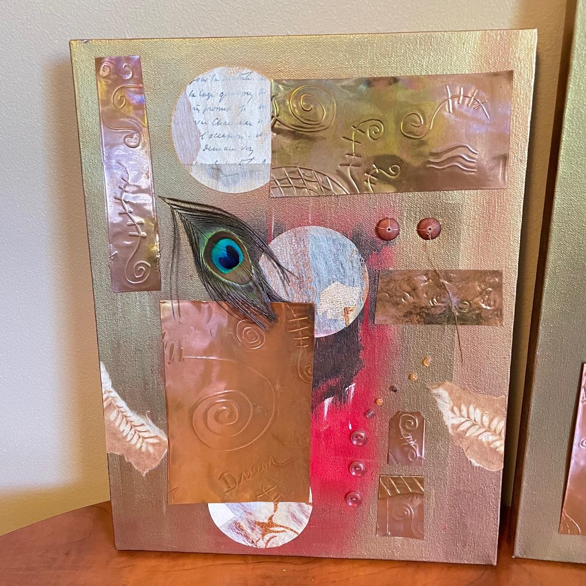 Three complementing pieces of copper colored mixed media art. Pieces are on canvas attached to sturdy wooden frames with wire. The peacock feathers, reds and feathers make this trio really pop! The largest art is 16” x 20”, the smaller art is