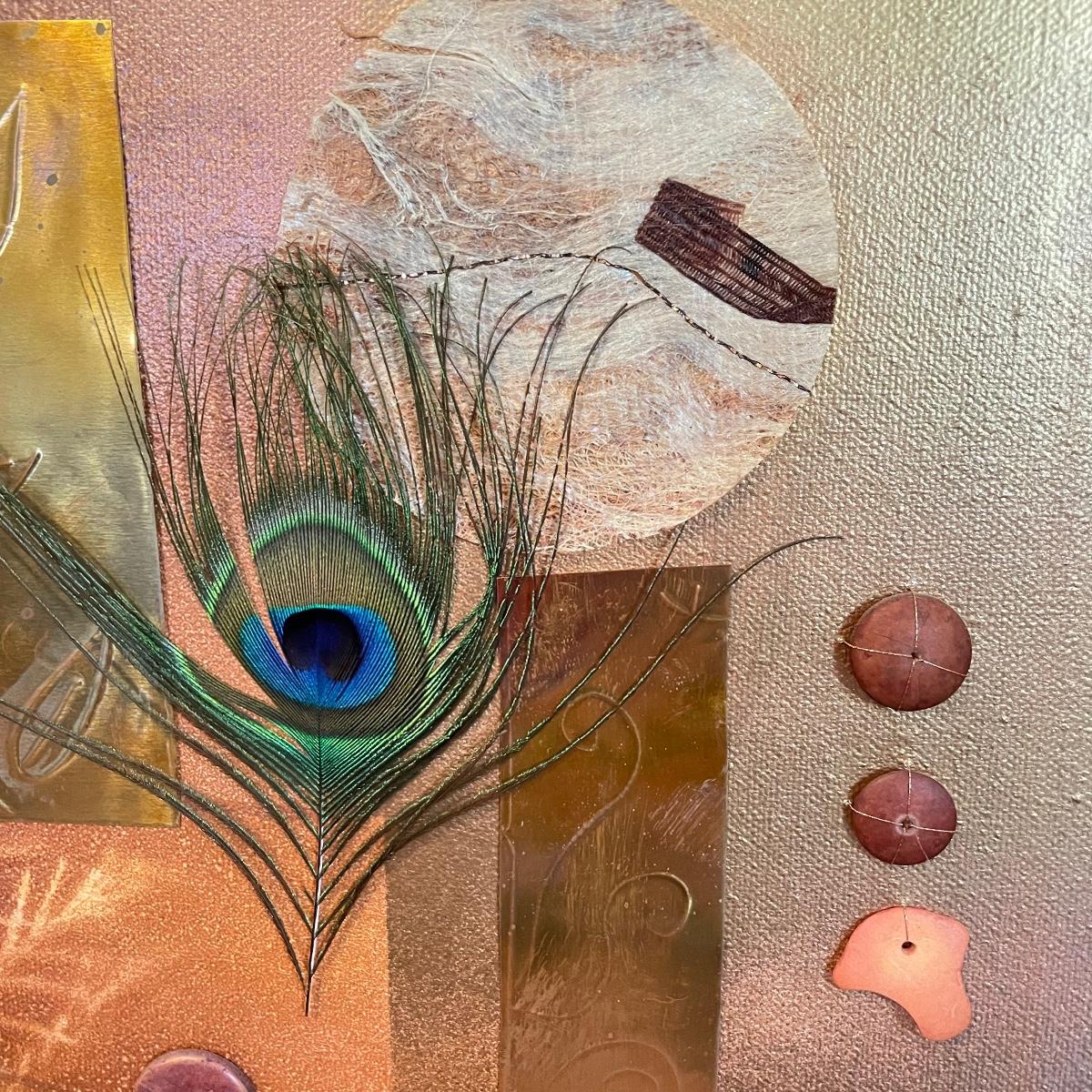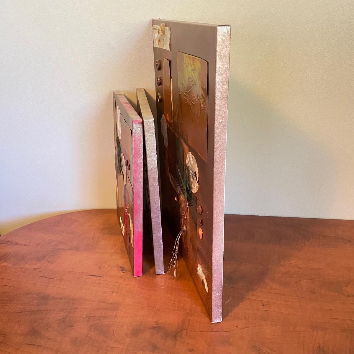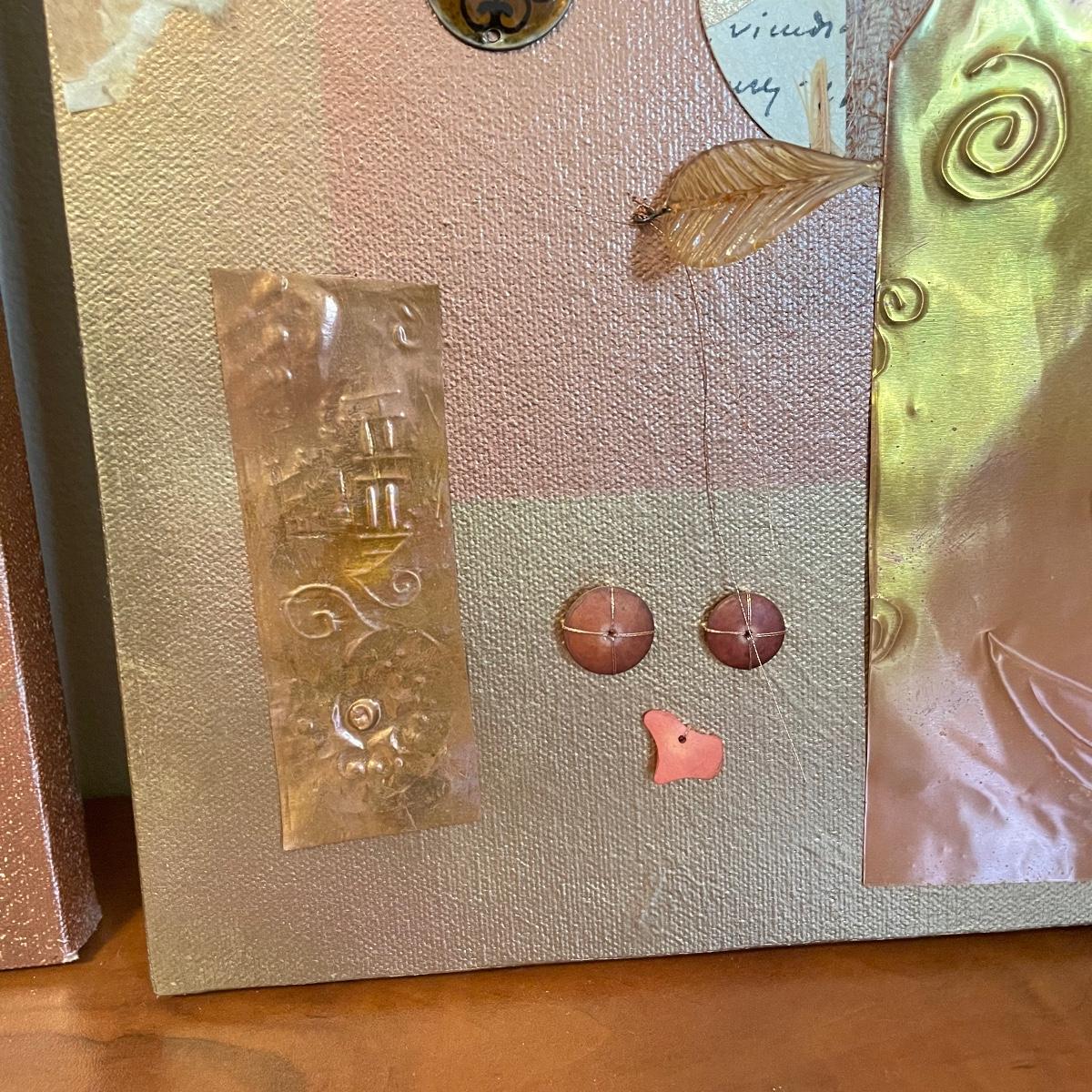 Three complementing pieces of copper colored mixed media art. Pieces are on canvas attached to sturdy wooden frames with wire. The peacock feathers, reds and feathers make this trio really pop! The largest art is 16” x 20”, the smaller art is