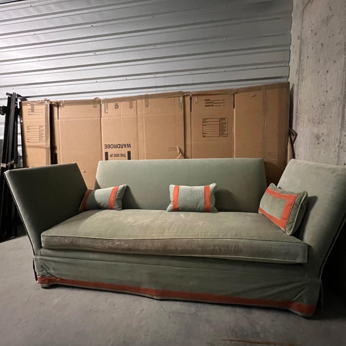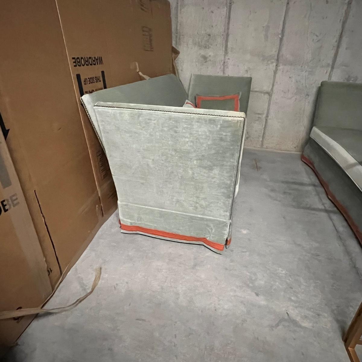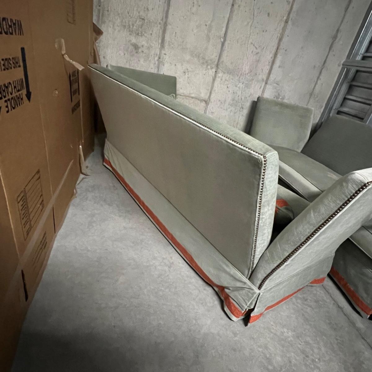 These two large comfortable sofas are a pale blue color in a velvet like fabric with orange trim. Three small matching accent pillows are included. Sides have pressed metal studs in an aged bronze color. The upholstery on both does have some fading on the sofa frame and on seat cushions and accent cushions; some bleached out spots on each of the removable seat cushions upholstery as well, see images. They measure 86” x 59” x 36”H with 18” seat height.