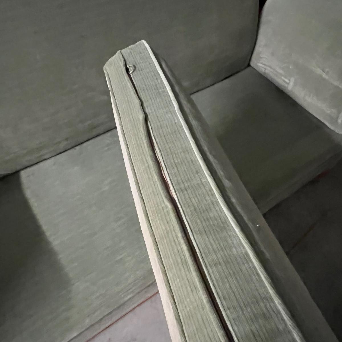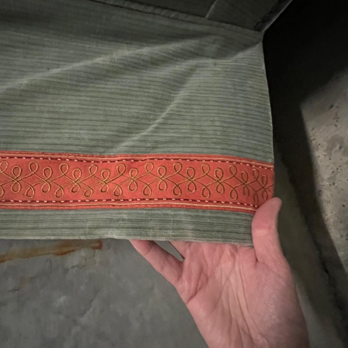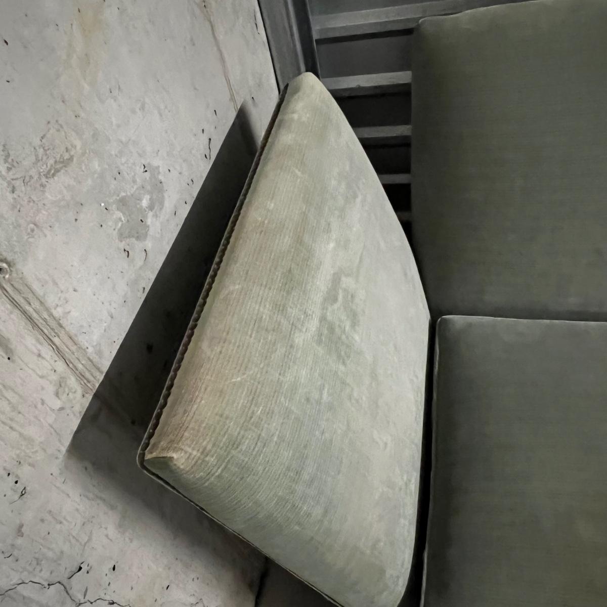 These two large comfortable sofas are a pale blue color in a velvet like fabric with orange trim. Three small matching accent pillows are included. Sides have pressed metal studs in an aged bronze color. The upholstery on both does have some fading on the sofa frame and on seat cushions and accent cushions; some bleached out spots on each of the removable seat cushions upholstery as well, see images. They measure 86” x 59” x 36”H with 18” seat height.