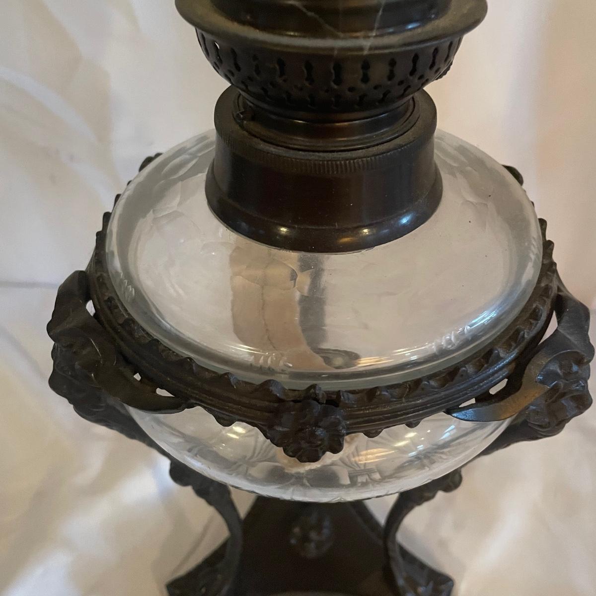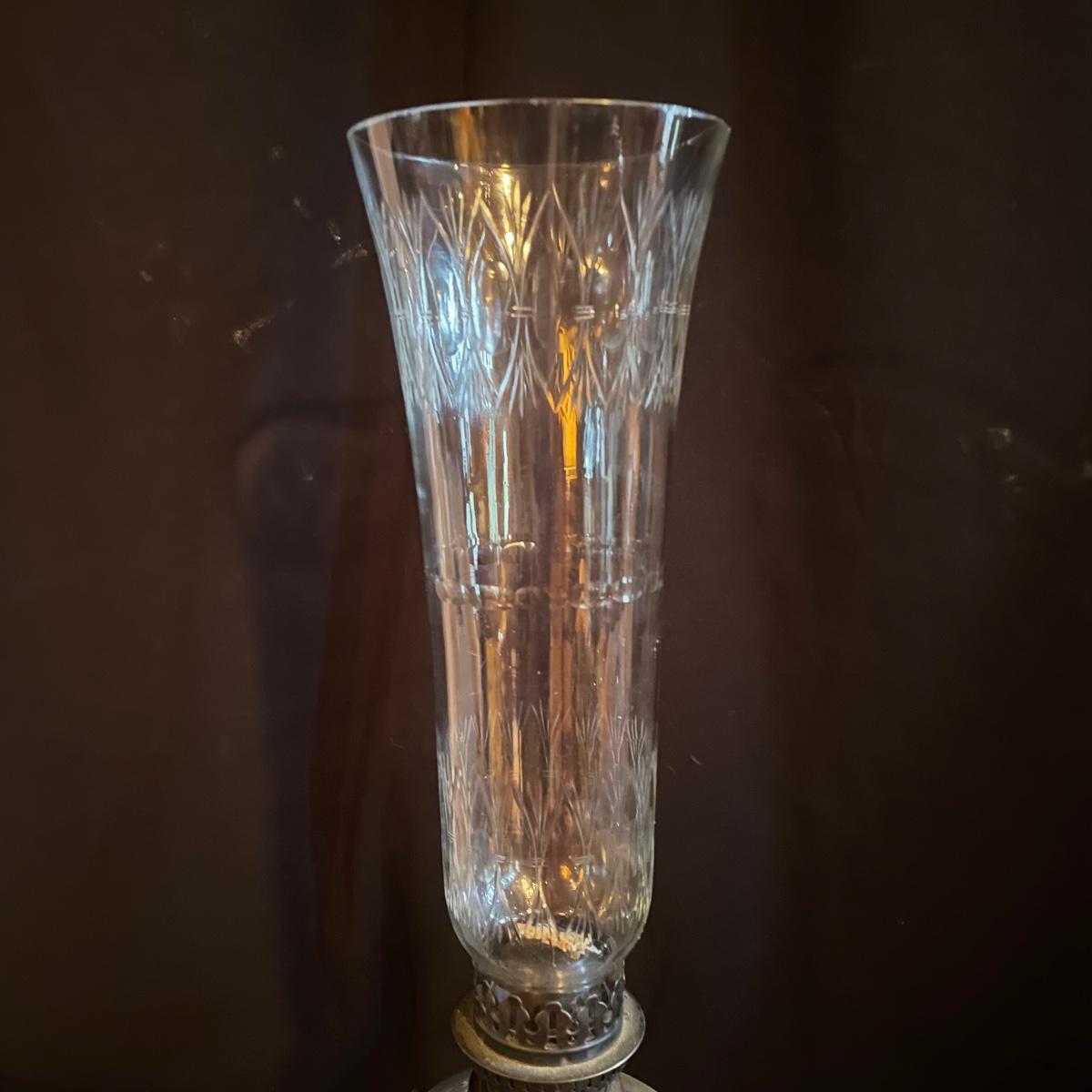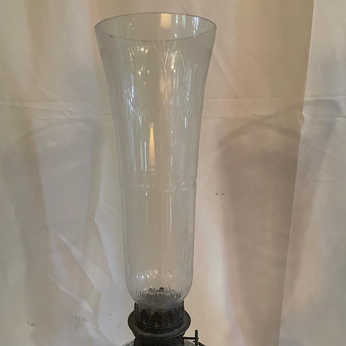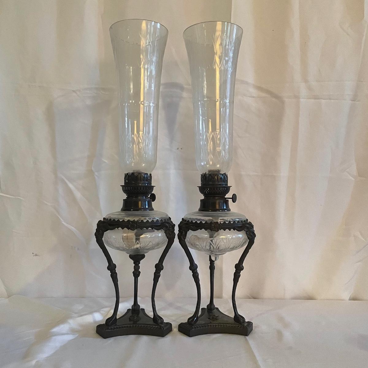This elegant duo of Bombay oil lamps are from India. The footed bases are solid black metal with intricate carved detailing. The glass is etched. Wicks look like they are new. Note that one has a lower finial on the bottom of glass bowl, the other one has come off and just needs gluing back into place.