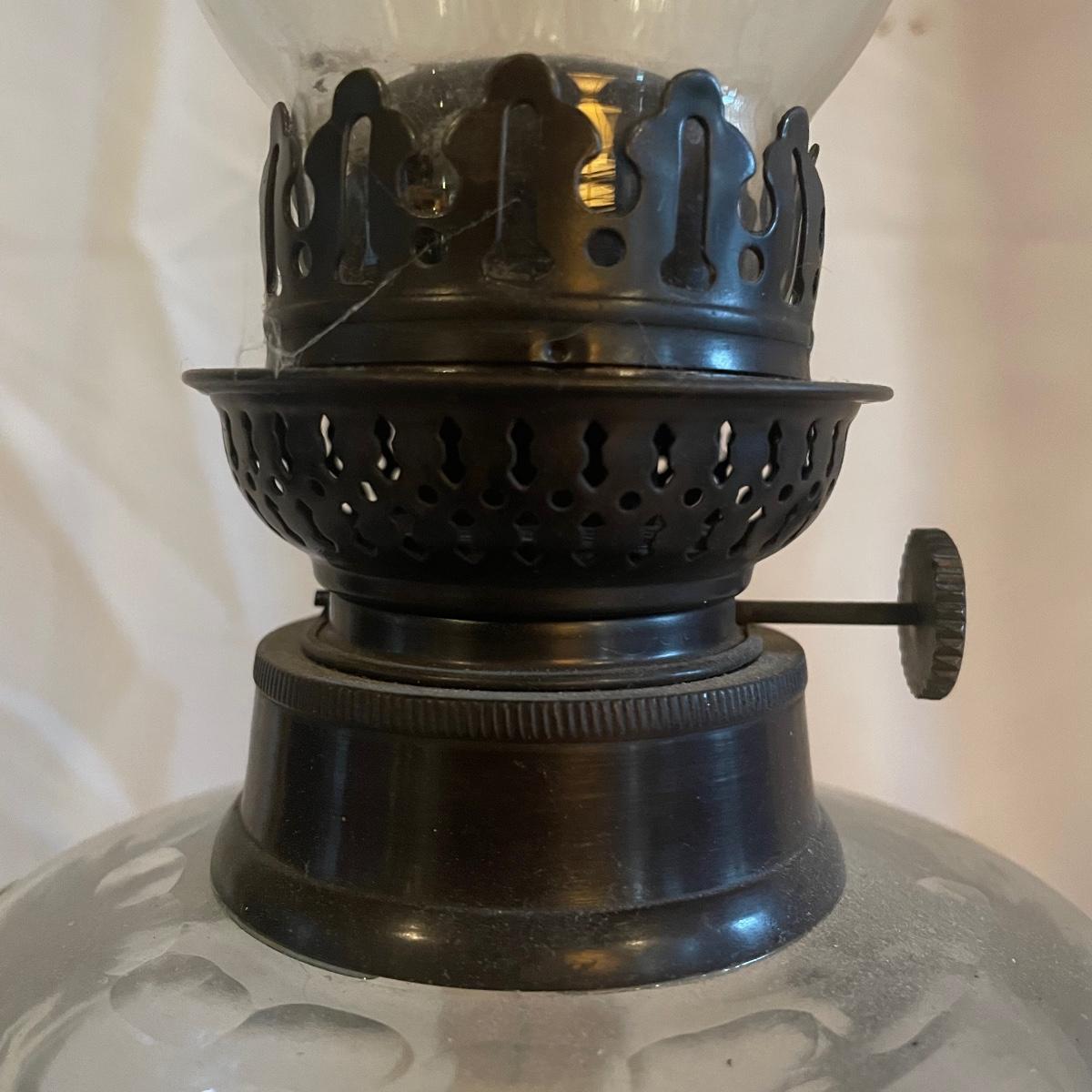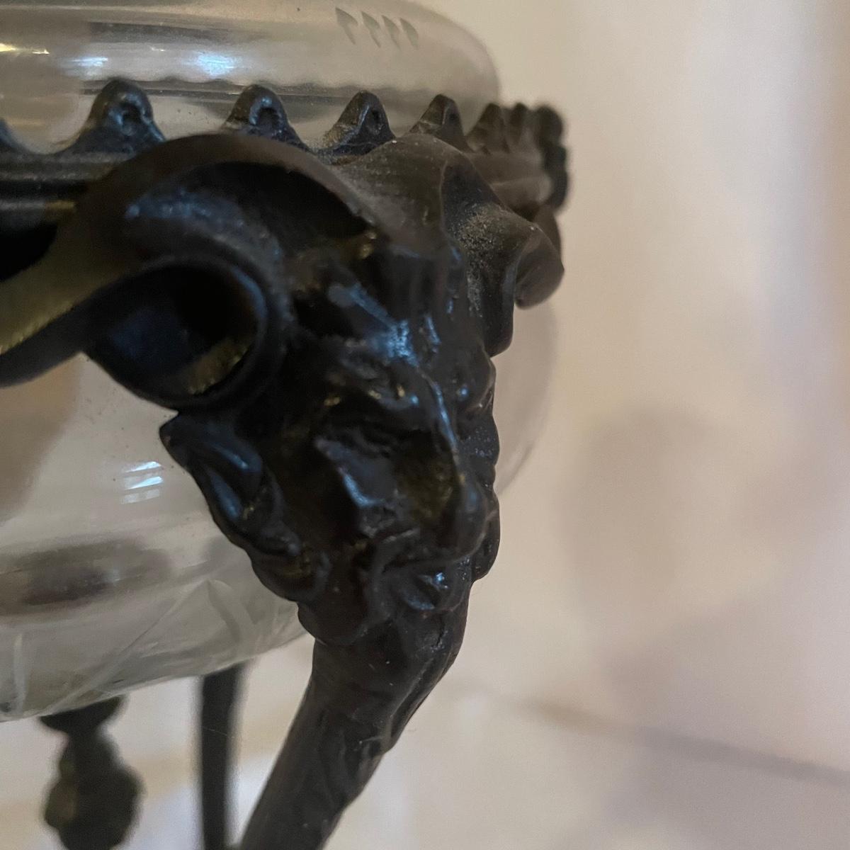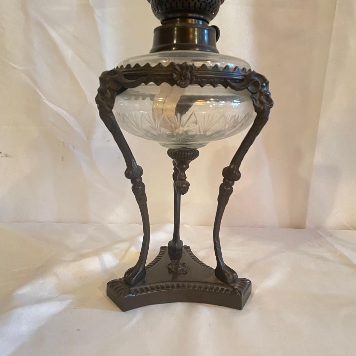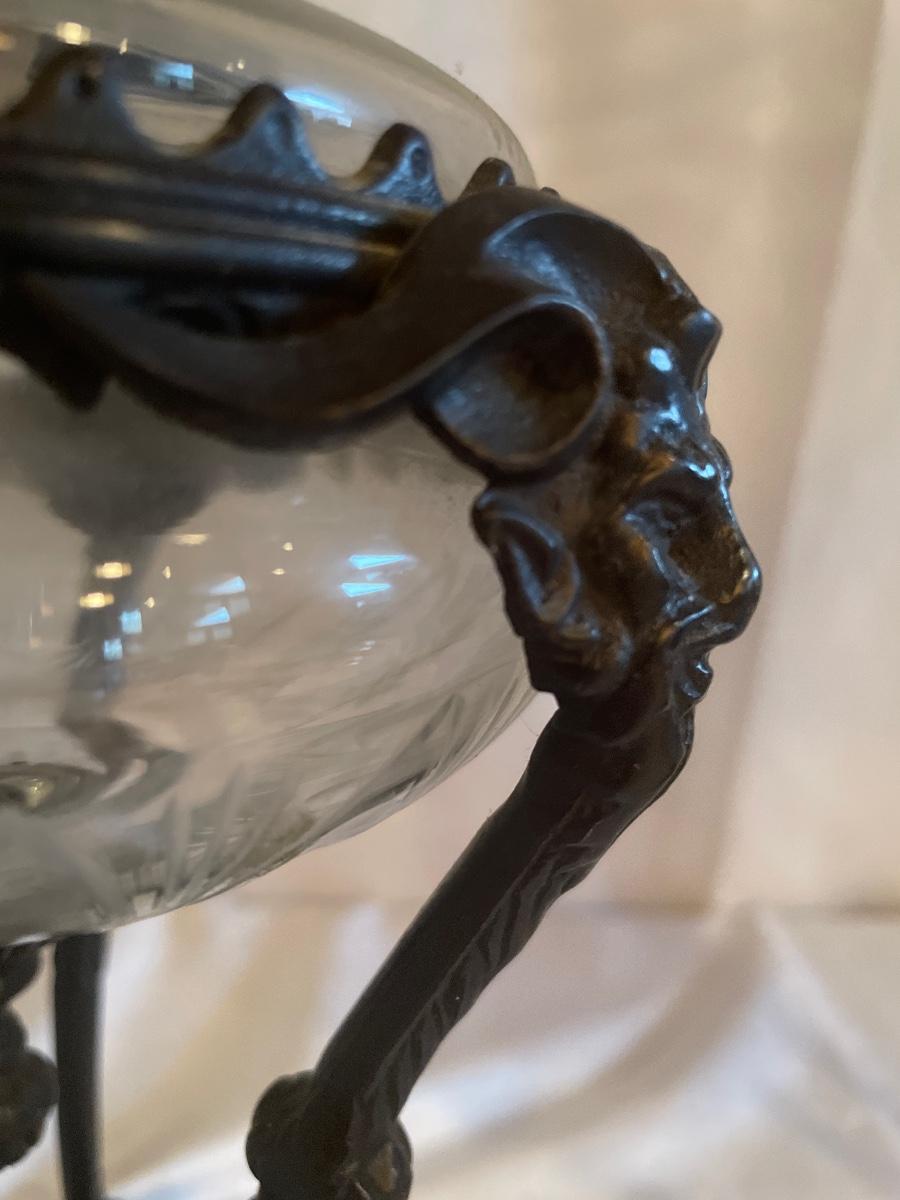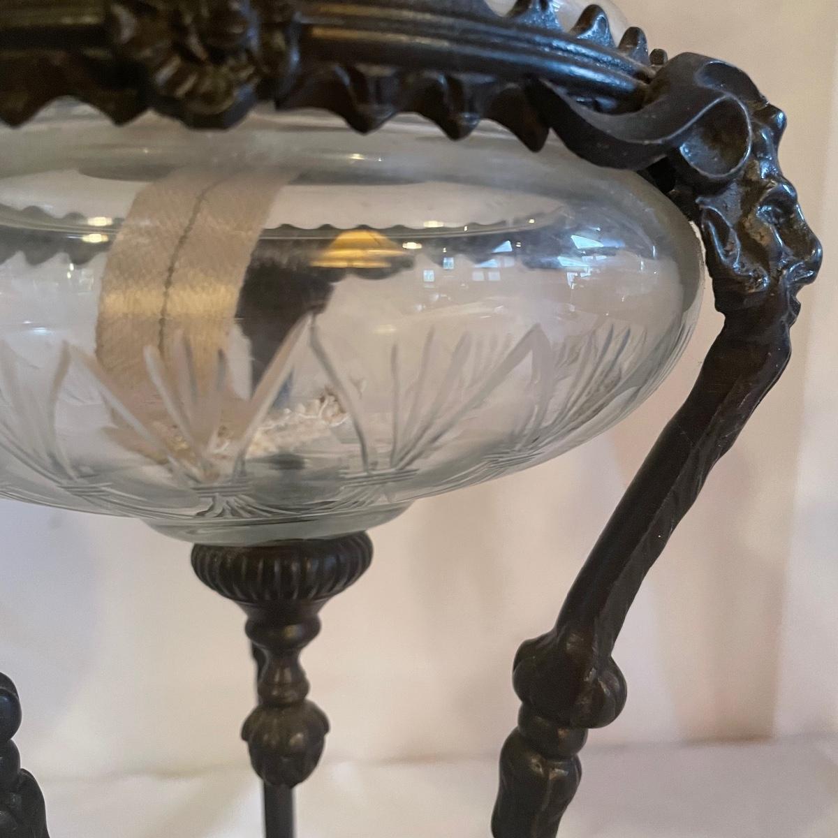 This elegant duo of Bombay oil lamps are from India. The footed bases are solid black metal with intricate carved detailing. The glass is etched. Wicks look like they are new. Note that one has a lower finial on the bottom of glass bowl, the other one has come off and just needs gluing back into place.