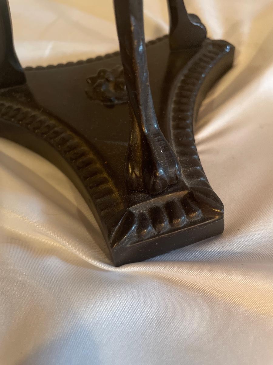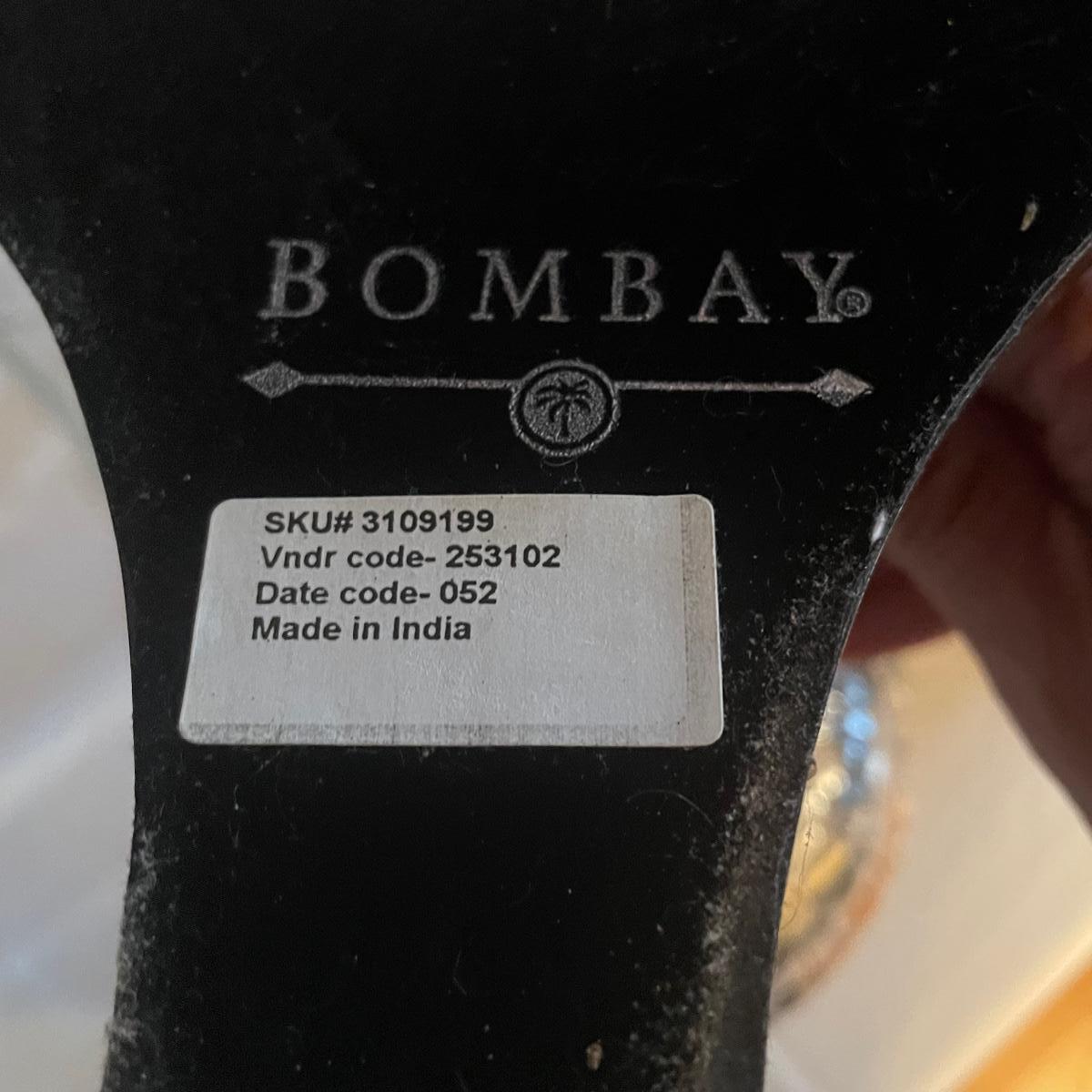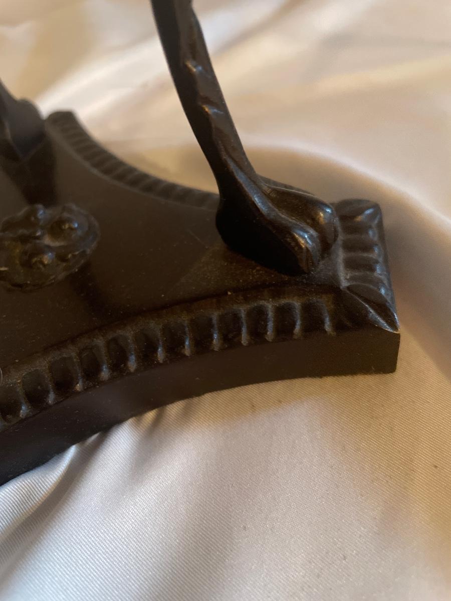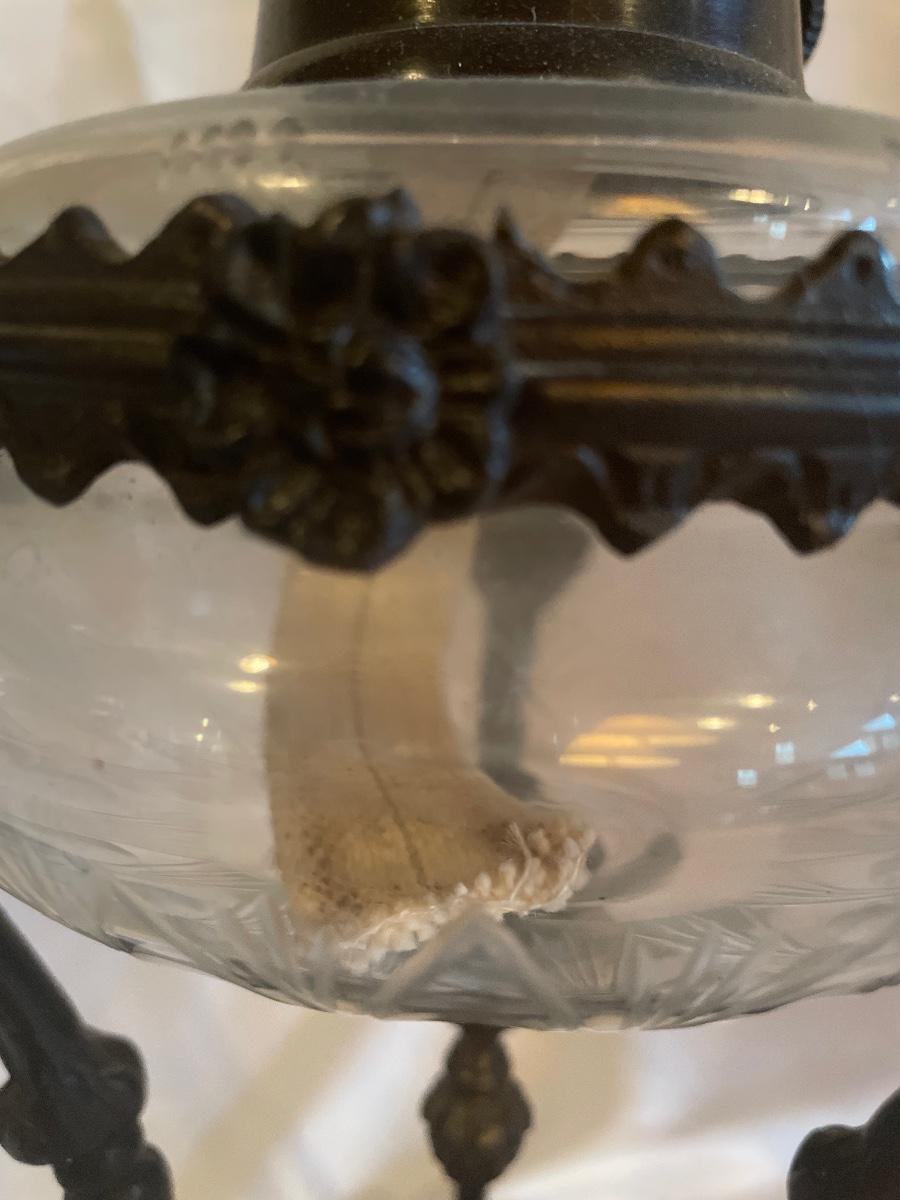 This elegant duo of Bombay oil lamps are from India. The footed bases are solid black metal with intricate carved detailing. The glass is etched. Wicks look like they are new. Note that one has a lower finial on the bottom of glass bowl, the other one has come off and just needs gluing back into place.