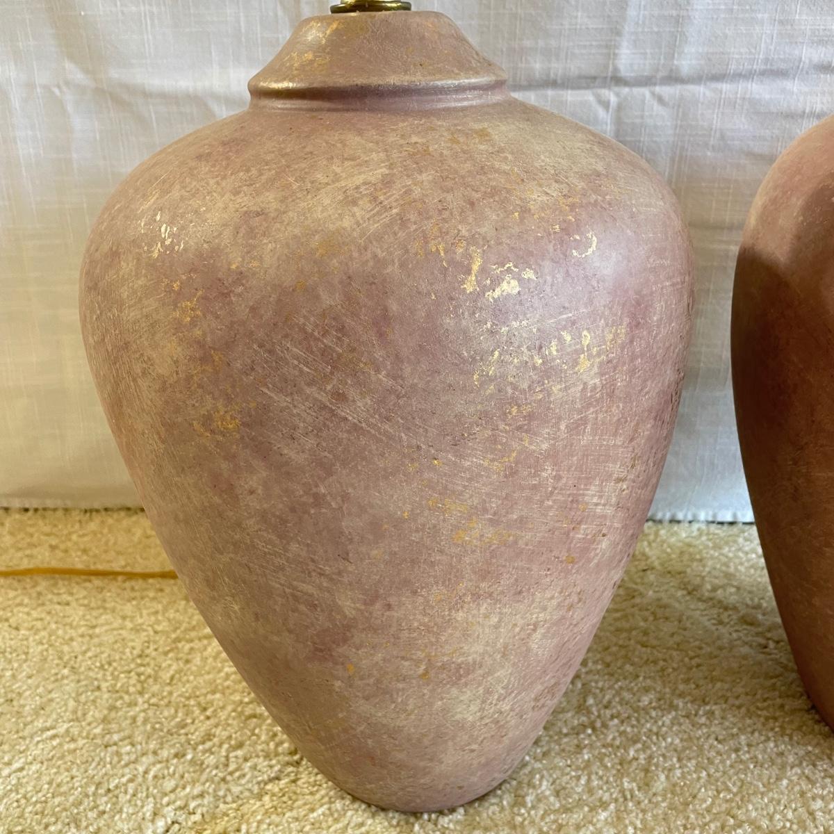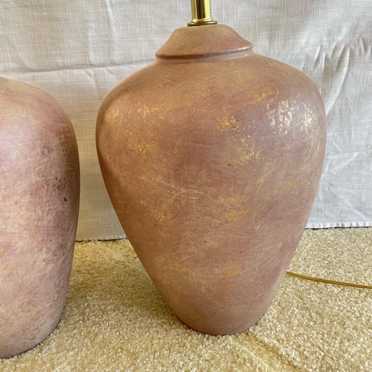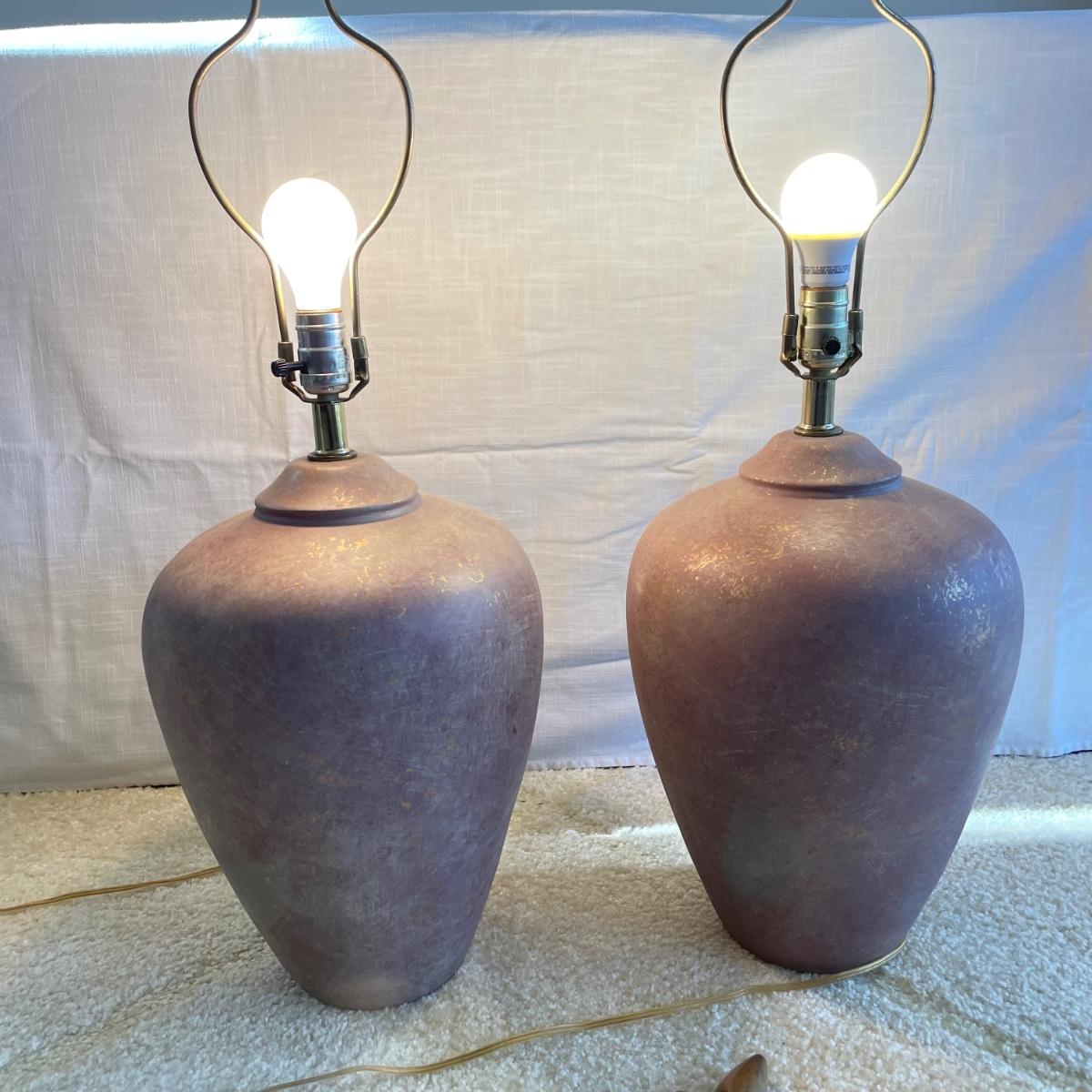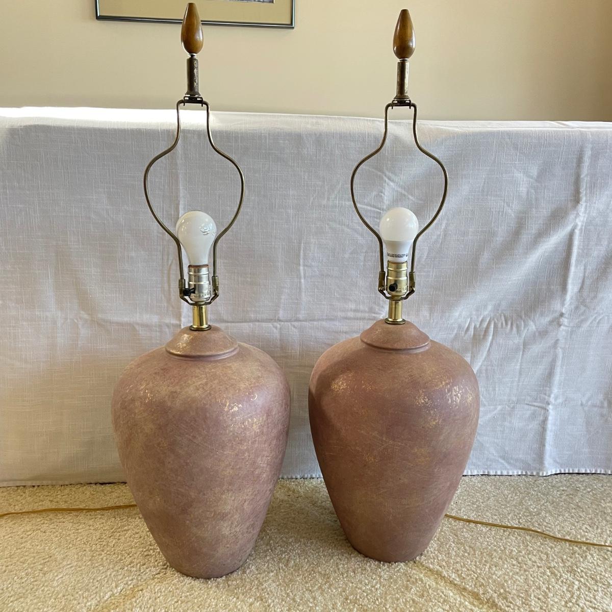 Two page mauve colored ceramic lamps. They each have a brushed matte finish with gold speckles throughout. One lamp is a slightly darker shade of mauve. The lamps operate on a three-way switch and powered on when plugged in. The wooden finials match, but one has come apart from the larger brass piece and sits loosely on top, rather than being screwed in. At the widest point, the lamps have an 11” diameter, they are 33”high to the top of the wooden finial. See images. Local pick up only.