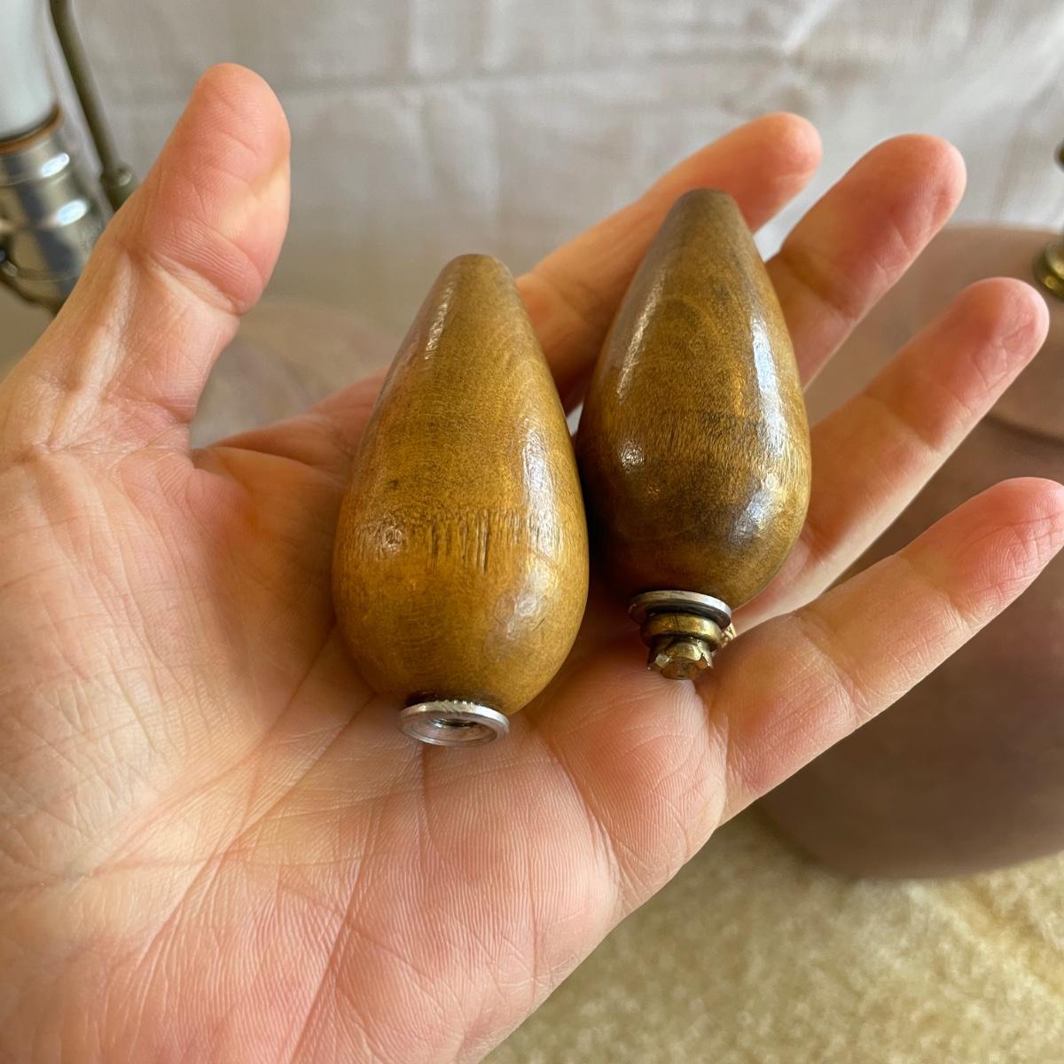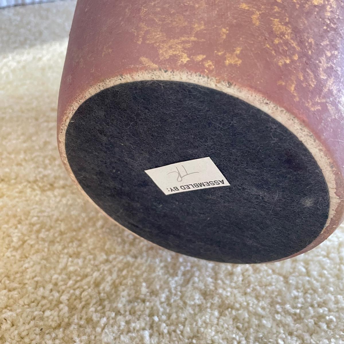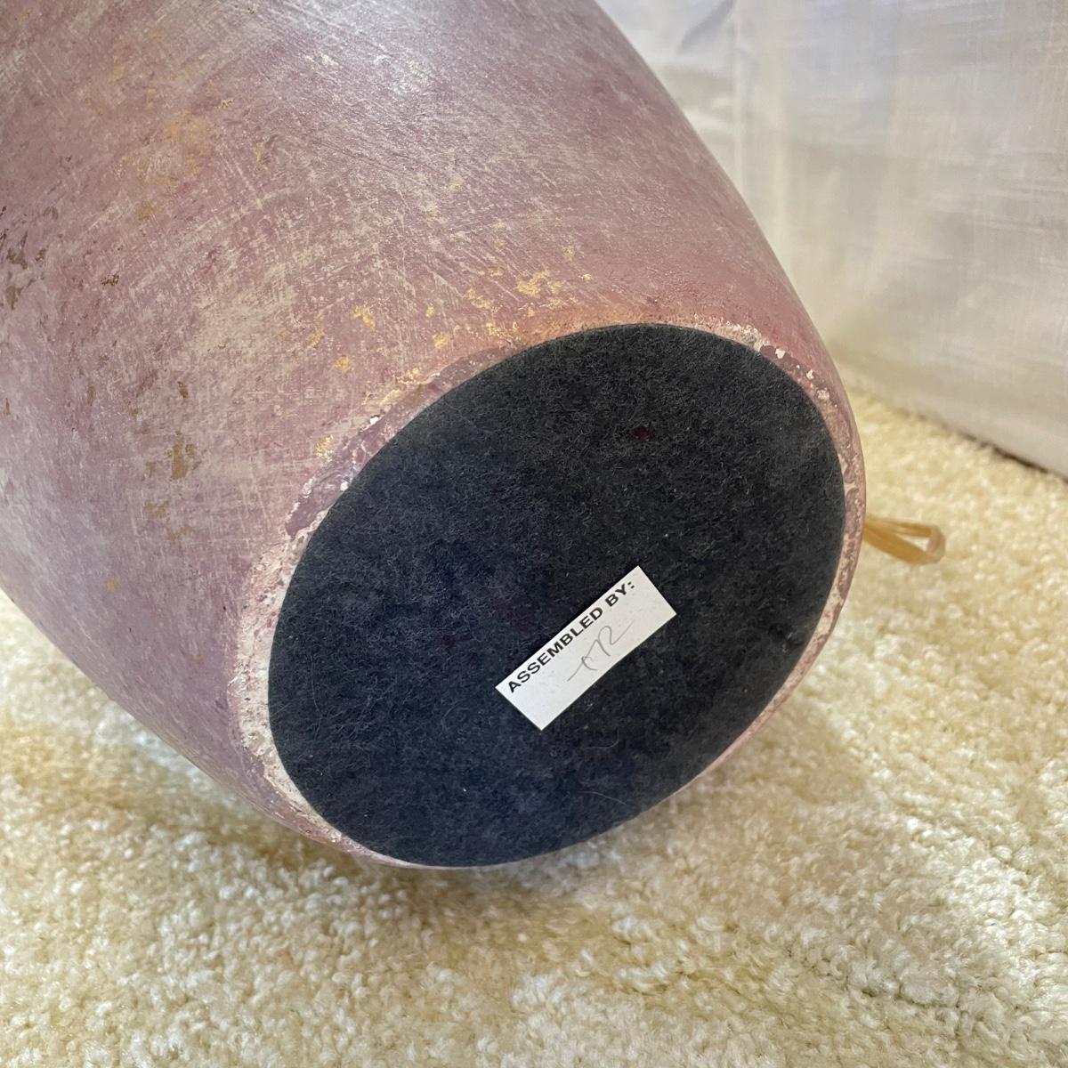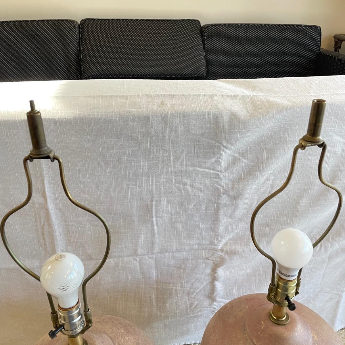 Two page mauve colored ceramic lamps. They each have a brushed matte finish with gold speckles throughout. One lamp is a slightly darker shade of mauve. The lamps operate on a three-way switch and powered on when plugged in. The wooden finials match, but one has come apart from the larger brass piece and sits loosely on top, rather than being screwed in. At the widest point, the lamps have an 11” diameter, they are 33”high to the top of the wooden finial. See images. Local pick up only.