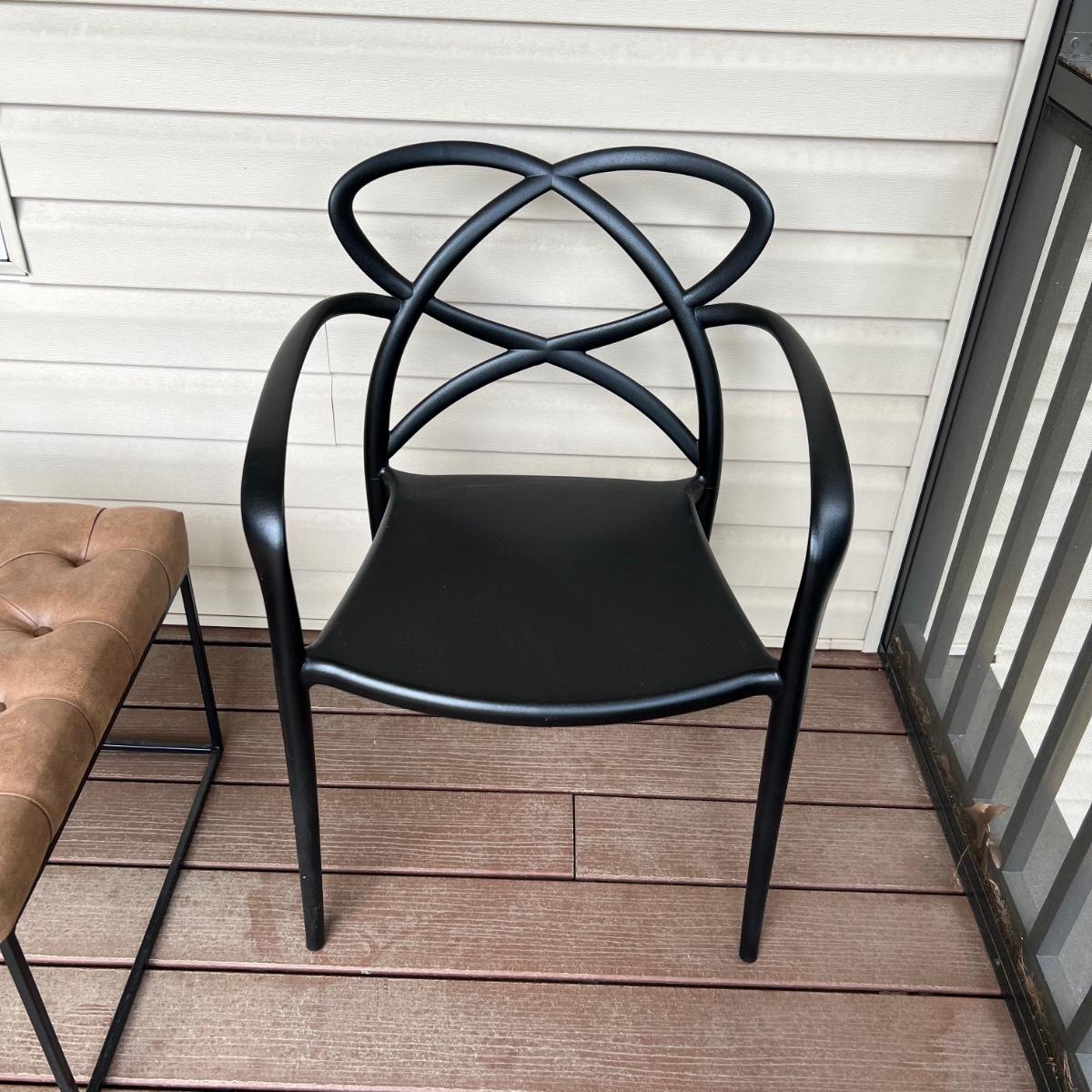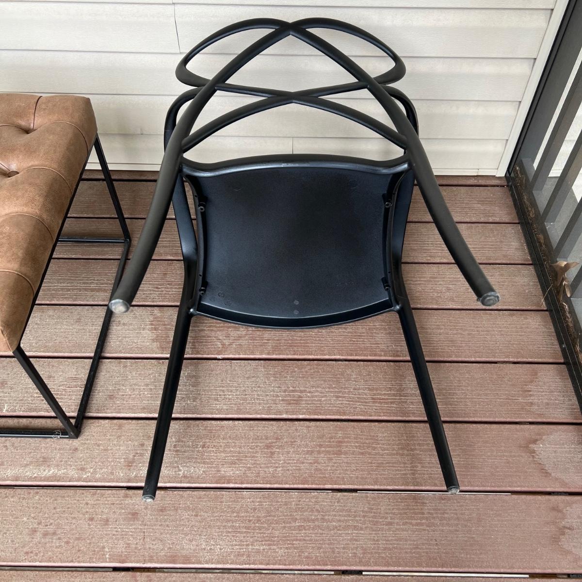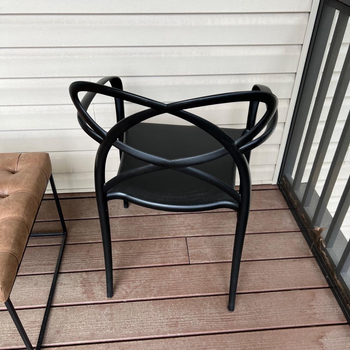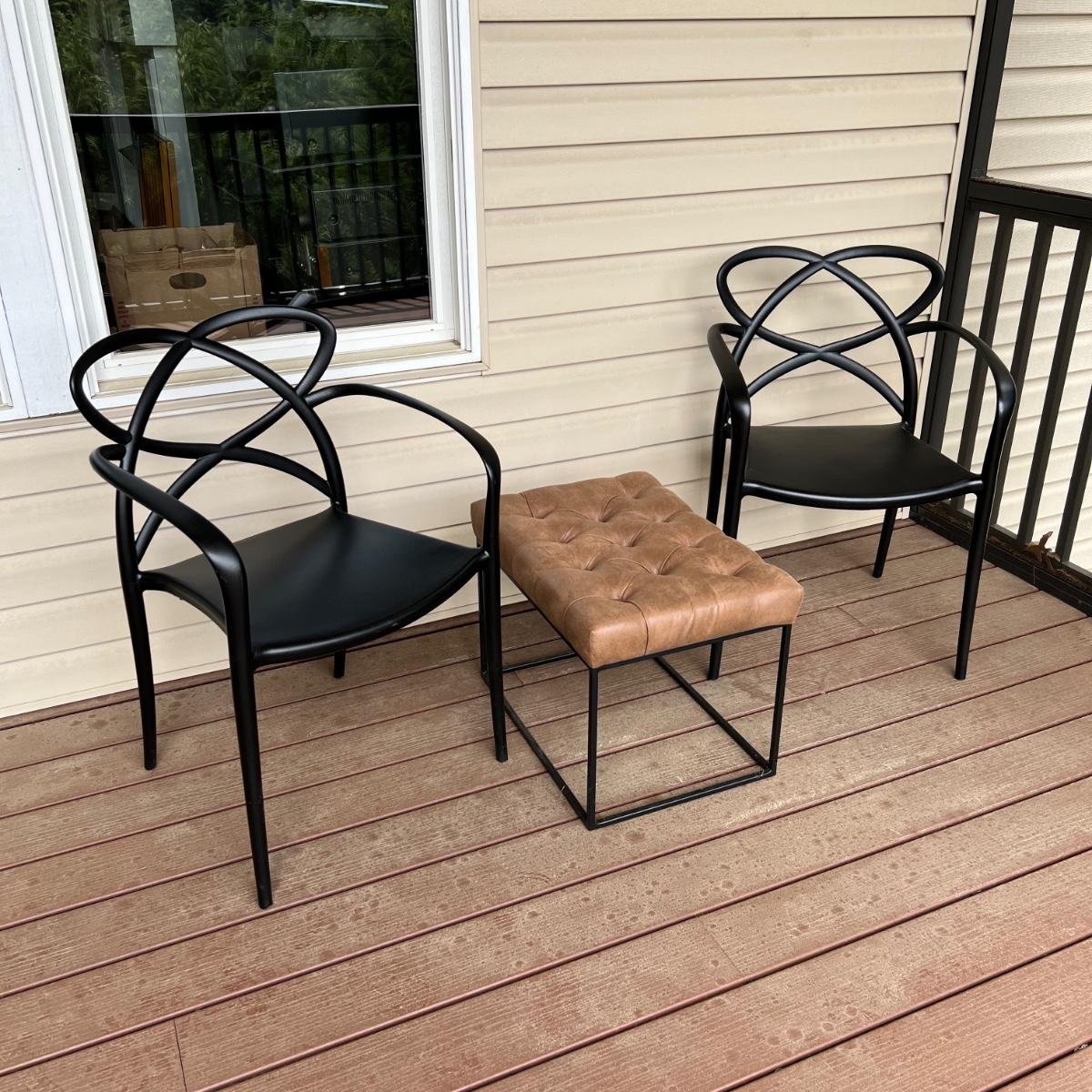 These two matching chairs are black and made from a sturdy hard plastic material. The accompanying ottoman has a faux leather pad on a metal frame.