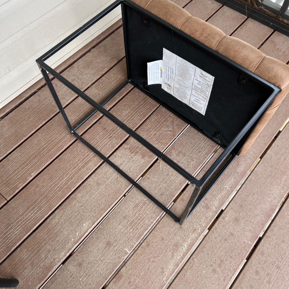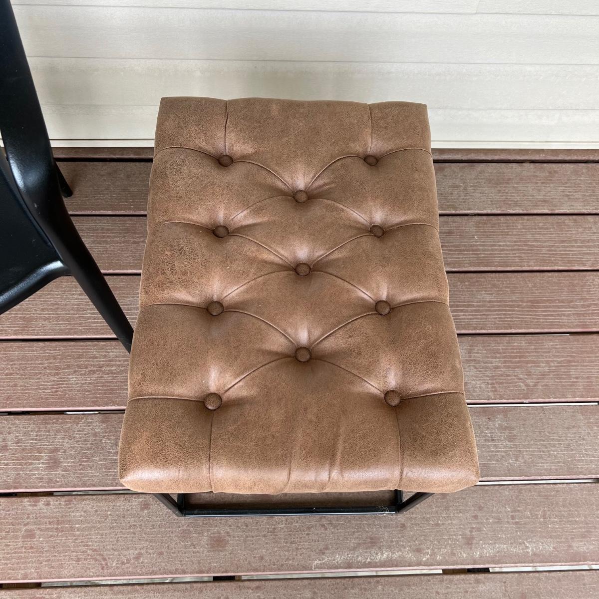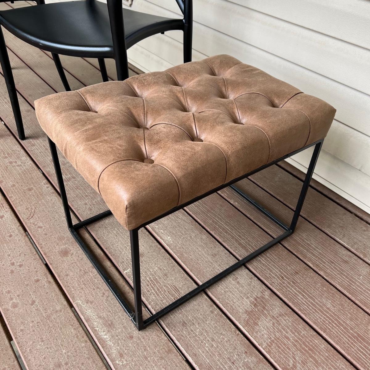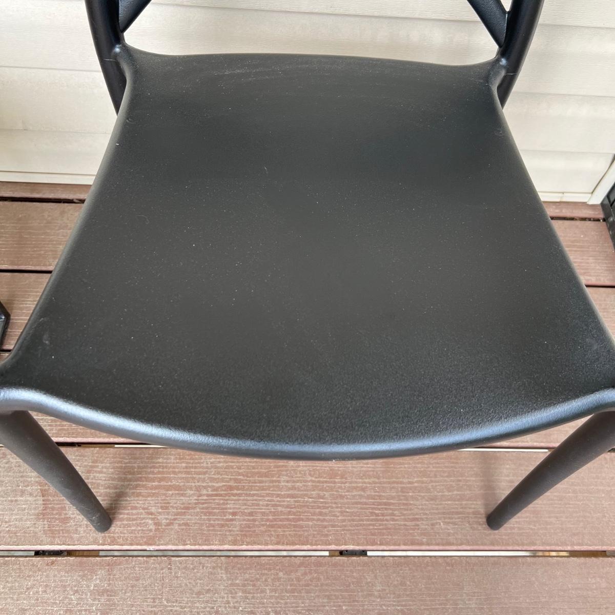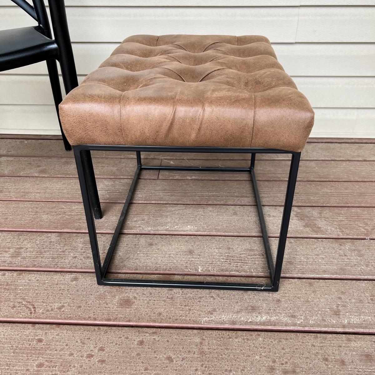 These two matching chairs are black and made from a sturdy hard plastic material. The accompanying ottoman has a faux leather pad on a metal frame.