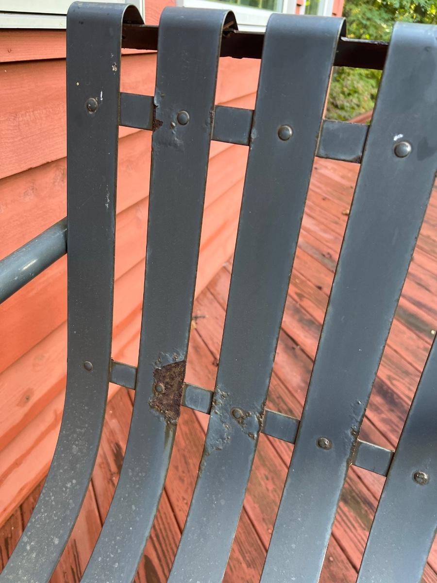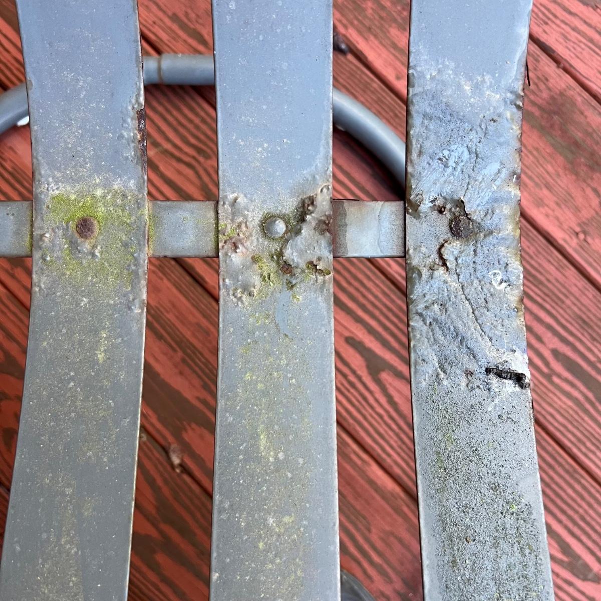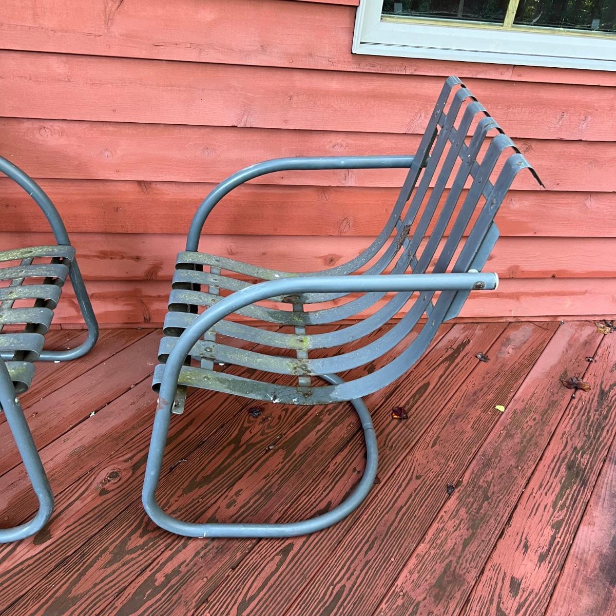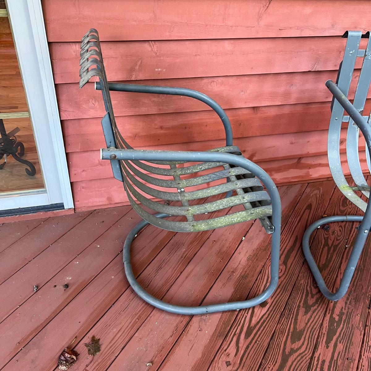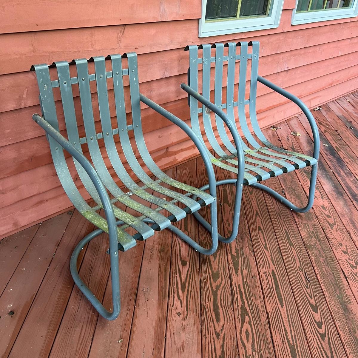This pair of green metal patio chairs measure 20” x 24” x 35”H with 16” seat height. They are sturdy chairs but do have some minor surface rust in places and paint chipping, see images.