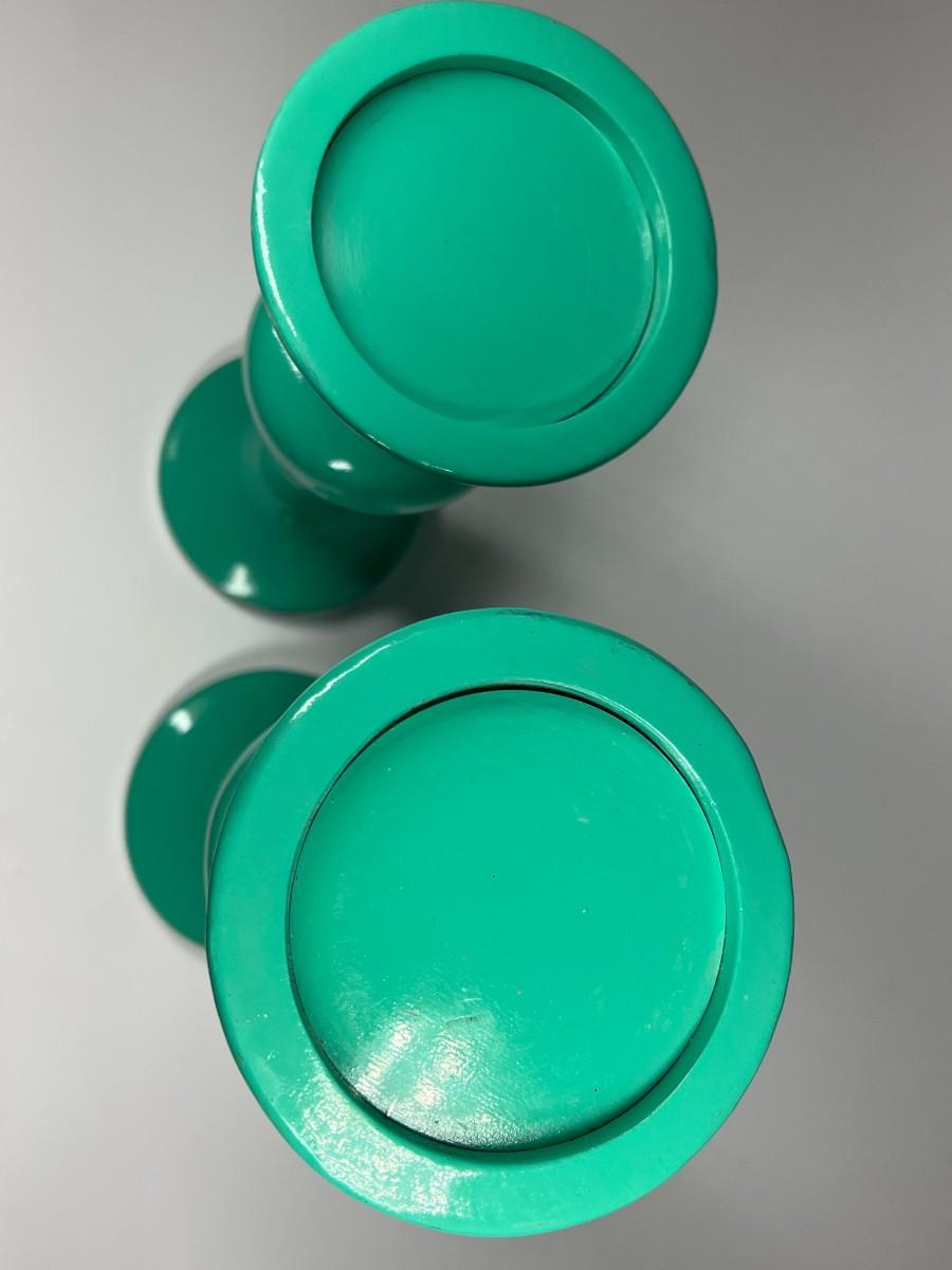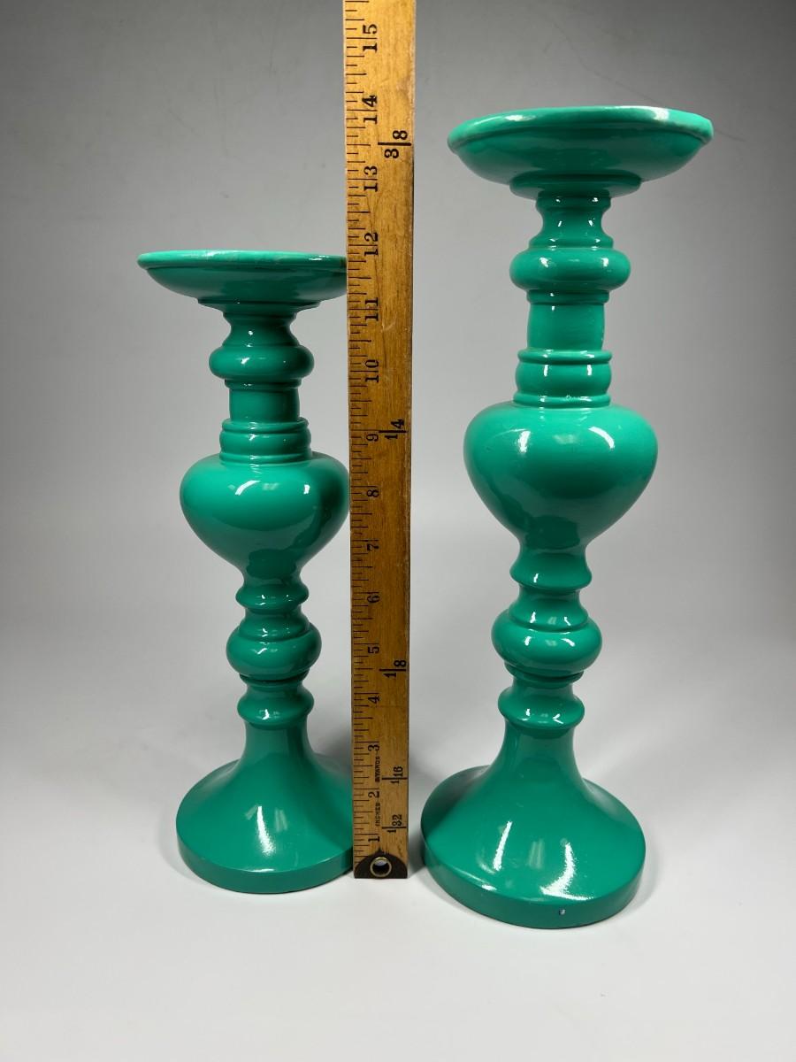 Matching Pair of Mint Green Candle Stick Holders Pillars. In good condition. Different heights. Feel like they are made of heavy plastic or resin.