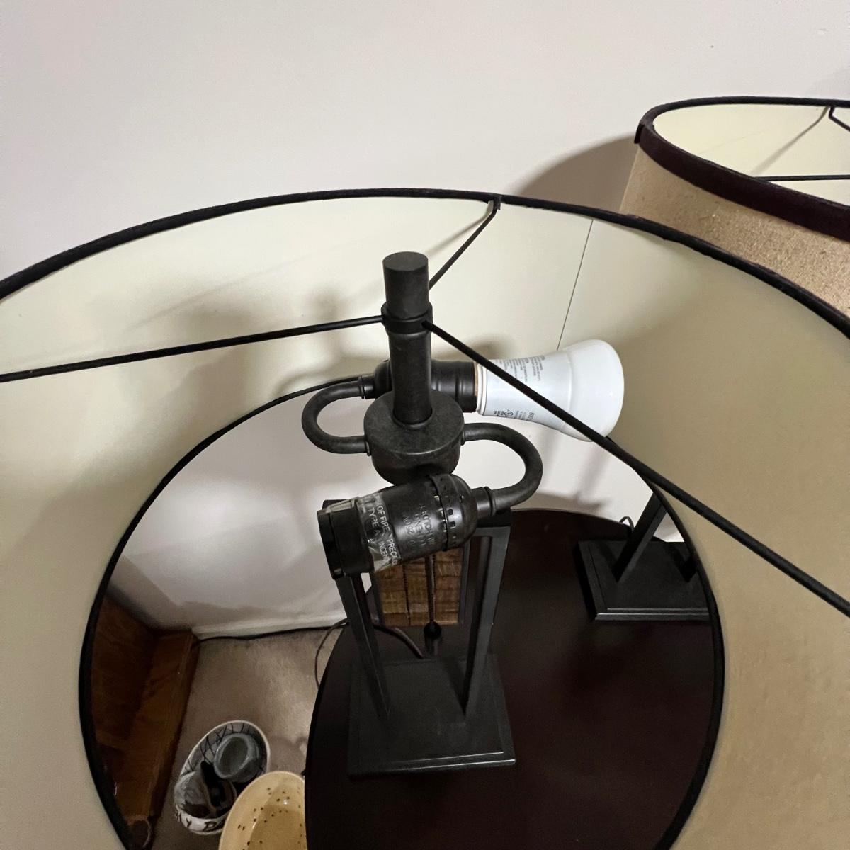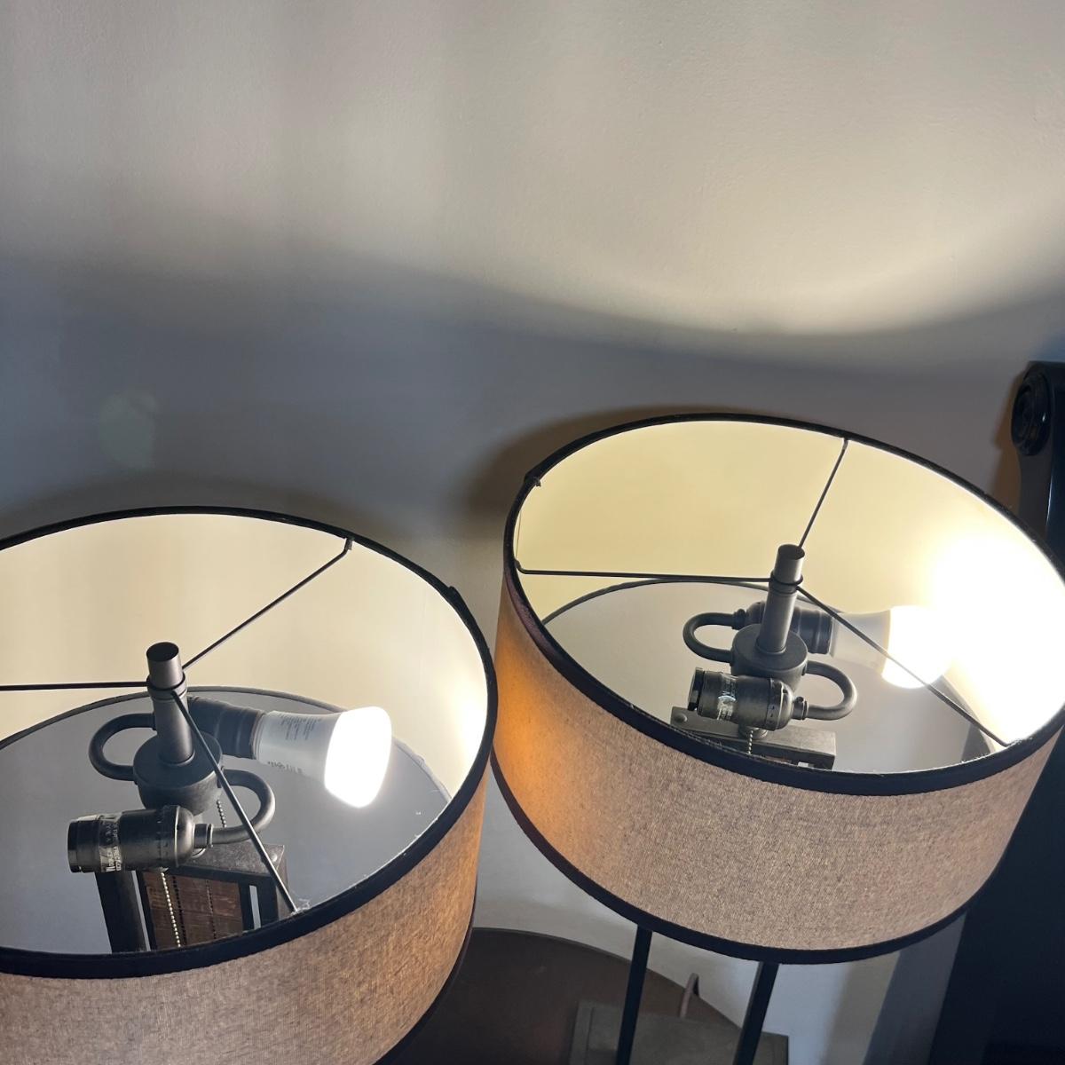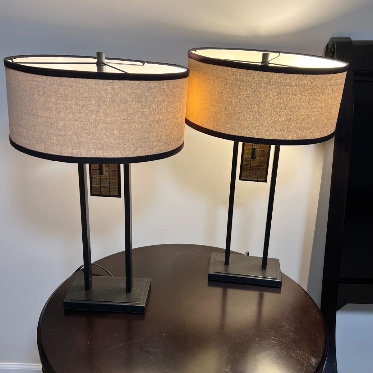 Pair of modern table lamps have an aged bronze metal frame with glass accent. The shades are a tan color with brown trim. Lamps have double bulbs with pull chains and are single switches. They both measure 5” x 8” x 24”H (to top of shade which. Measures 15”D).