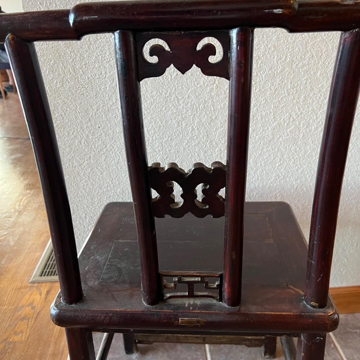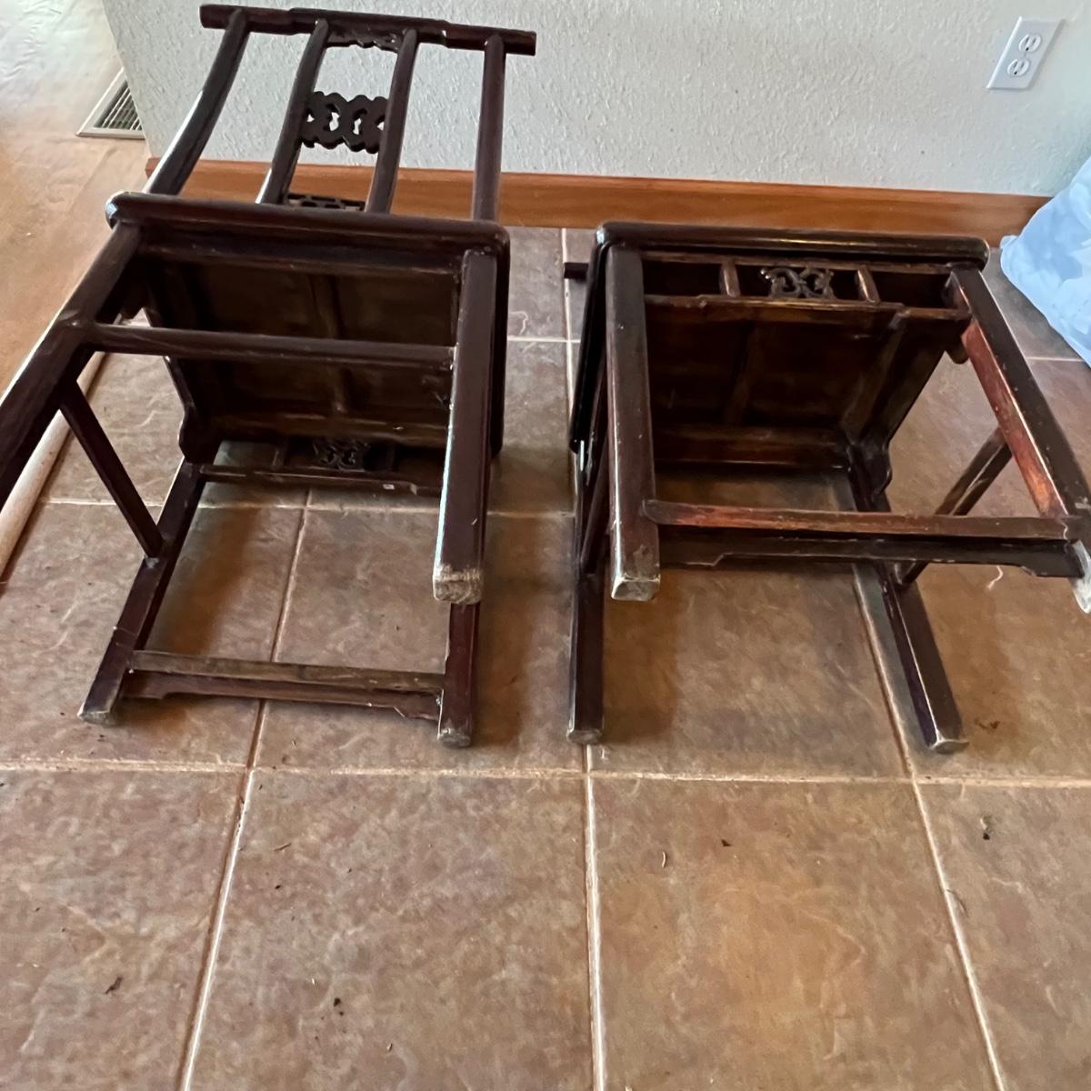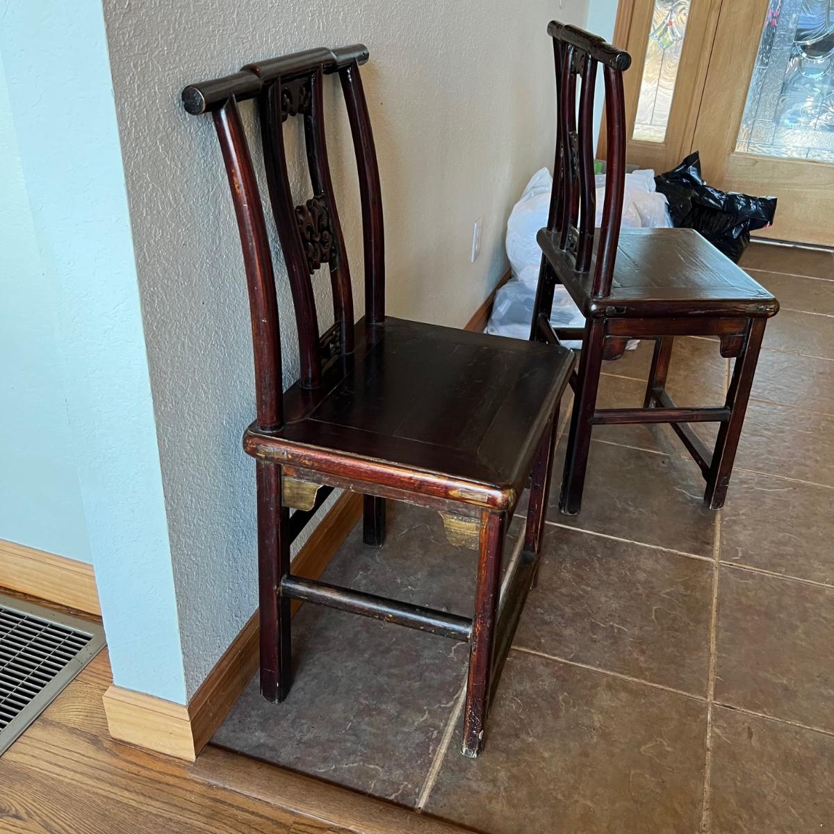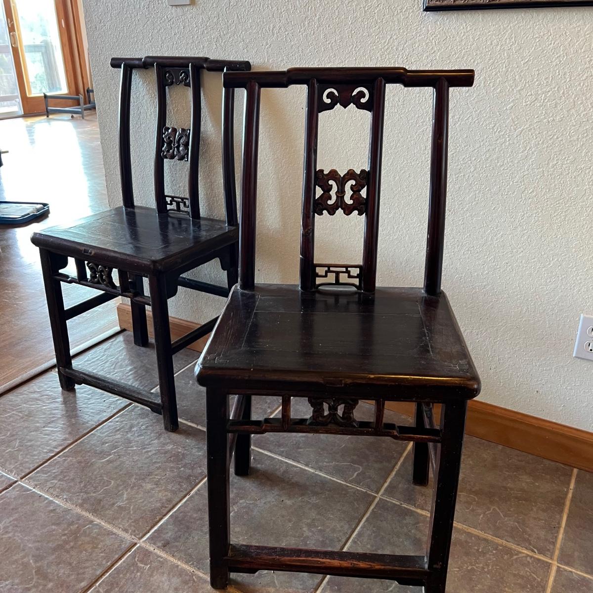 These matching chairs are solid wood with wedge joints throughout. They have a rich red/brown lacquer and ornate carved detailing. Both are in great condition with very minor signs of wear.