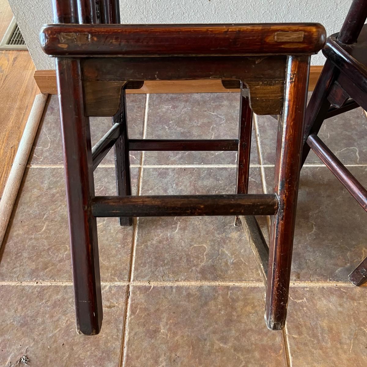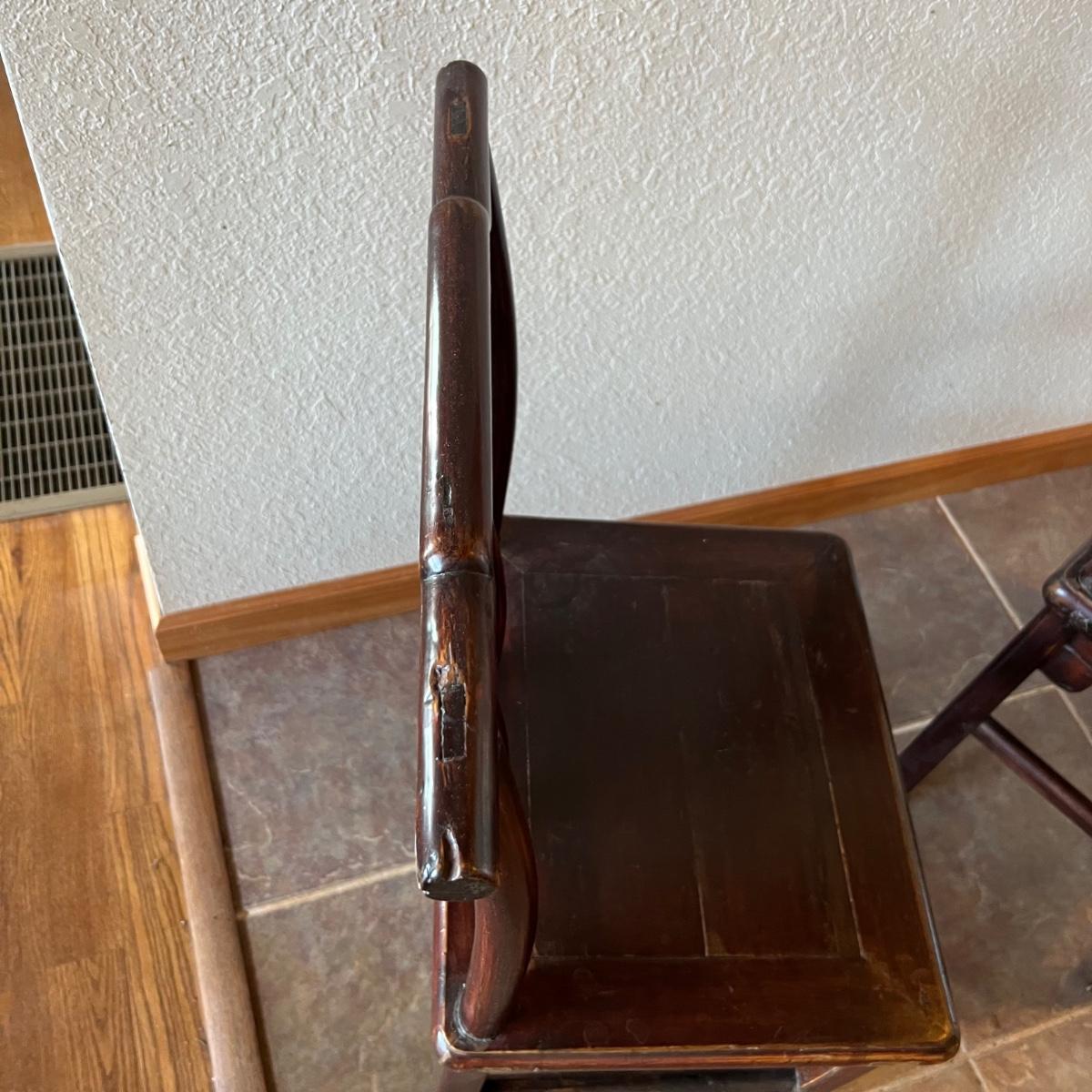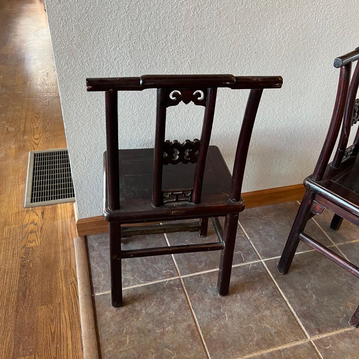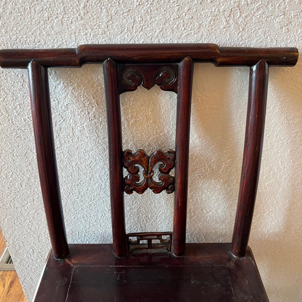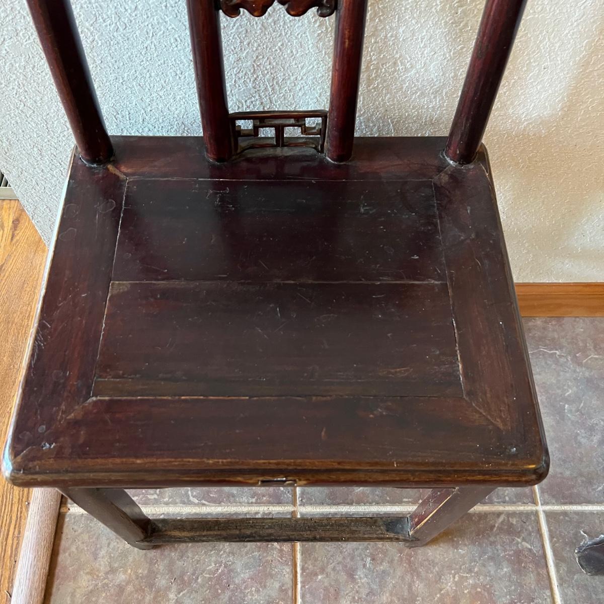 These matching chairs are solid wood with wedge joints throughout. They have a rich red/brown lacquer and ornate carved detailing. Both are in great condition with very minor signs of wear.