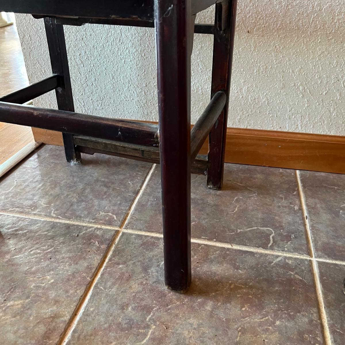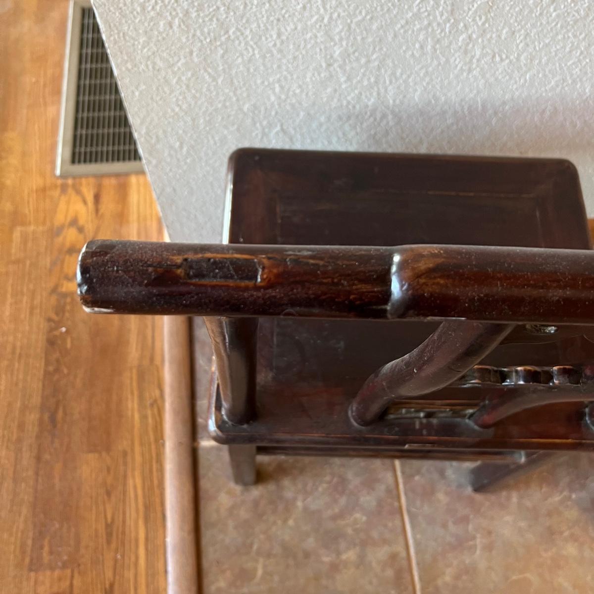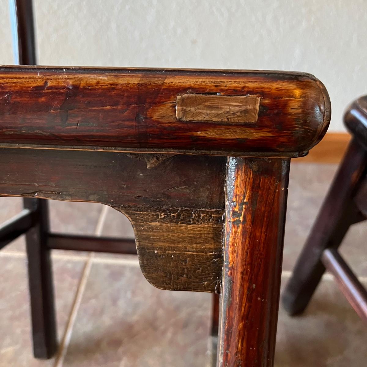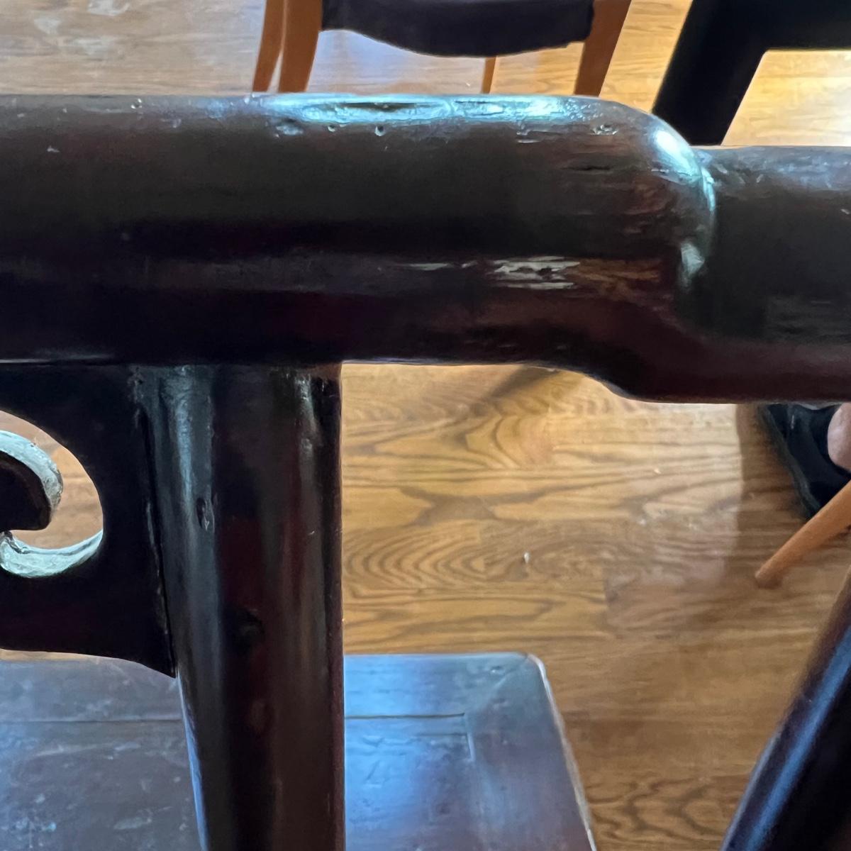 These matching chairs are solid wood with wedge joints throughout. They have a rich red/brown lacquer and ornate carved detailing. Both are in great condition with very minor signs of wear.
