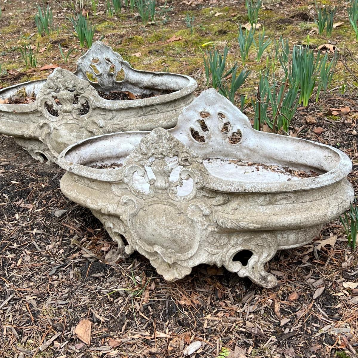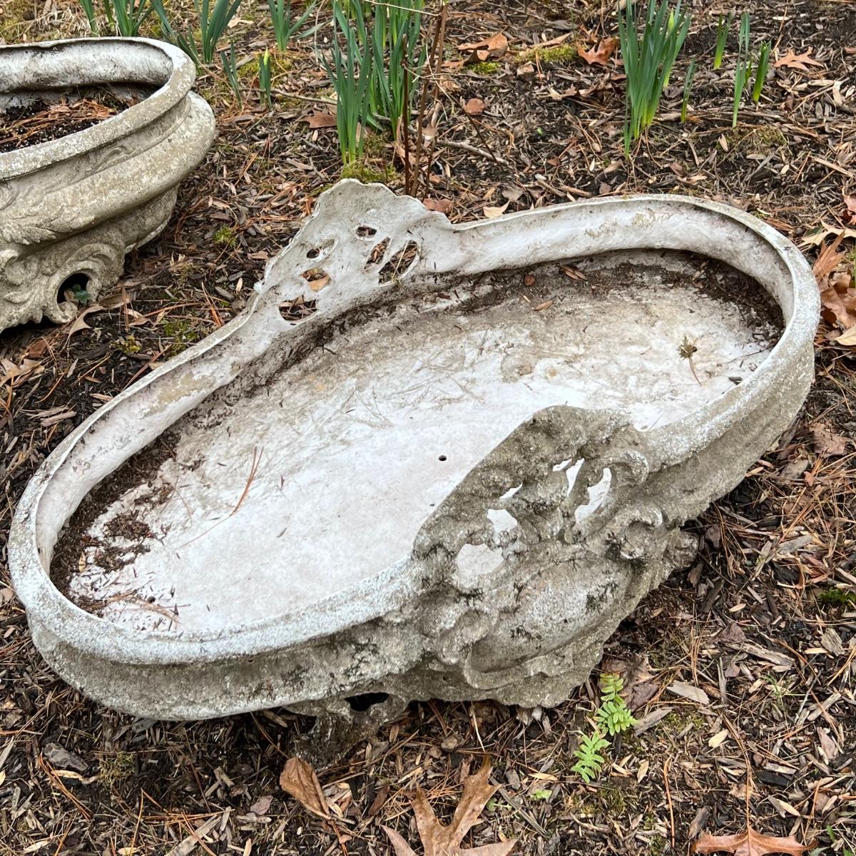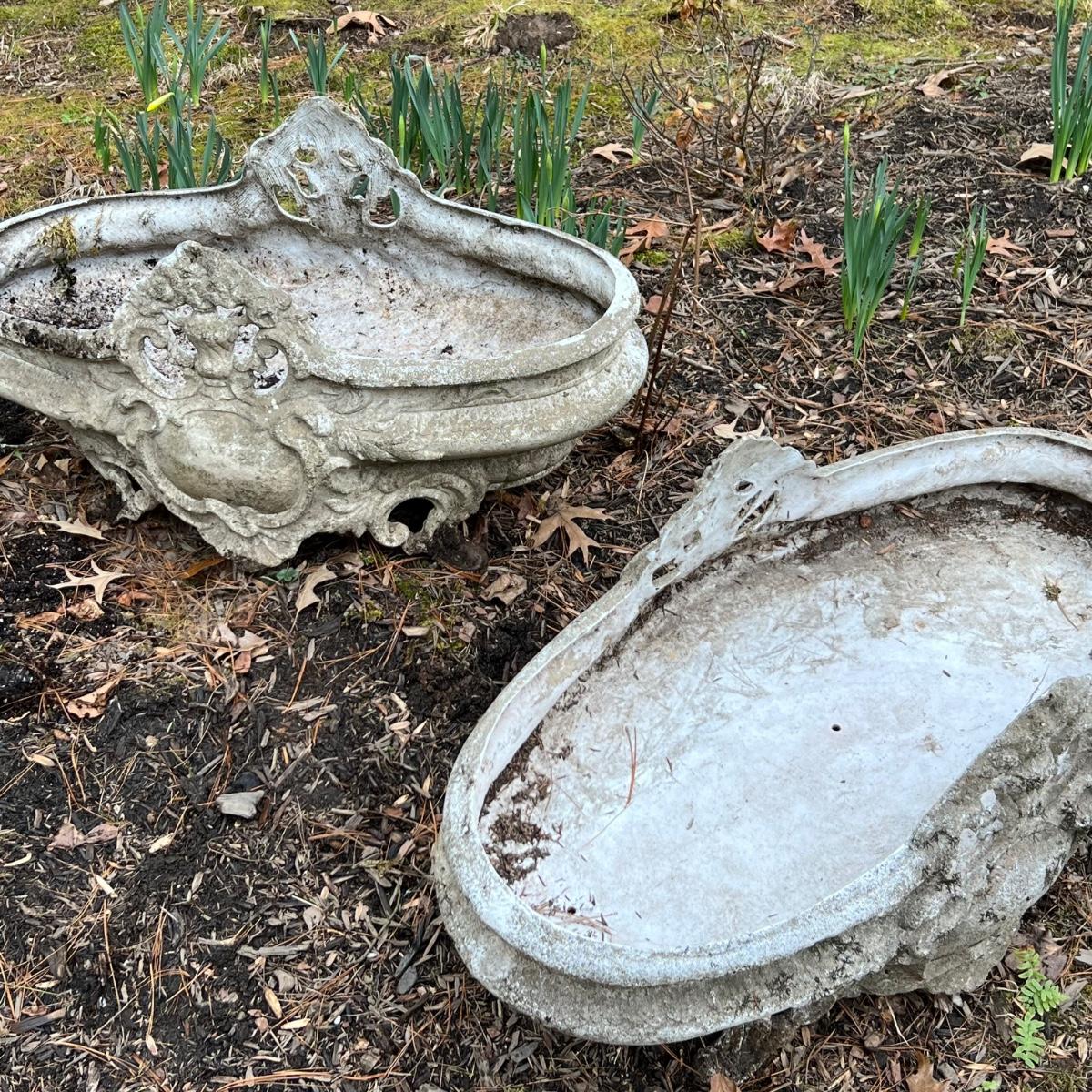 This matching pair of ornate plant pots are a lightweight plastic material but certainly look like they are made of concrete.