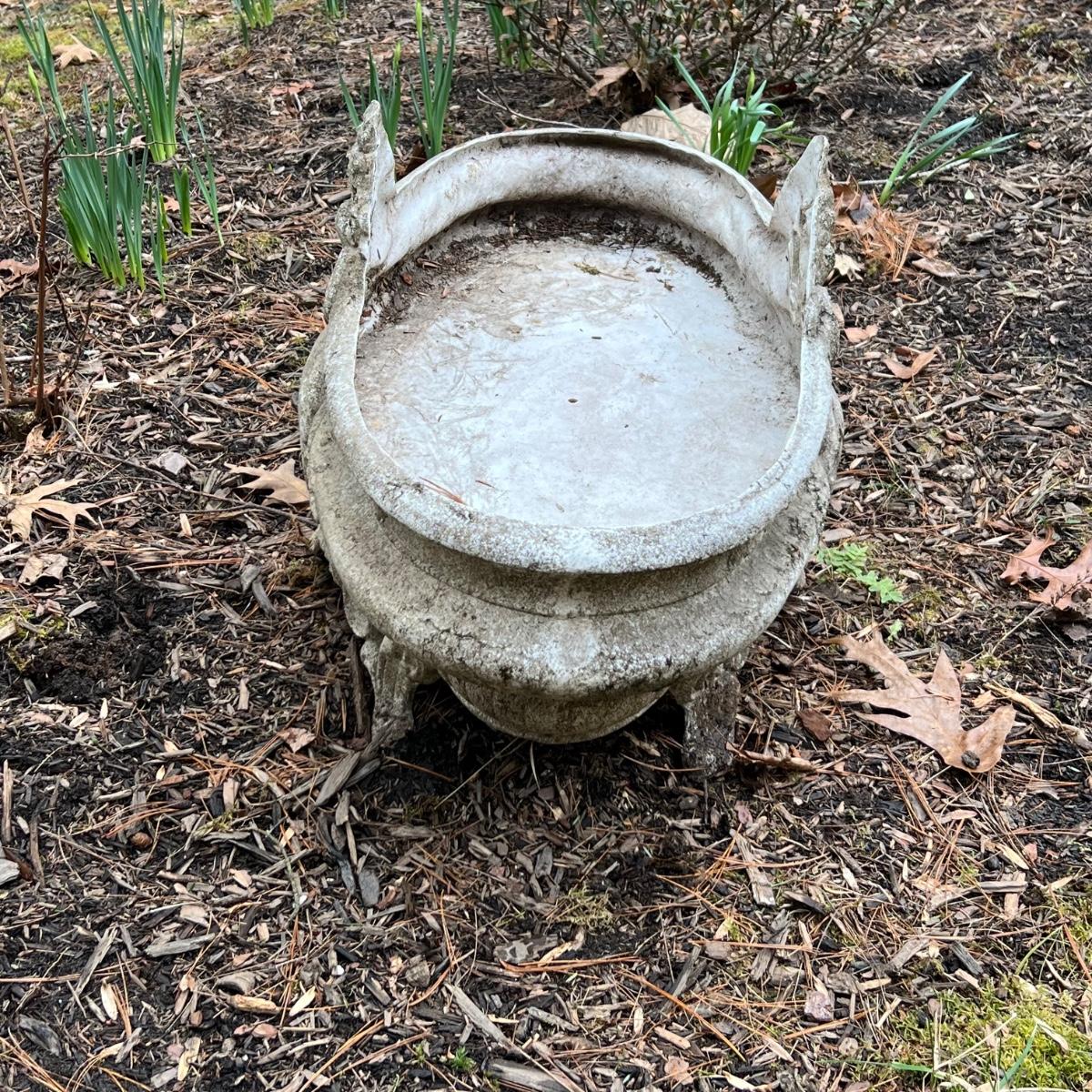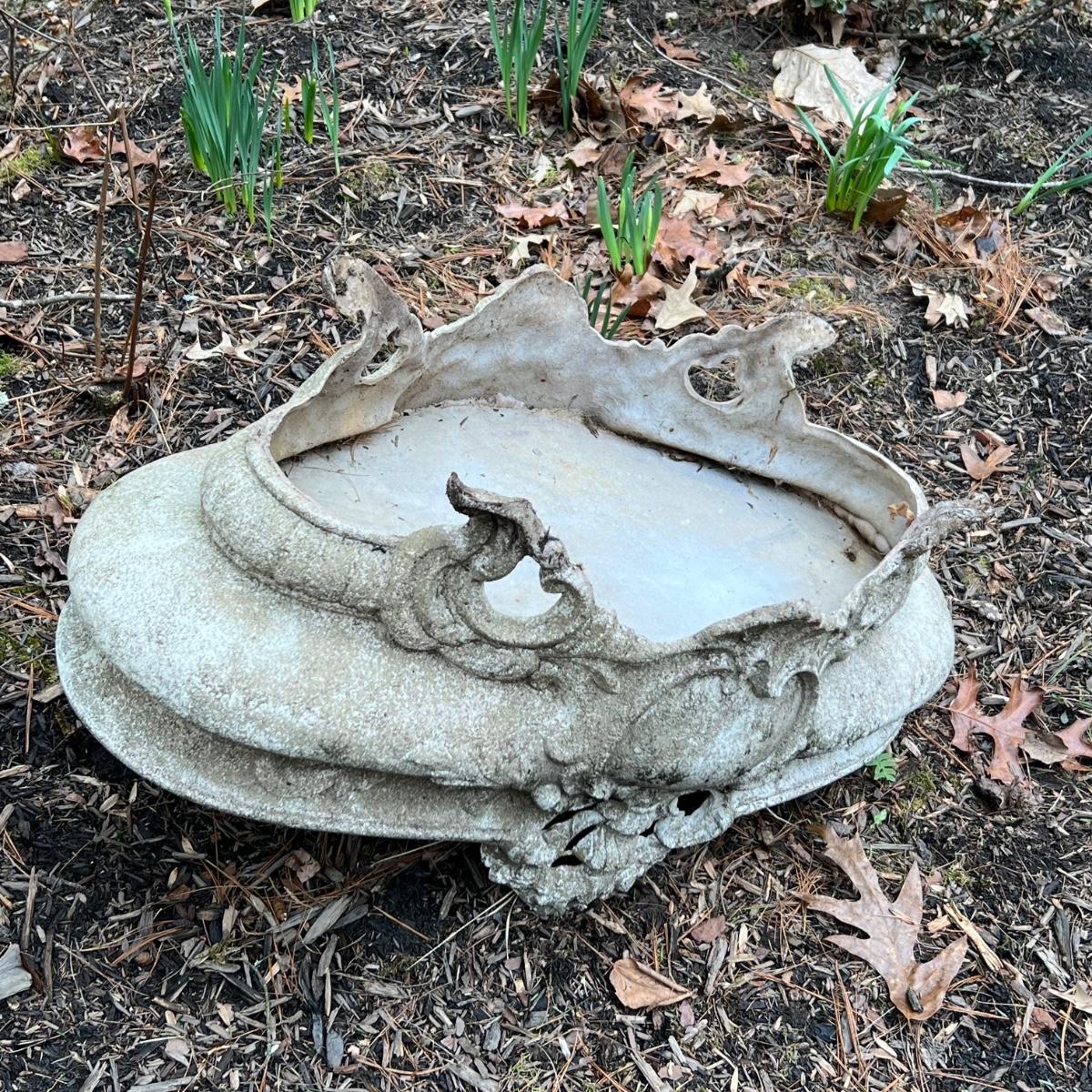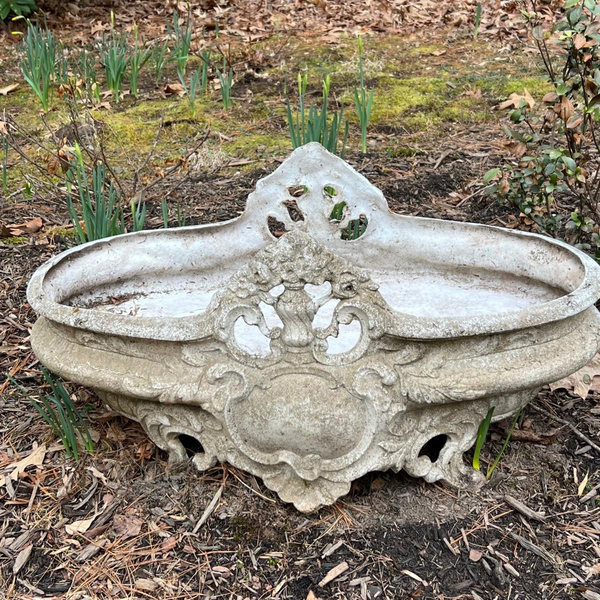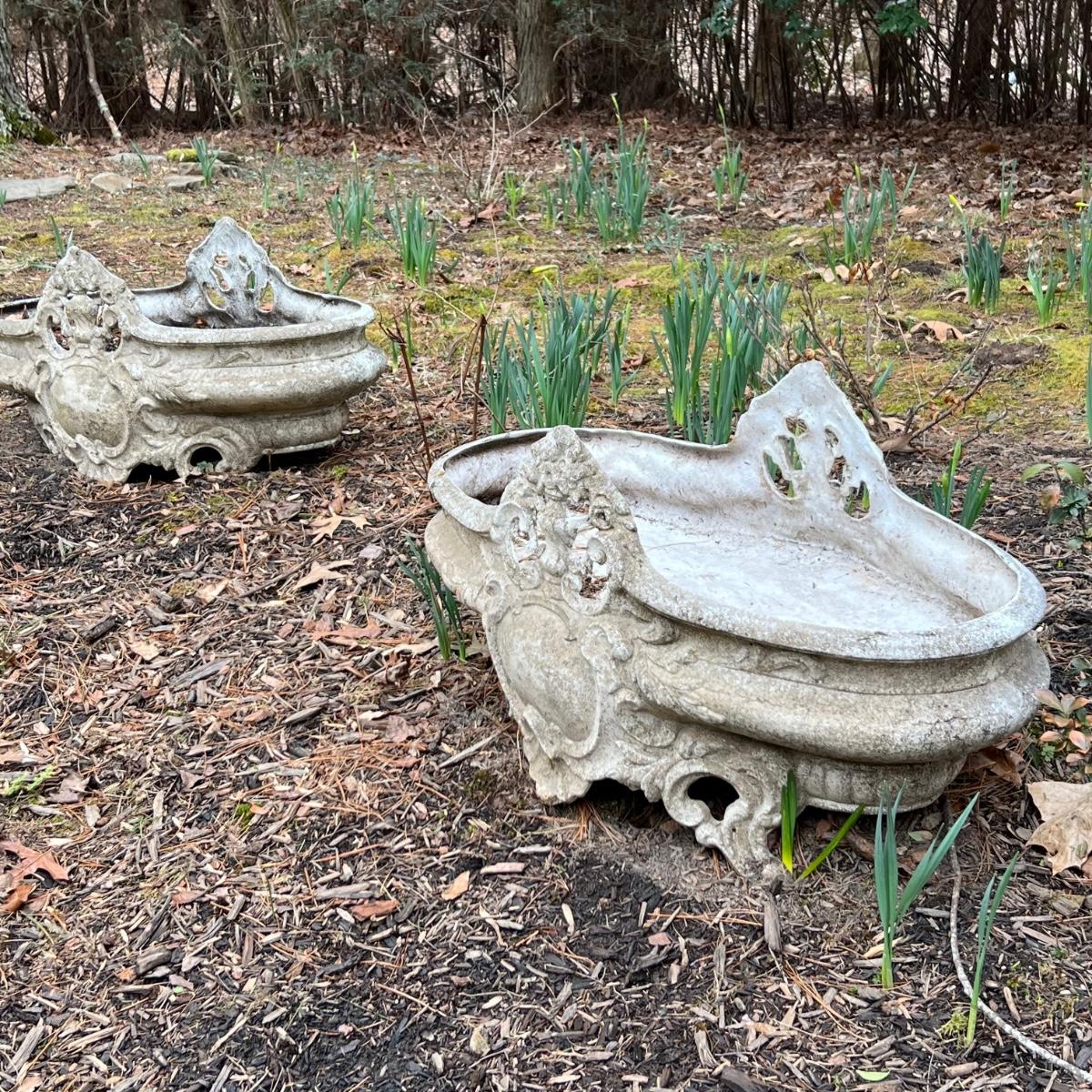 This matching pair of ornate plant pots are a lightweight plastic material but certainly look like they are made of concrete.