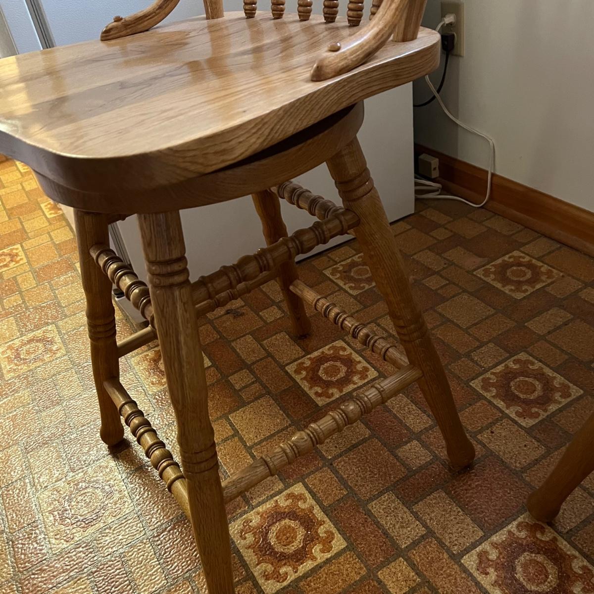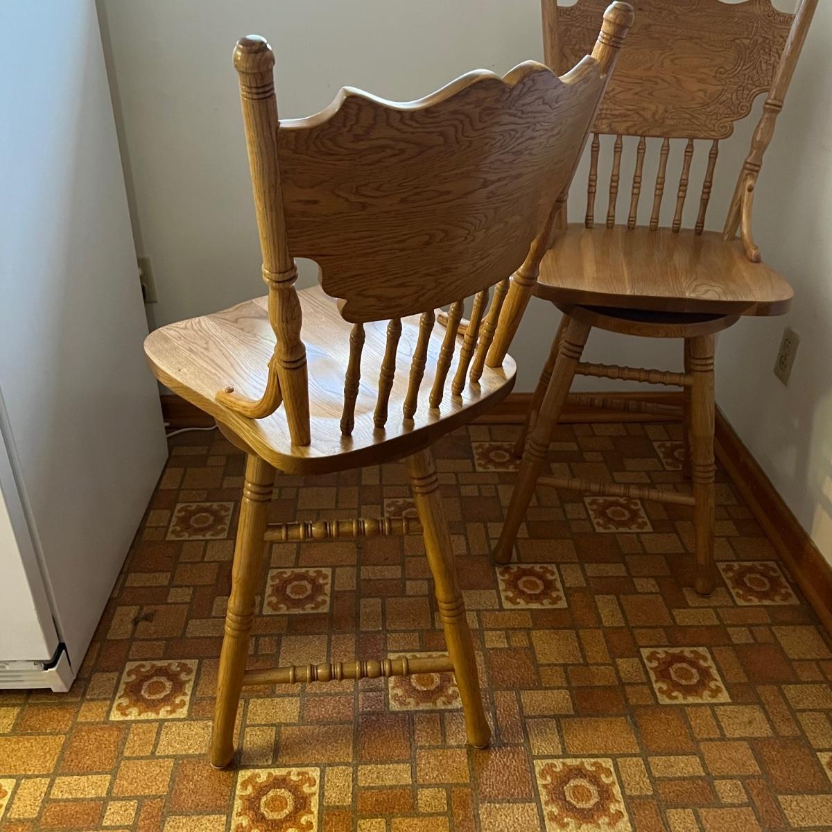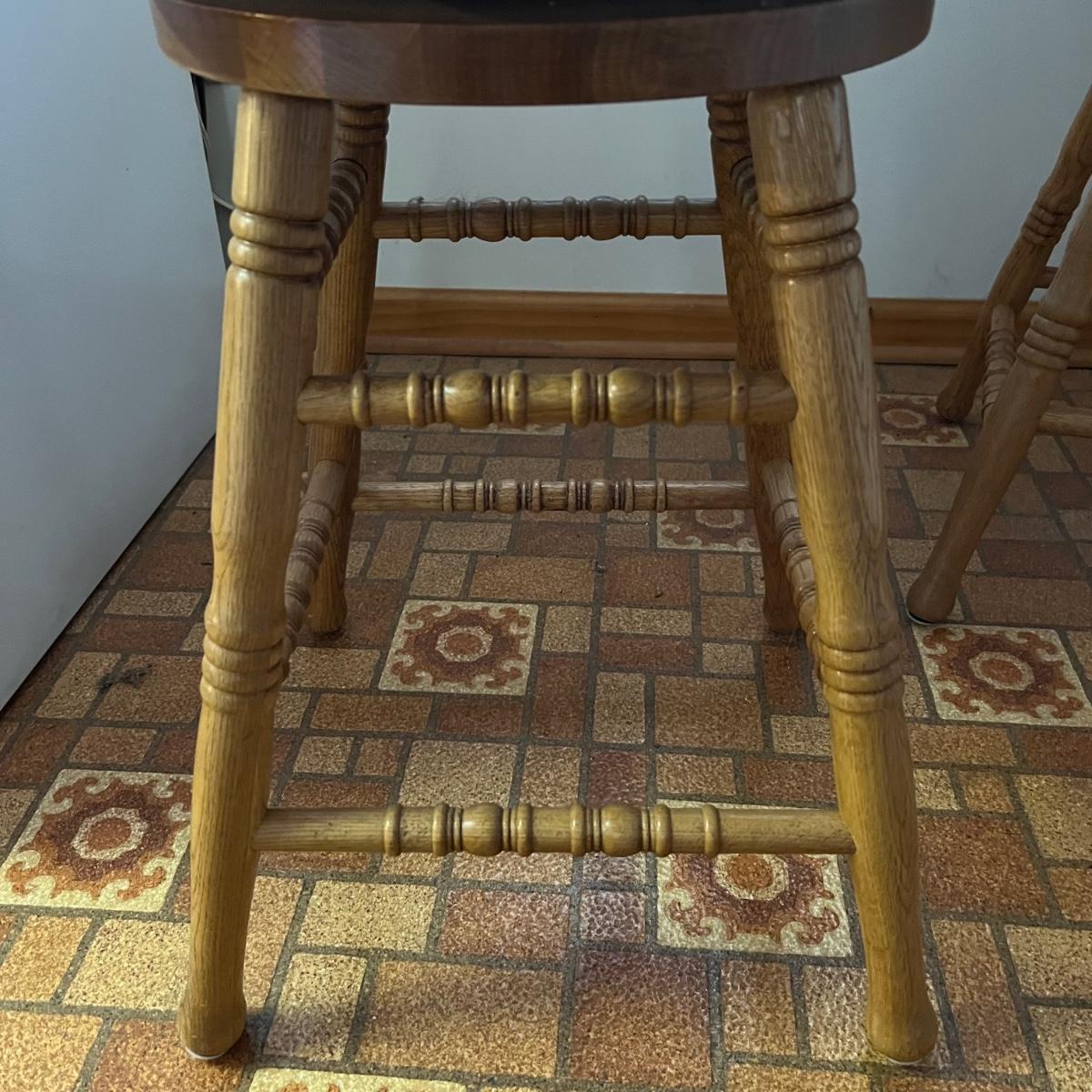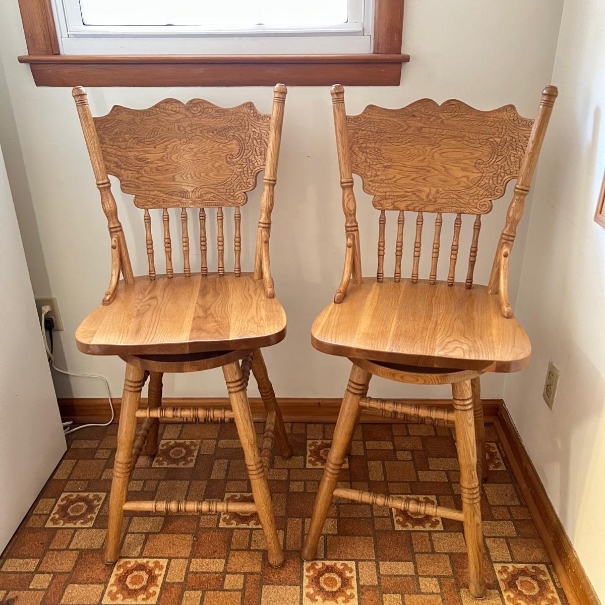 These two stools are in very good condition. They are solid wood and appear to be oak with some carved details. Both chairs swivel smoothly.