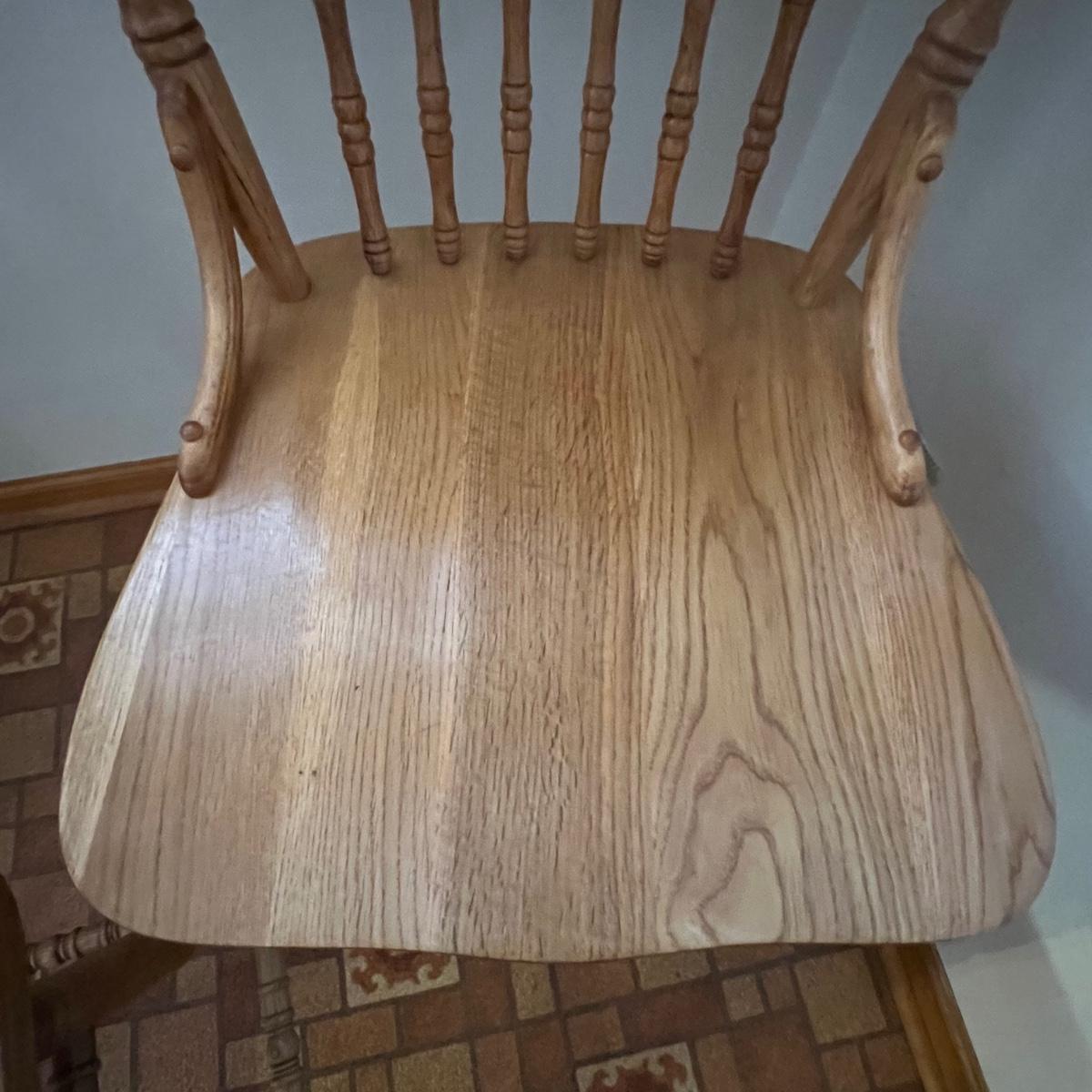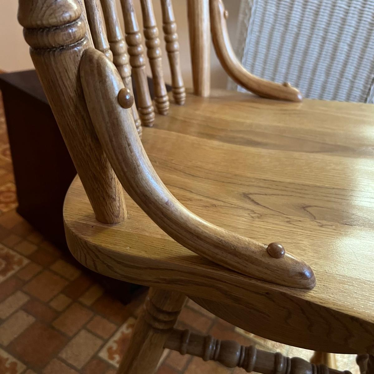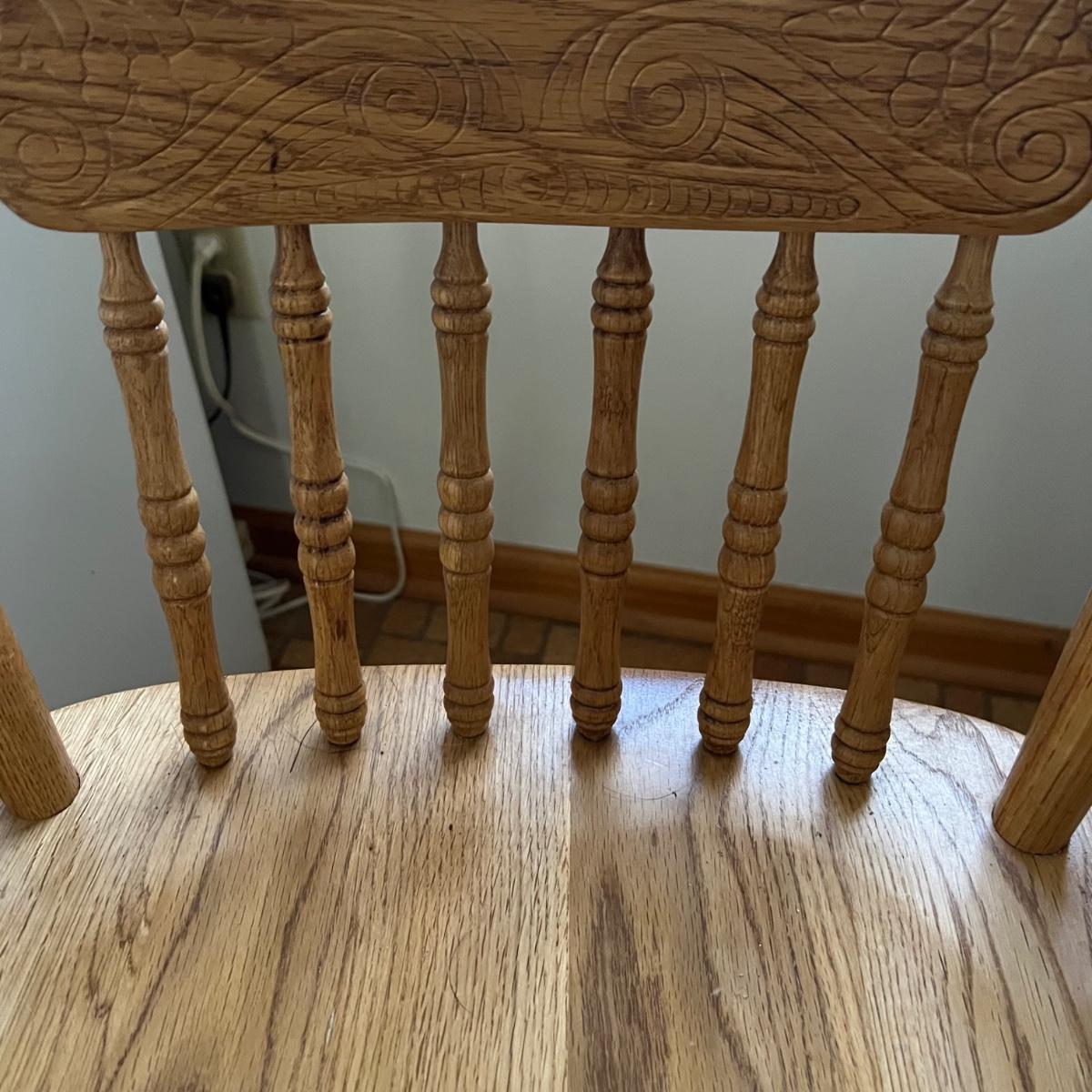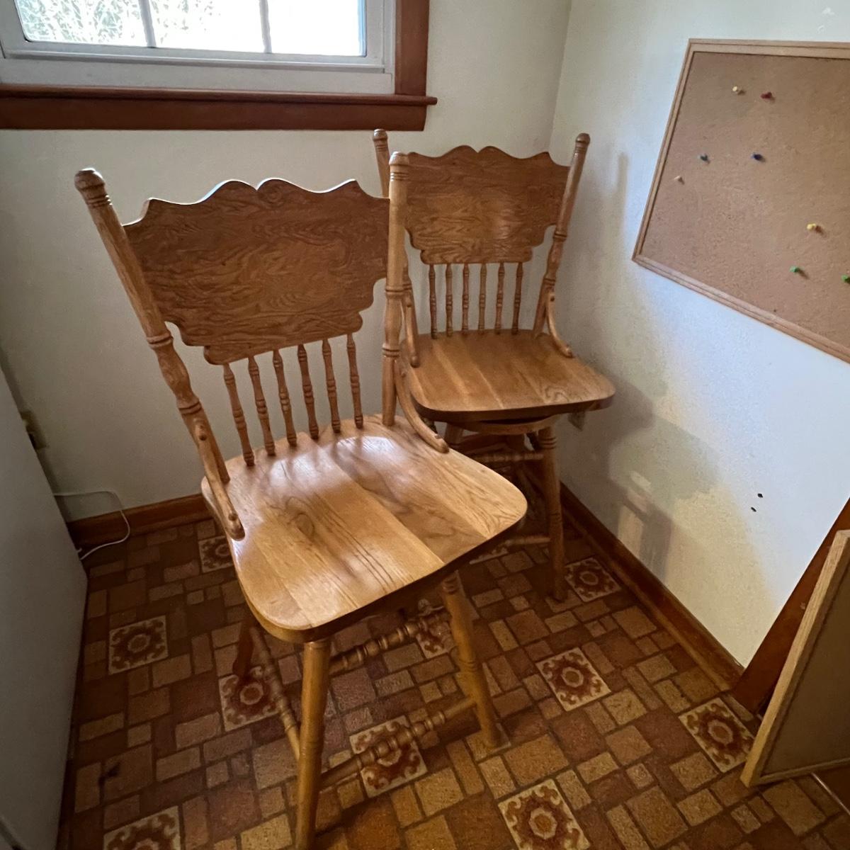 These two stools are in very good condition. They are solid wood and appear to be oak with some carved details. Both chairs swivel smoothly.