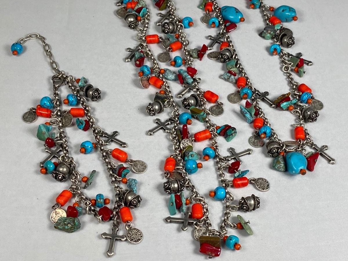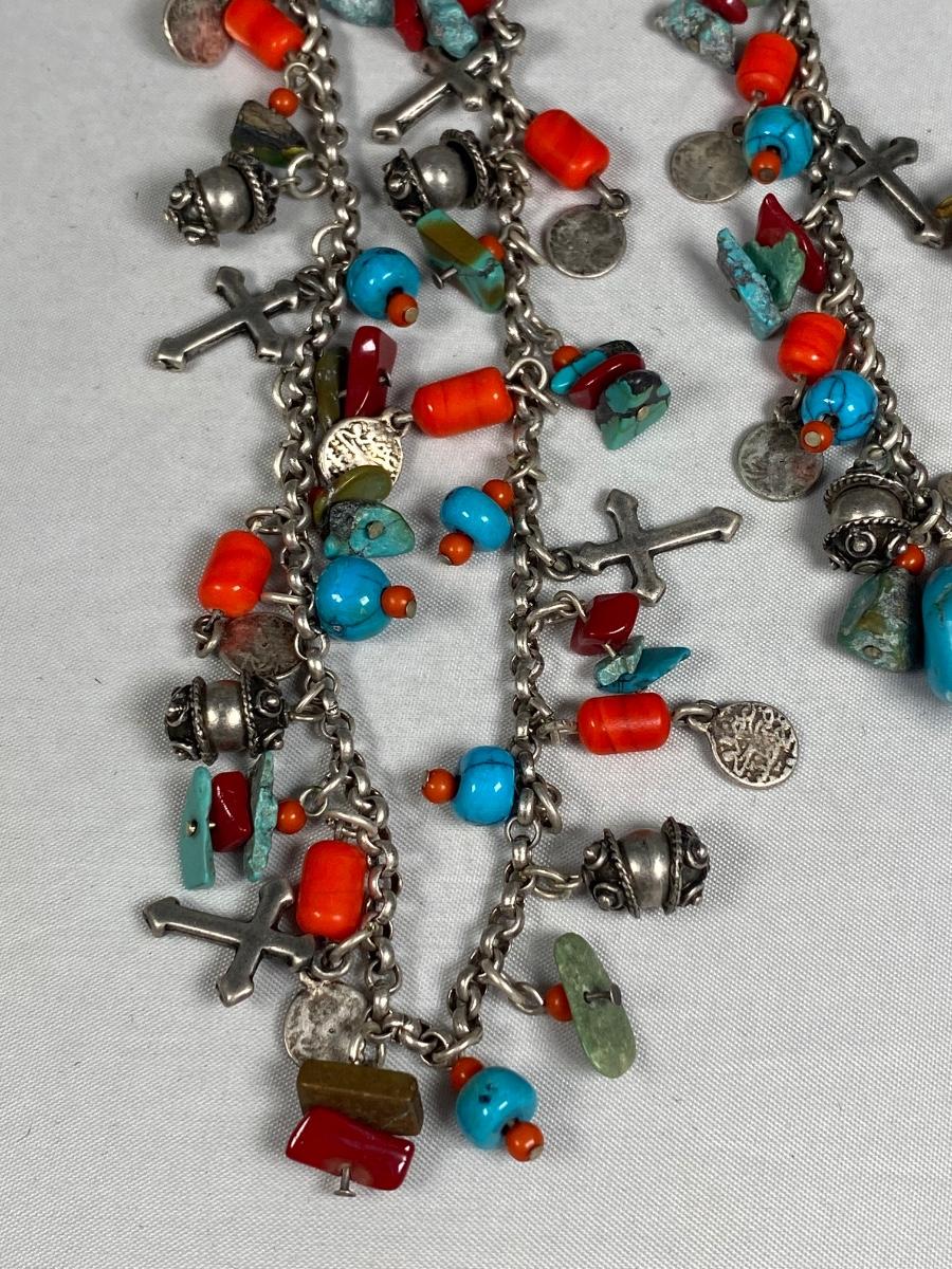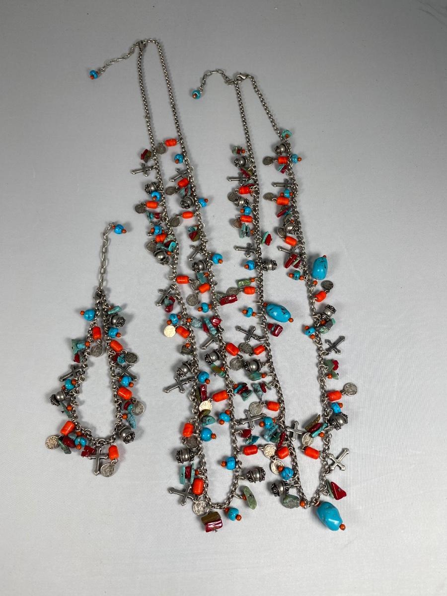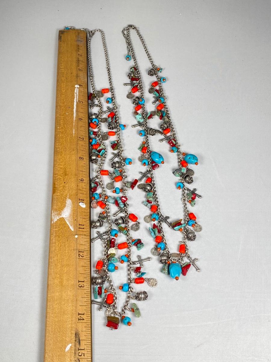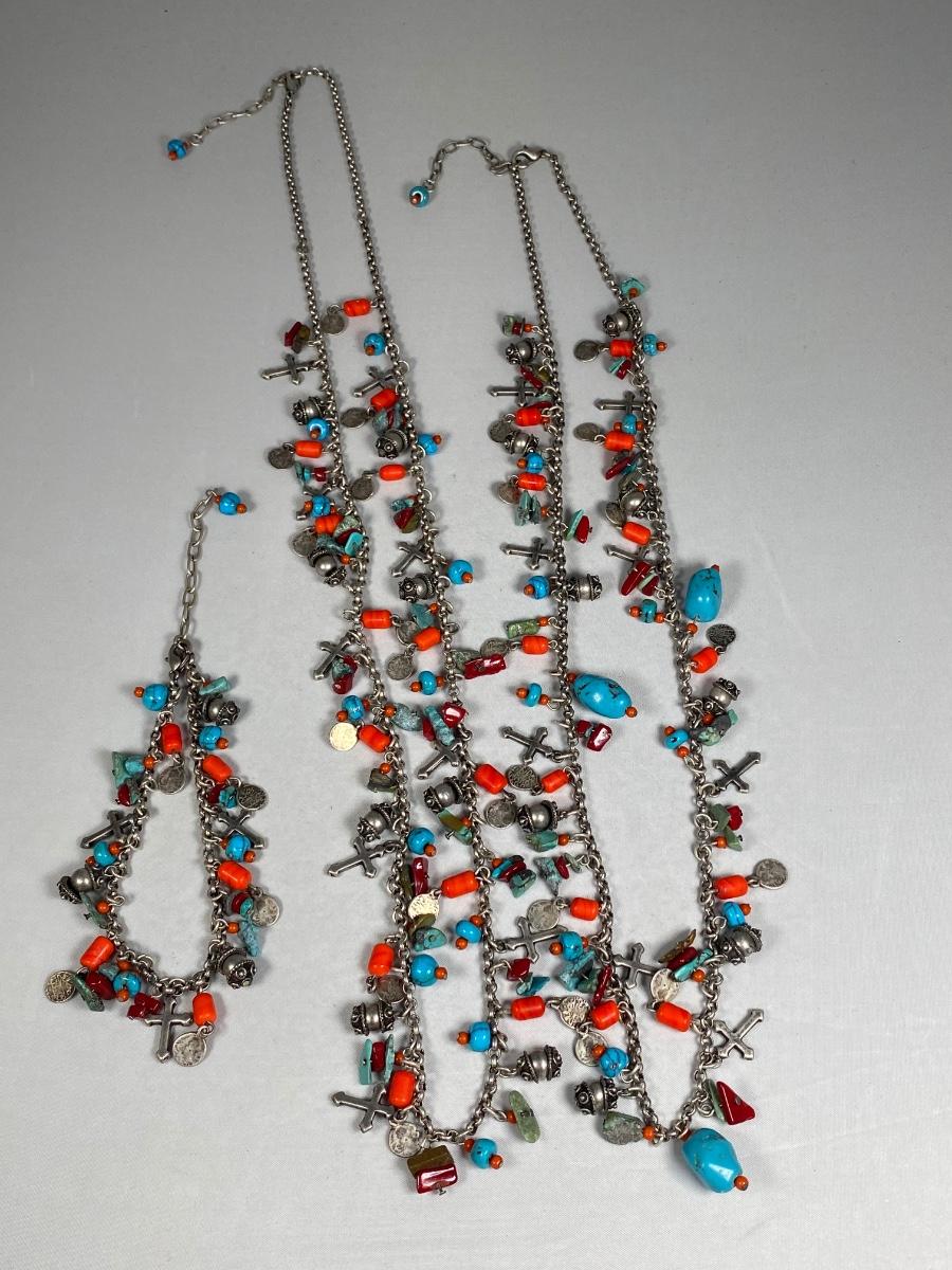 Matching set of charm necklaces and bracelet. Silver tone metals with turquoise and red coral. Necklaces are really long; one is slightly shorter than the other.