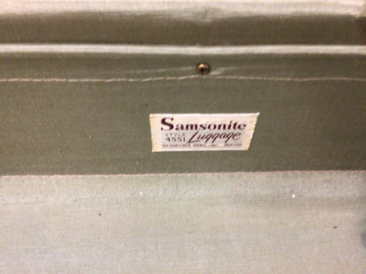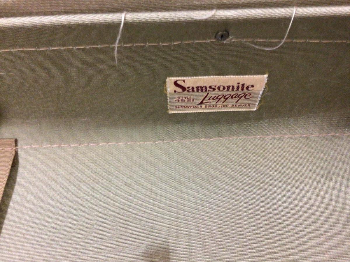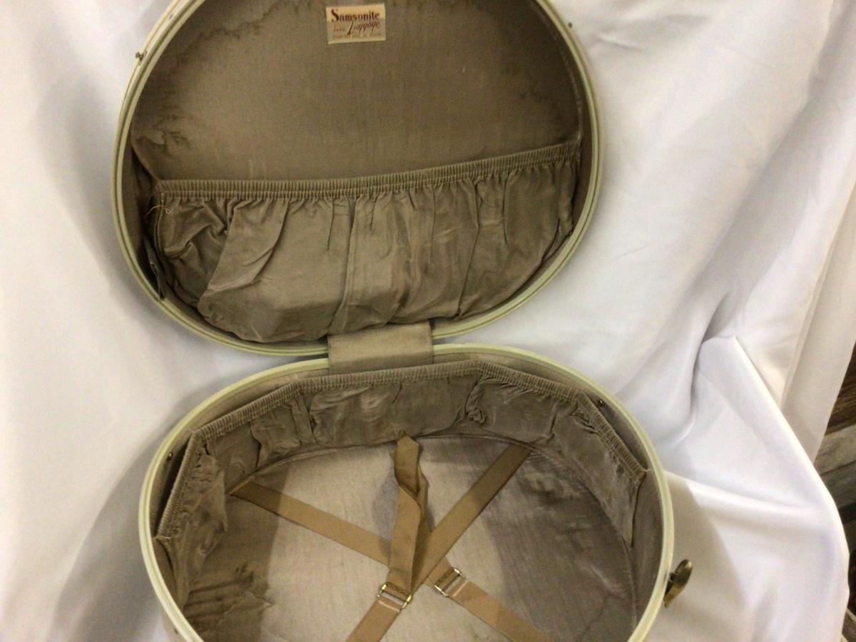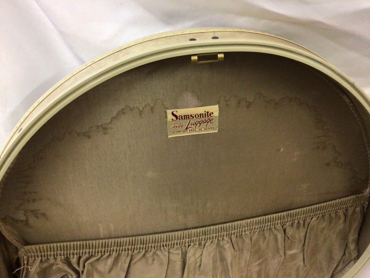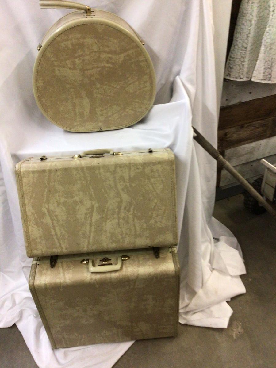 You get three piece matching Samsonite luggage. You get Large suit case, medium suit case and a hat box. All have the Samsonite lable all white marble outside pattern. There is some staining on the inside but still in good condition. Large suit case has the out side latches the tops are missing but still functional.