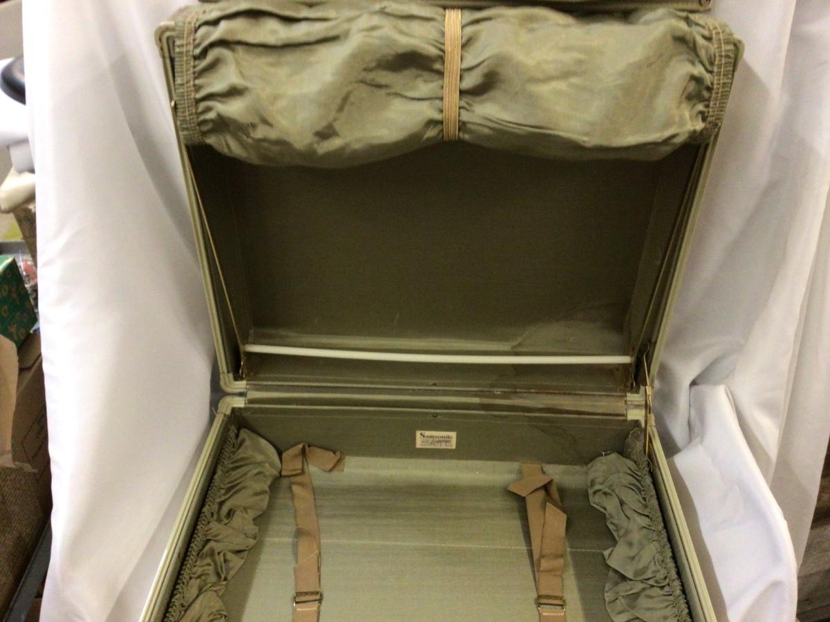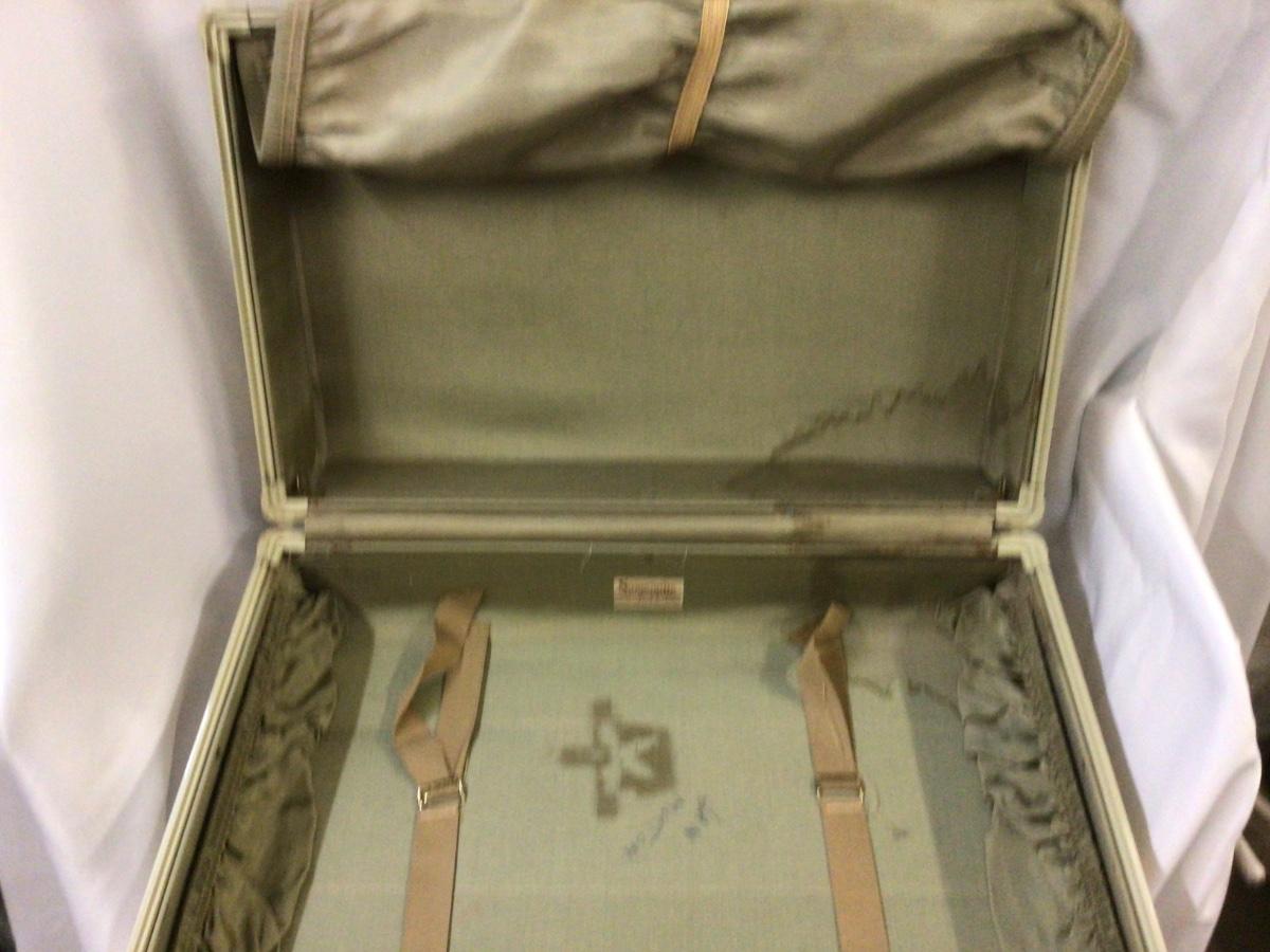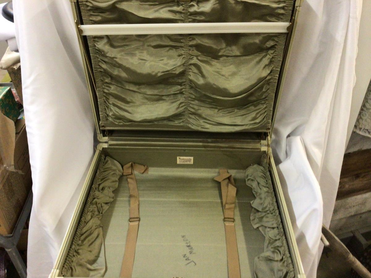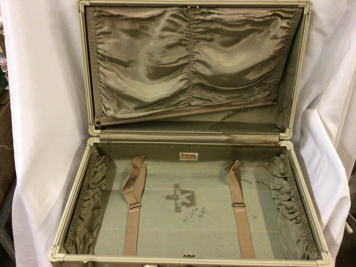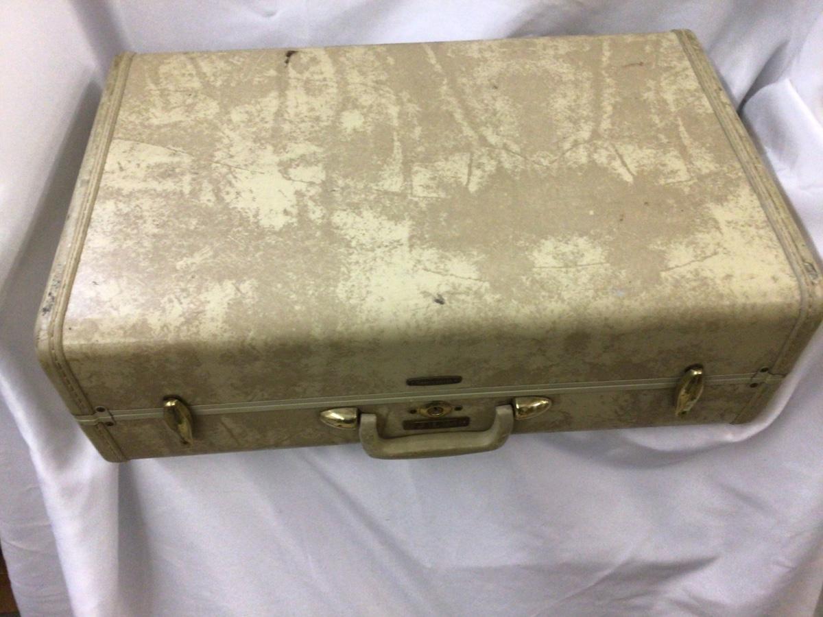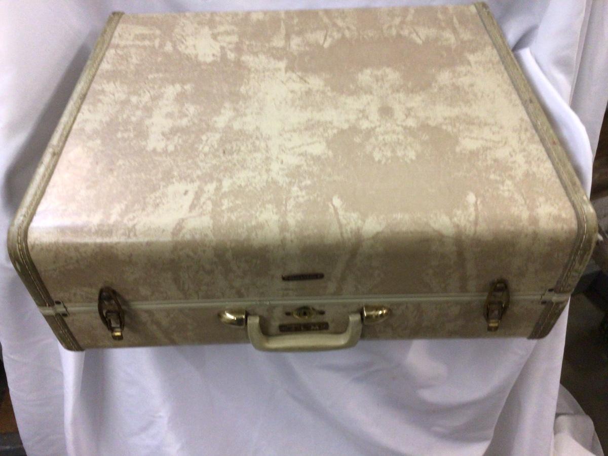 You get three piece matching Samsonite luggage. You get Large suit case, medium suit case and a hat box. All have the Samsonite lable all white marble outside pattern. There is some staining on the inside but still in good condition. Large suit case has the out side latches the tops are missing but still functional.