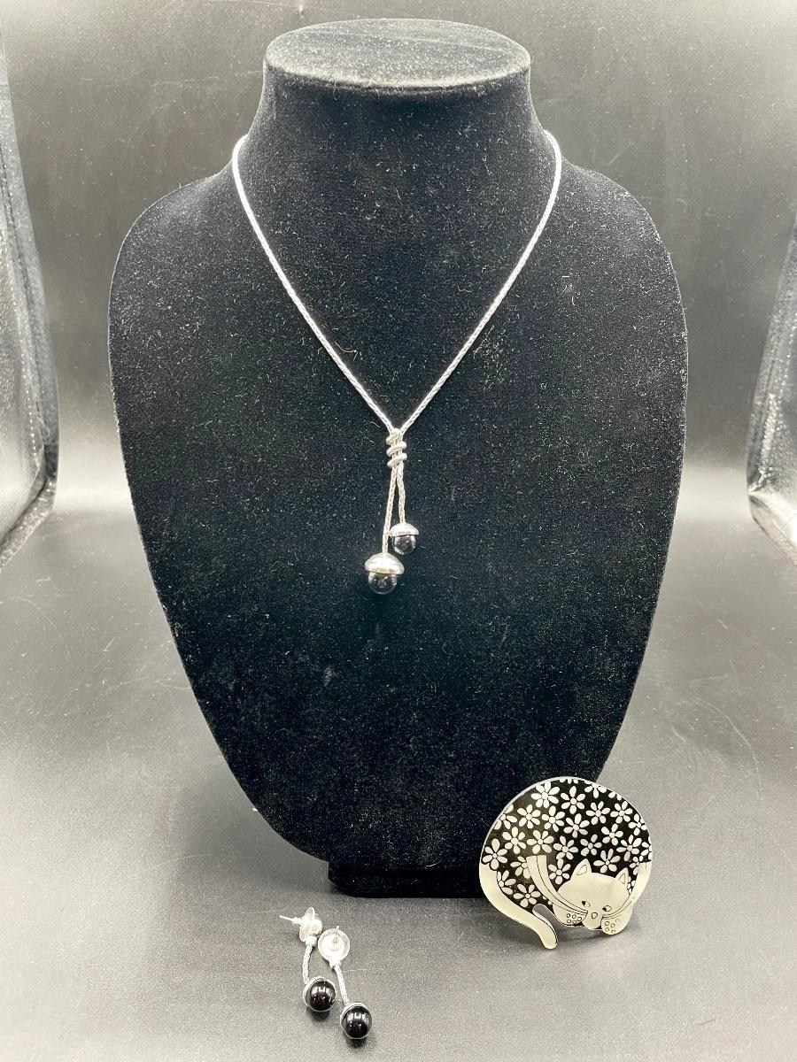 Matching Set of Black Earrings and Necklace and a Cat Pin