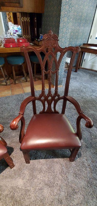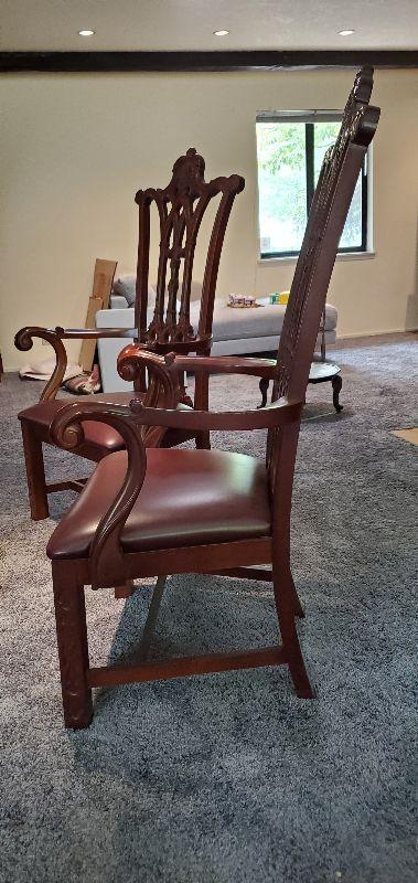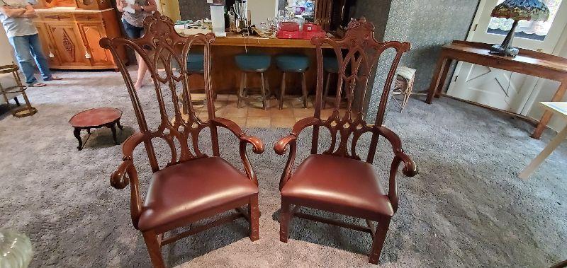 Matching pair of Chippendale style high-back chairs by Hancock. They are limited edition and are numbered #26 and #27 of 500. Chairs are made of cherry wood with leather seats and measure 30" wide, 24" deep, and 53" tall.