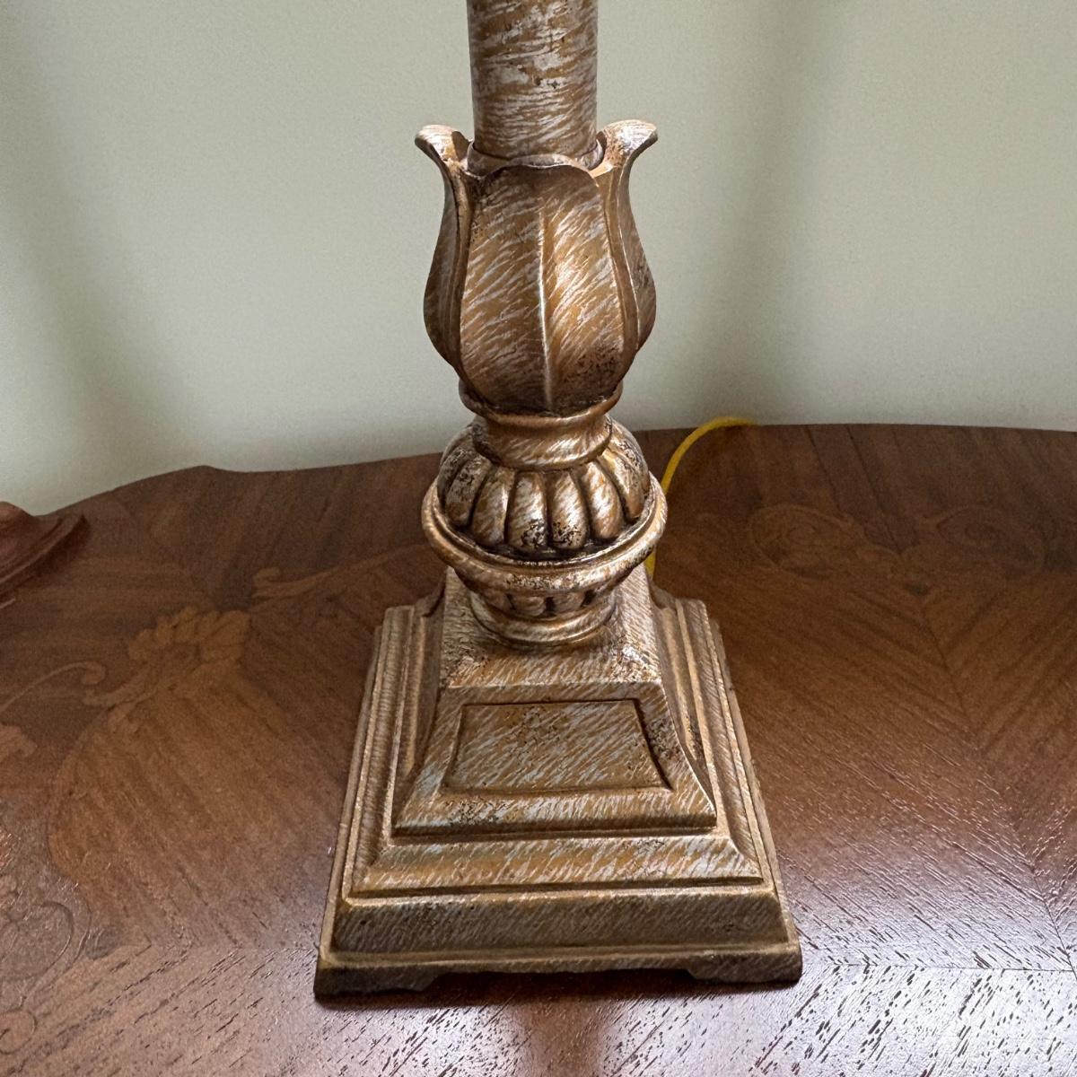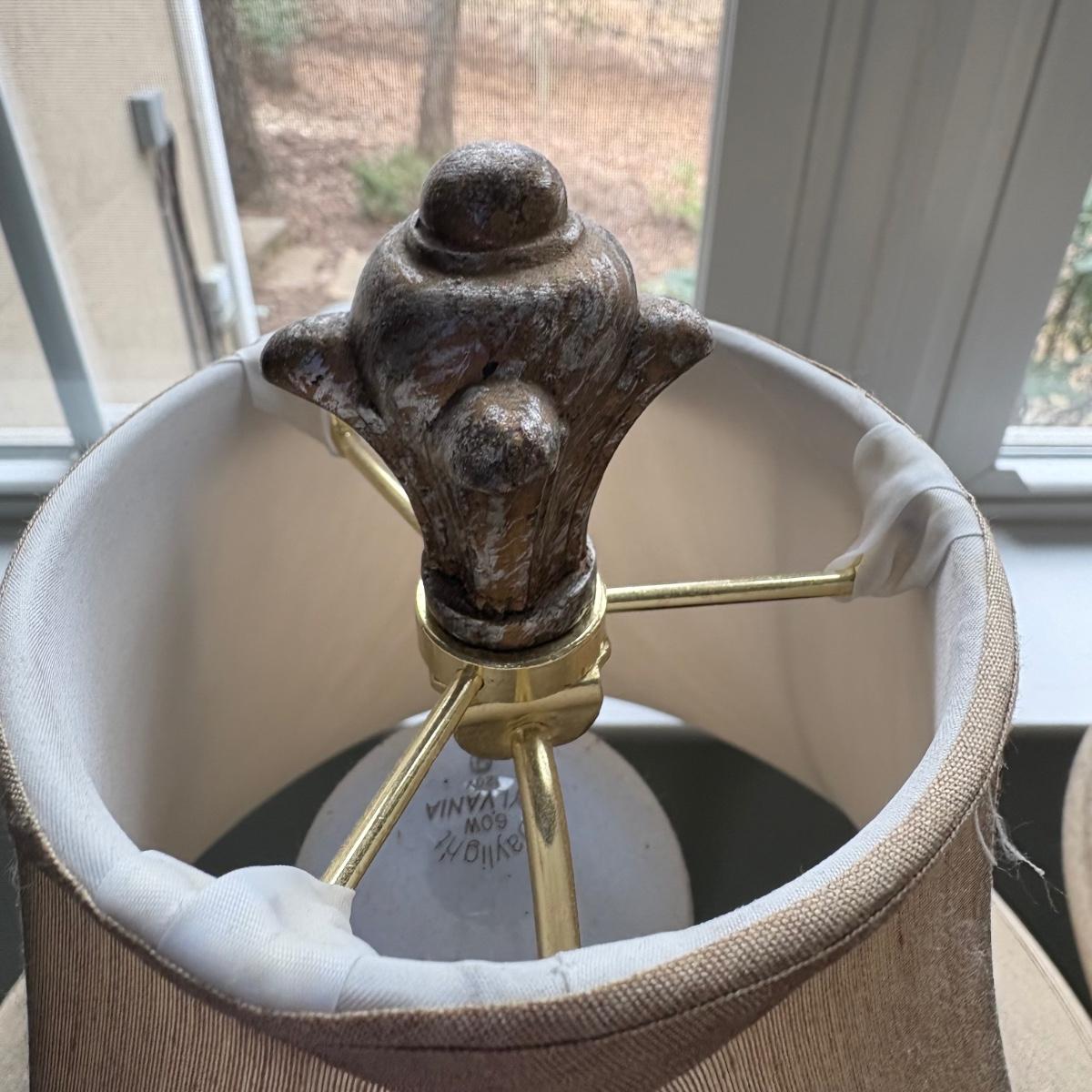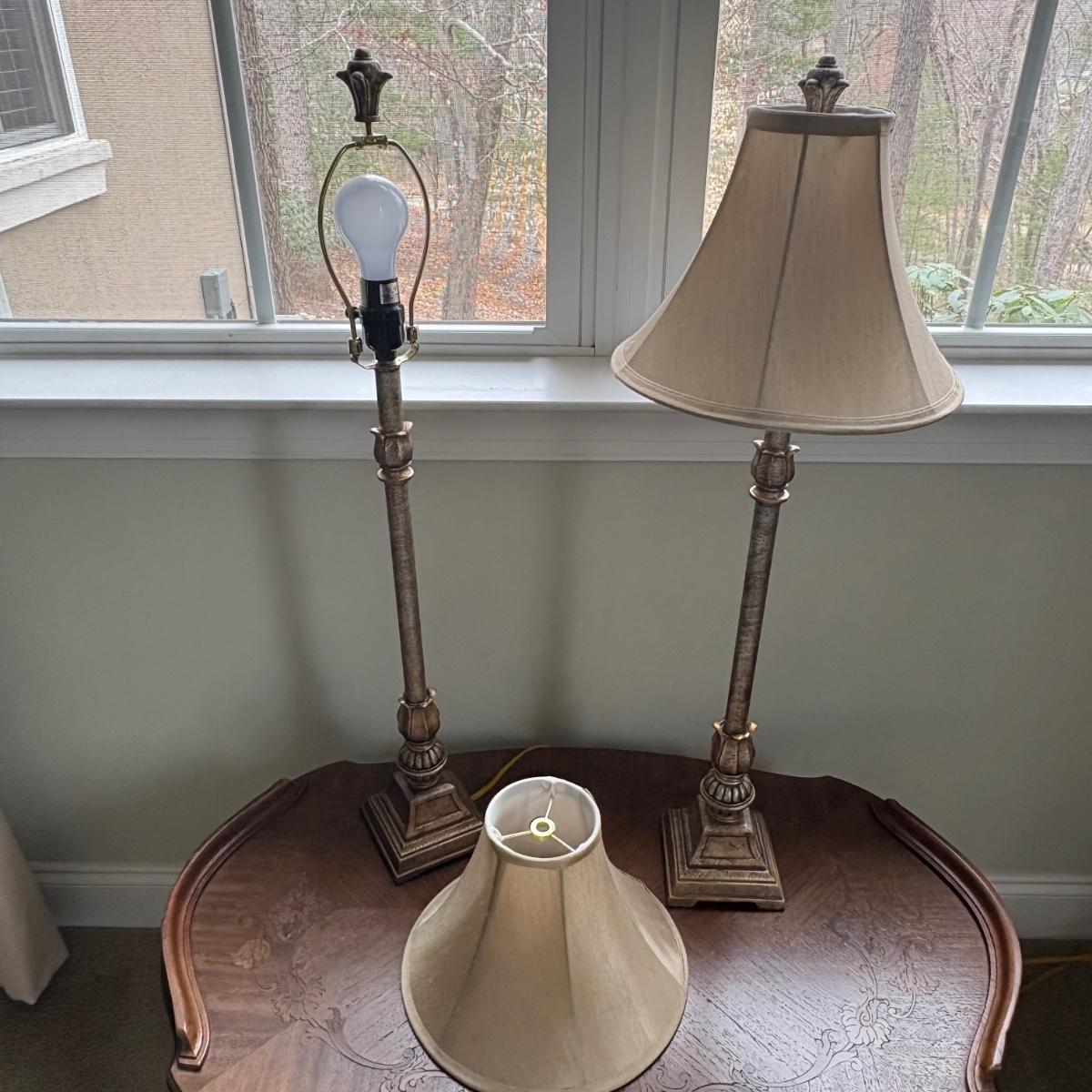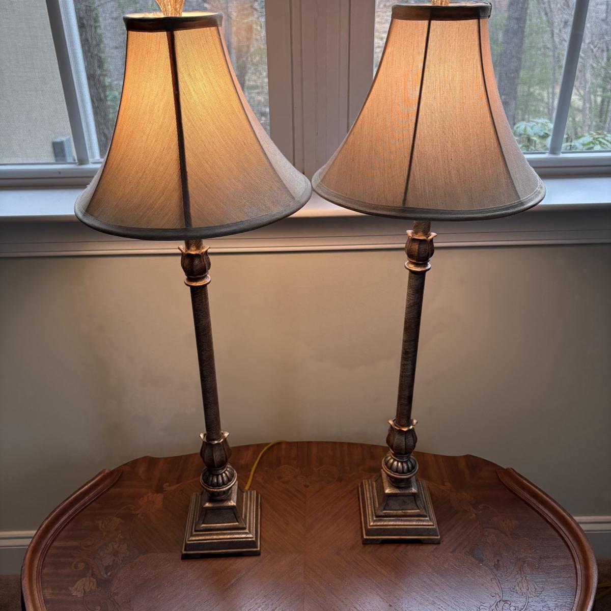 Brushed/distressed metal finish with a satiny cloth lampshade. Both powered on when plugged in.