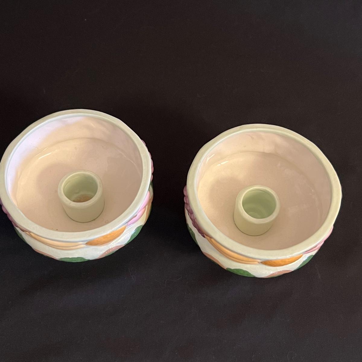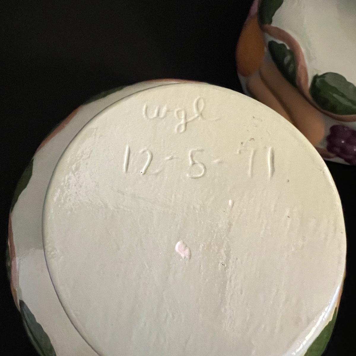 This matching set of 3 includes a large bowl that measures 9.5” D x 6.5” tall. The 2 smaller bowls appear to be candle holders. All pieces are in very good condition with no chips or cracks and all are footed. Marking on bottom reads WGL 12-5-71.