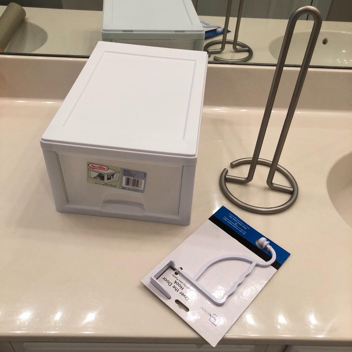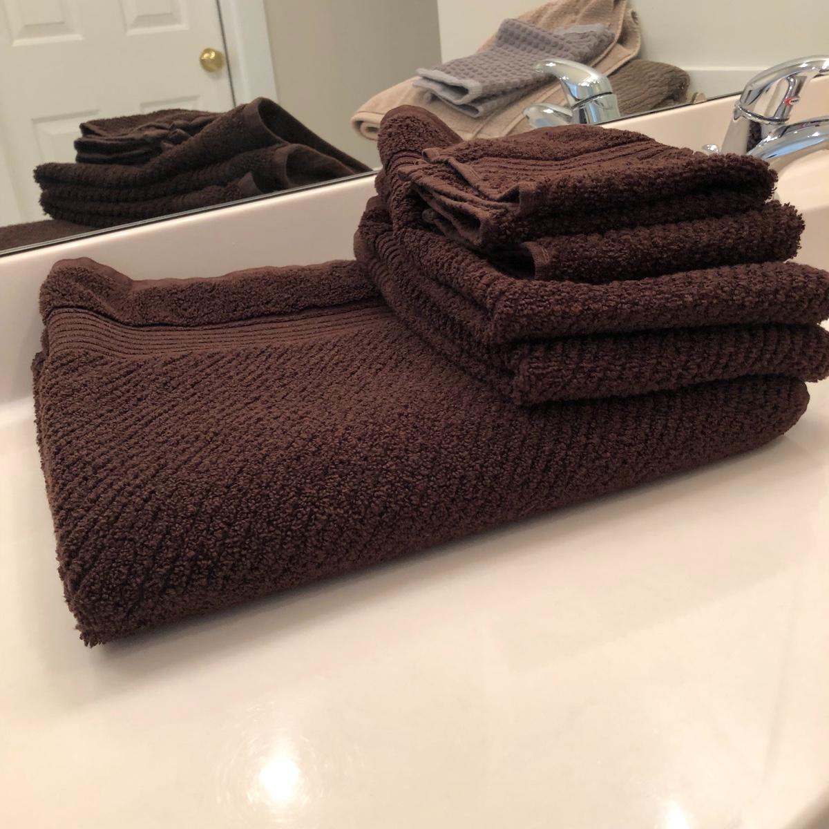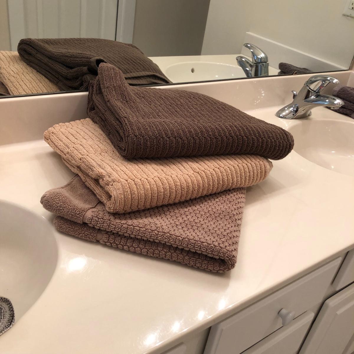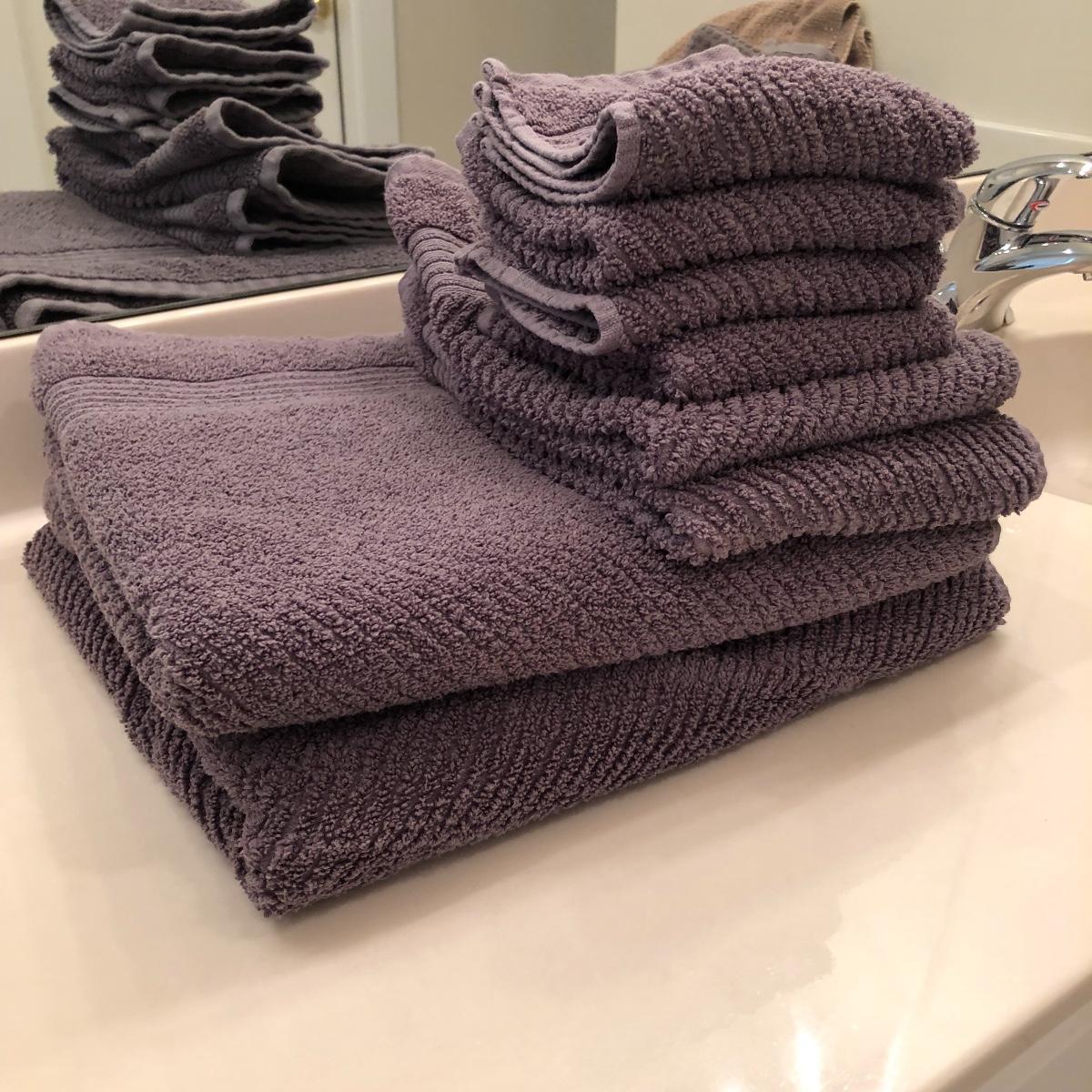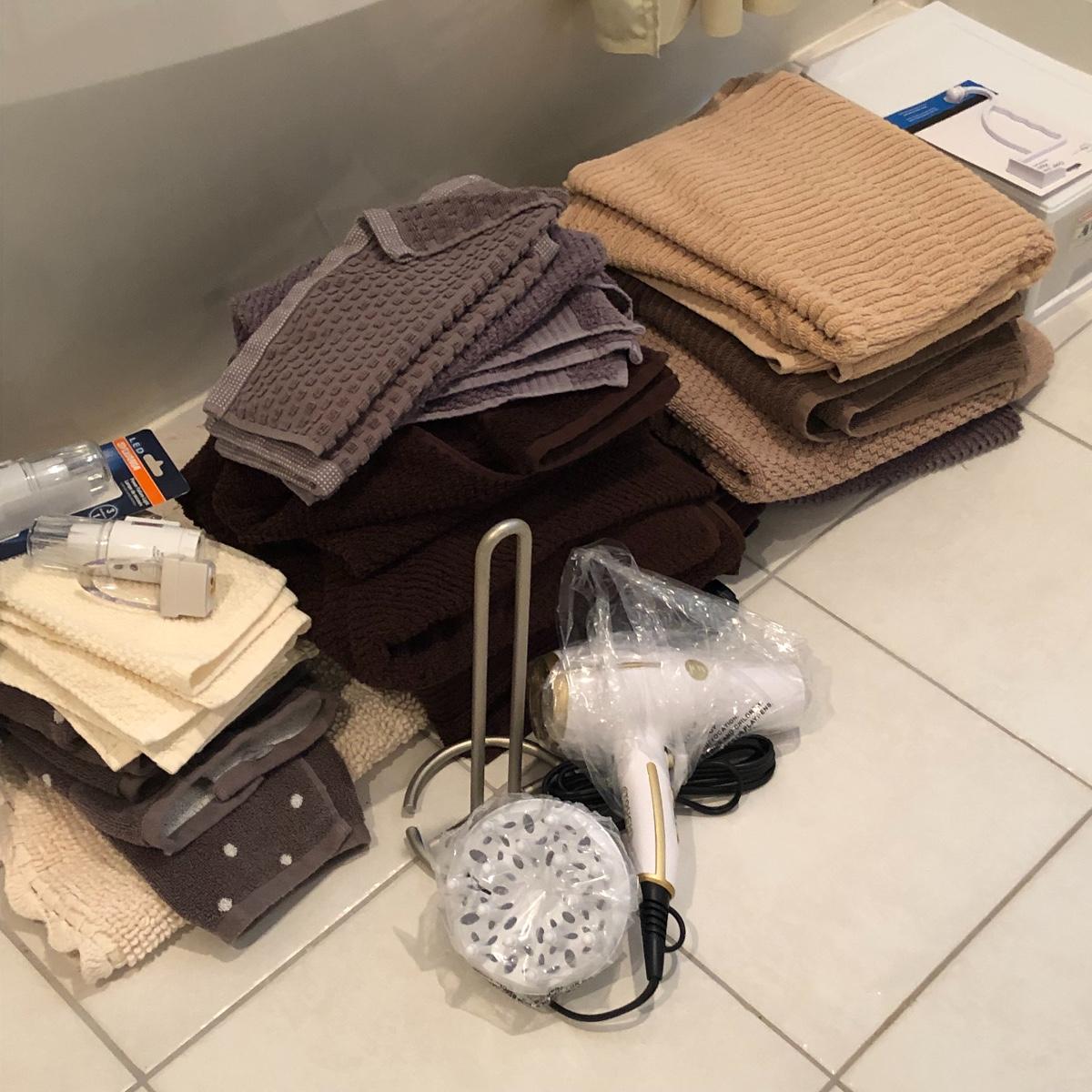 This lot has a great assortment of towels from bath sized to hand sized, a good portion of them are matching sets (see images). Also included is a Joy hairdryer with diffuser that’s still in its box, a small plastic shelf container, metal bath tissue holder and a couple of bath mats.