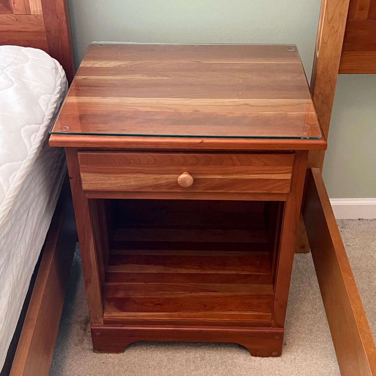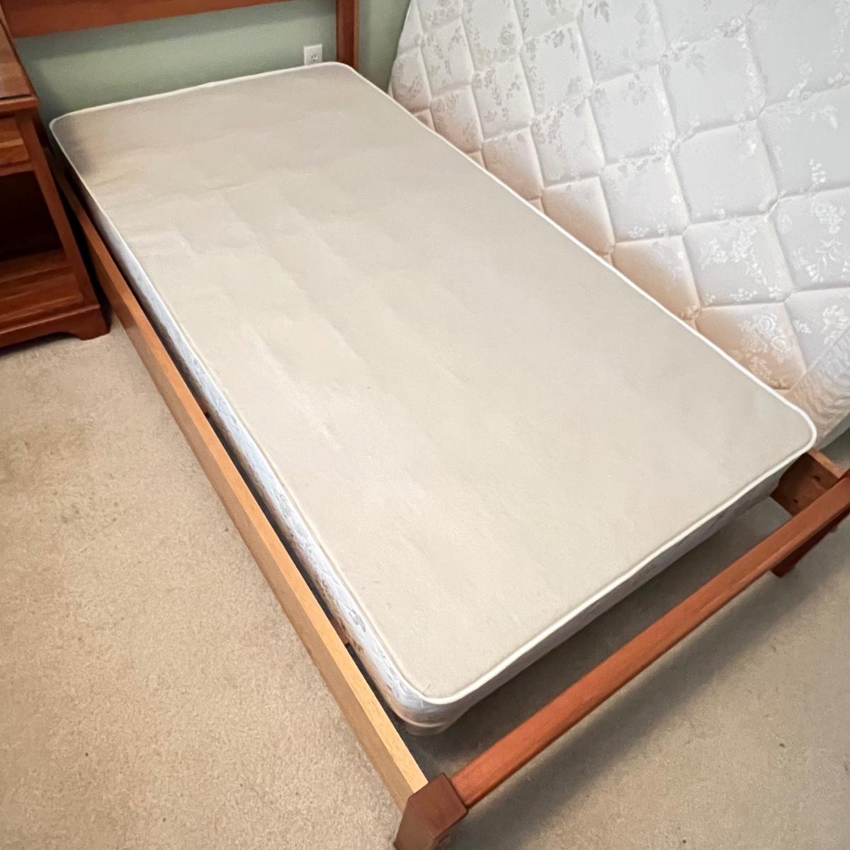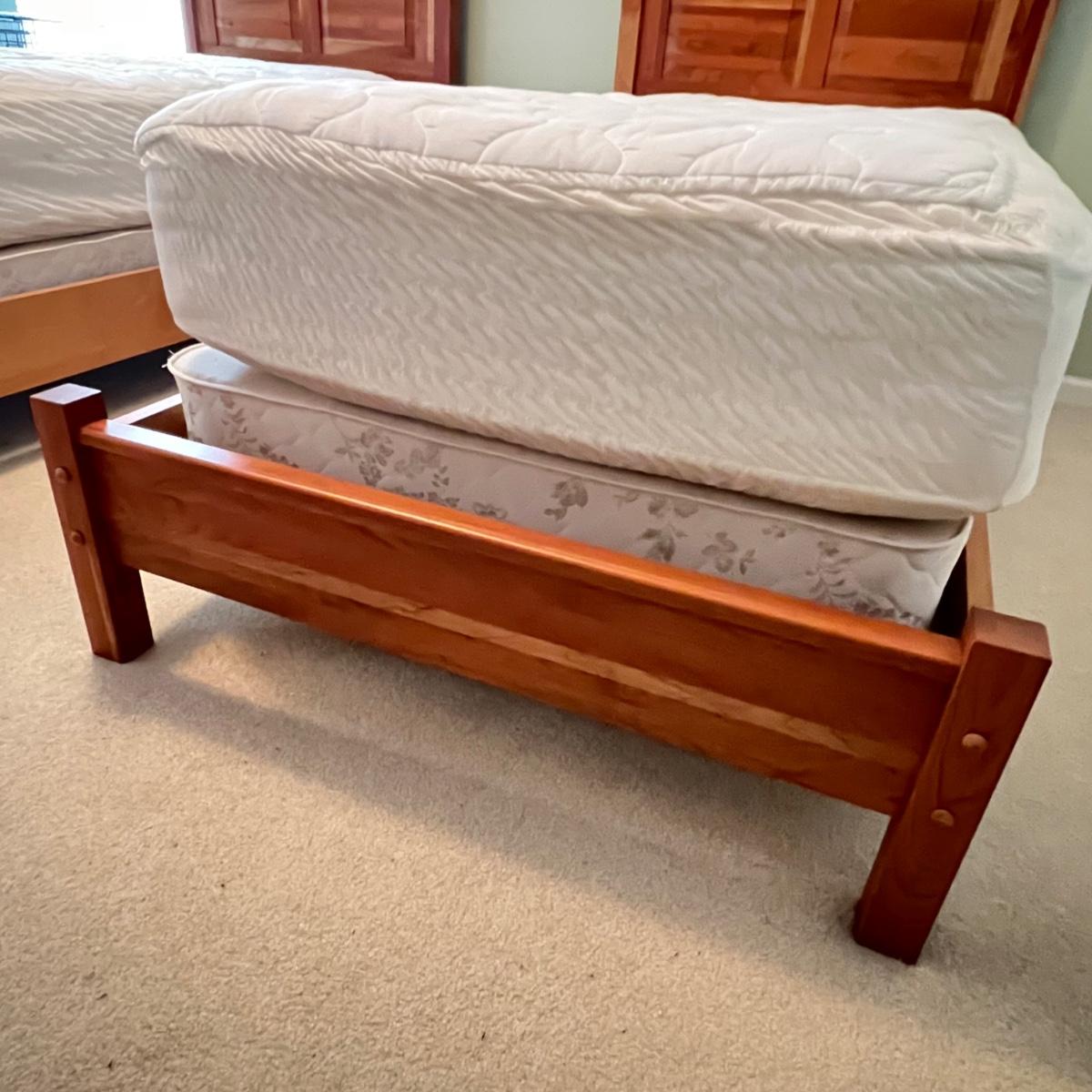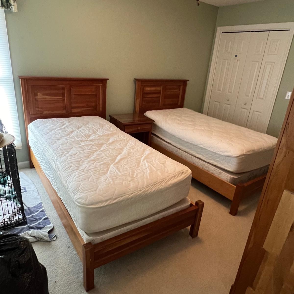 A pair of matching wooden twin beds. The headboards measure 44” x 4” x 47”H, from headboard to foot of bed is 80” long. Mattresses with pads and box springs are available to the winning bidder if desired. A matching end table has one dovetailed drawer with an open cabinet beneath it and the top has a removable glass protective top; measures 21” x 18” x 26”H.